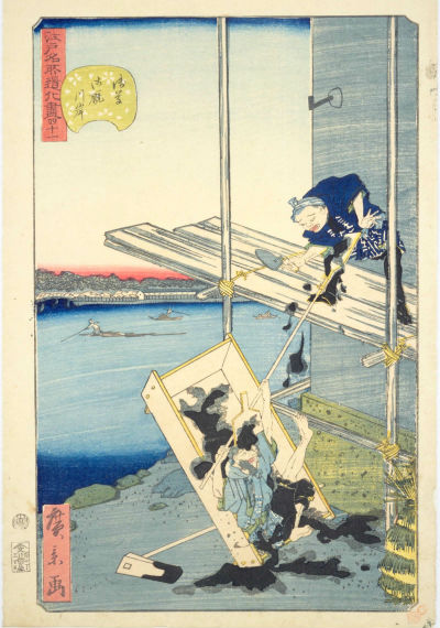 - 歌川広景が「江戸名所道戯尽」の中で足場を組んで作業をする左官の姿を描いた絵を発表するおよそ 25 年前に、葛飾北斎が「富嶽百景 」の中でほとんど同じ構図の絵を残している。
