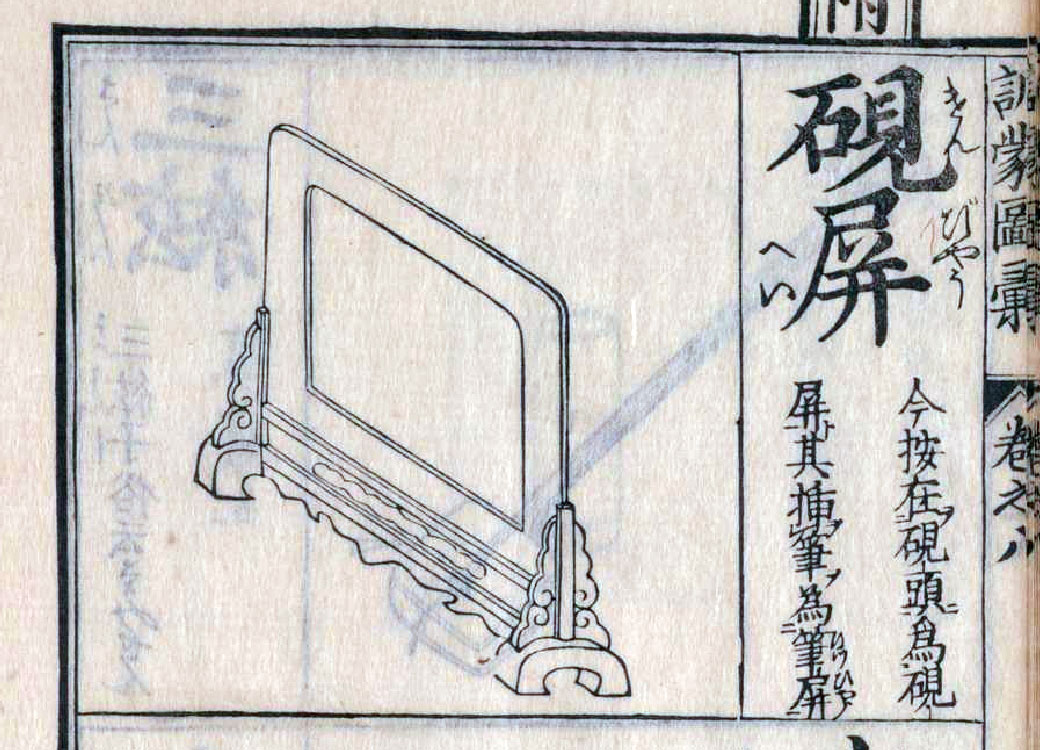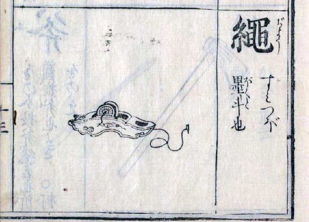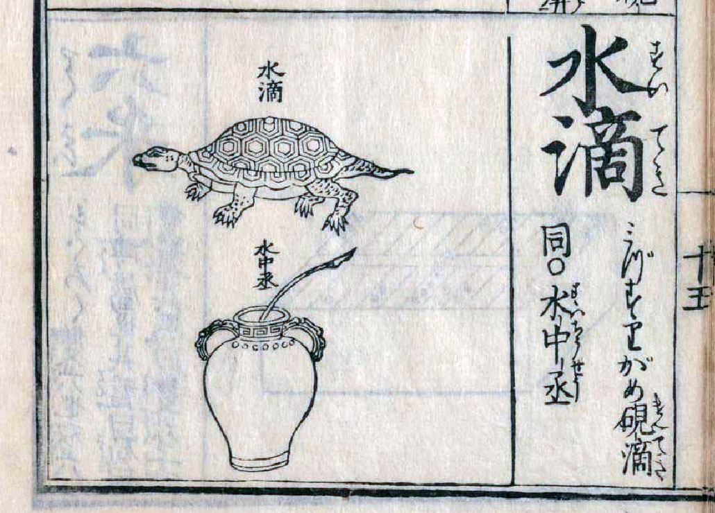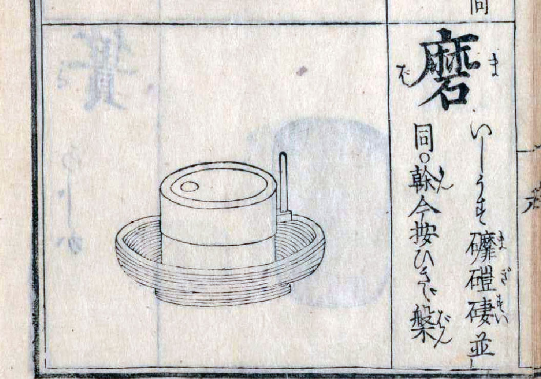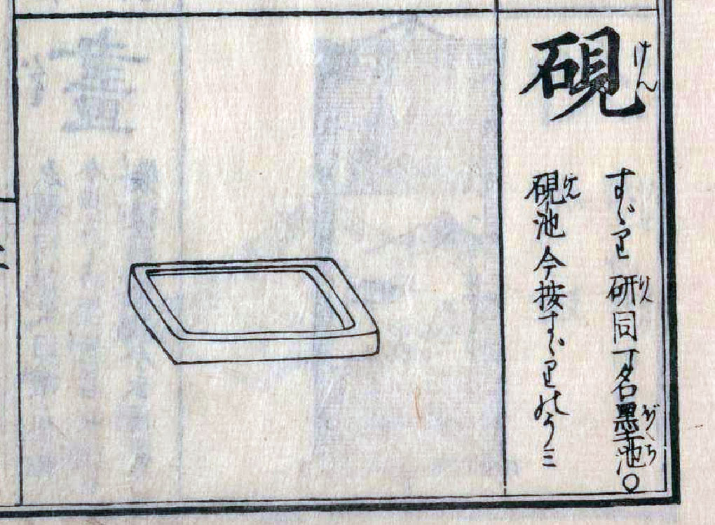 すずり。研、同じ。一名、墨池。硯池、今按ずるに、すずりのうみ。