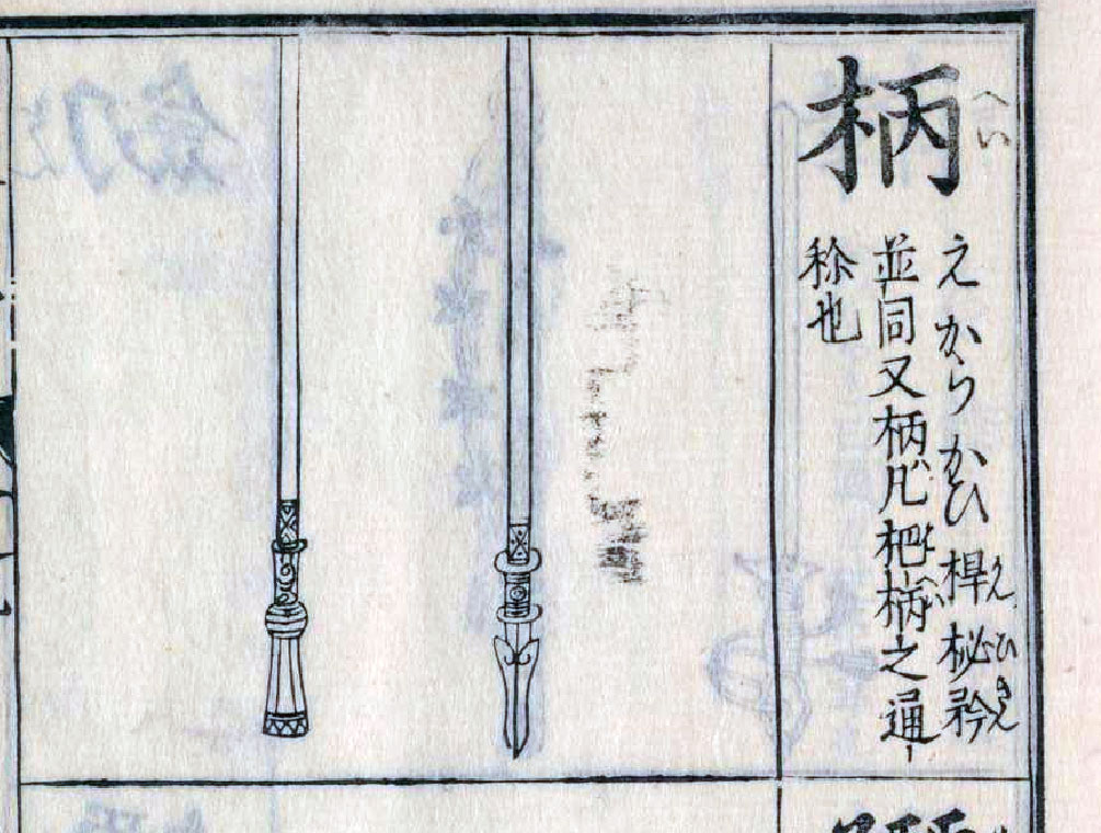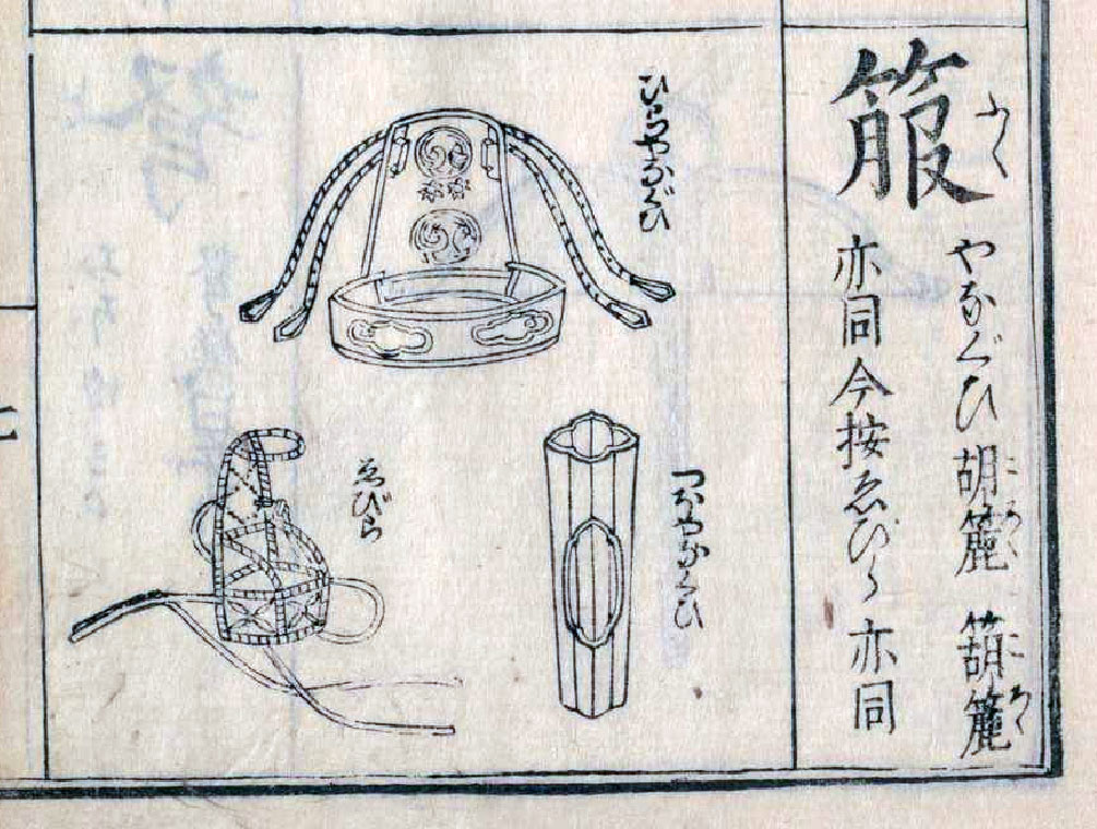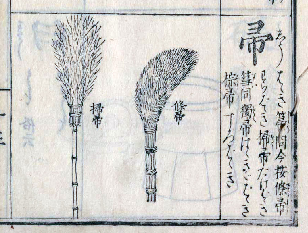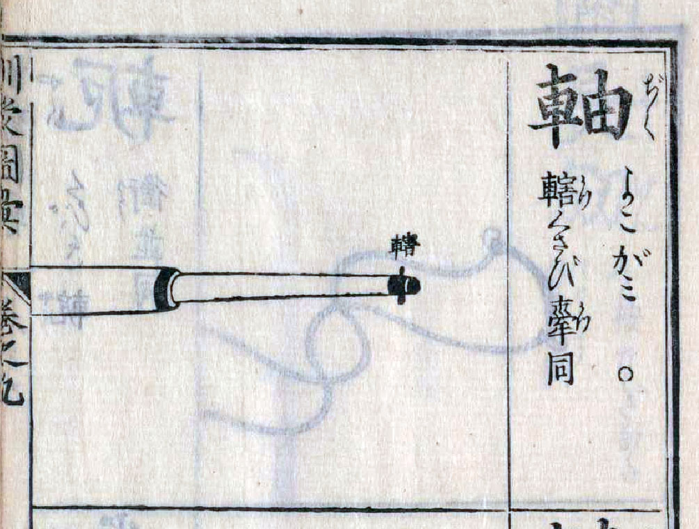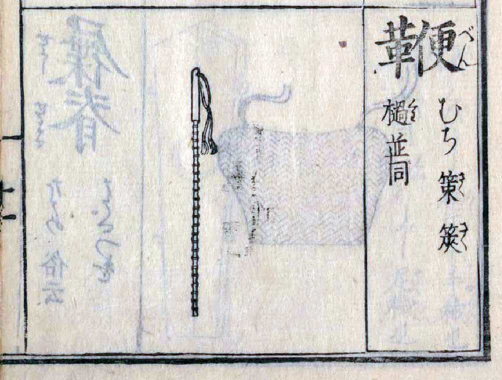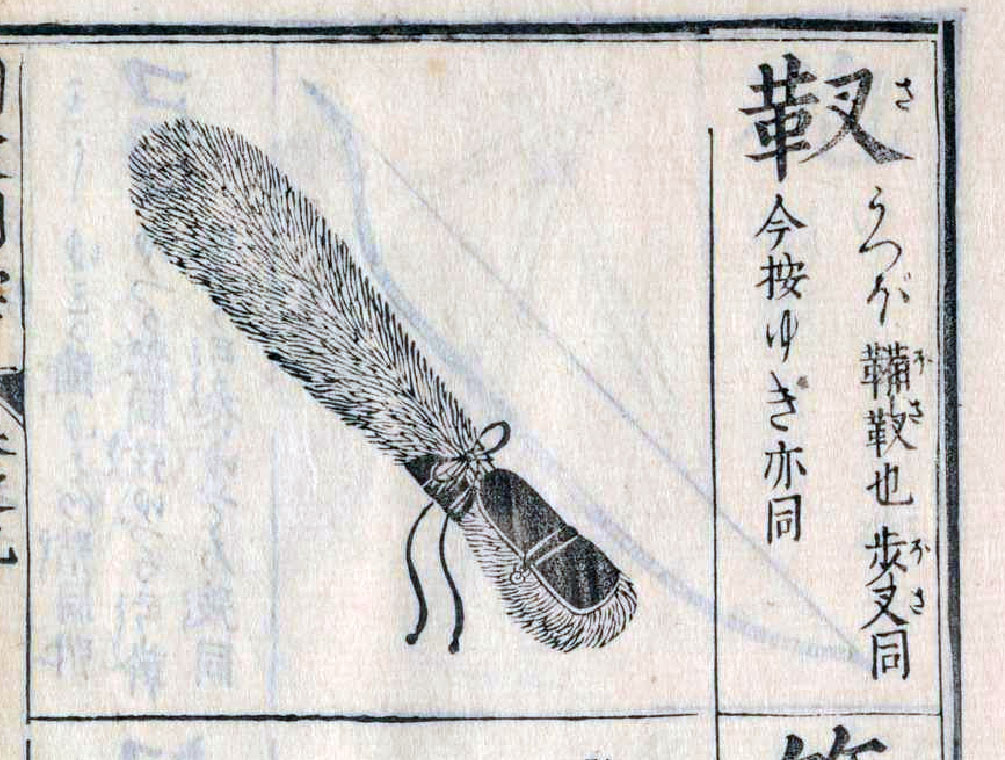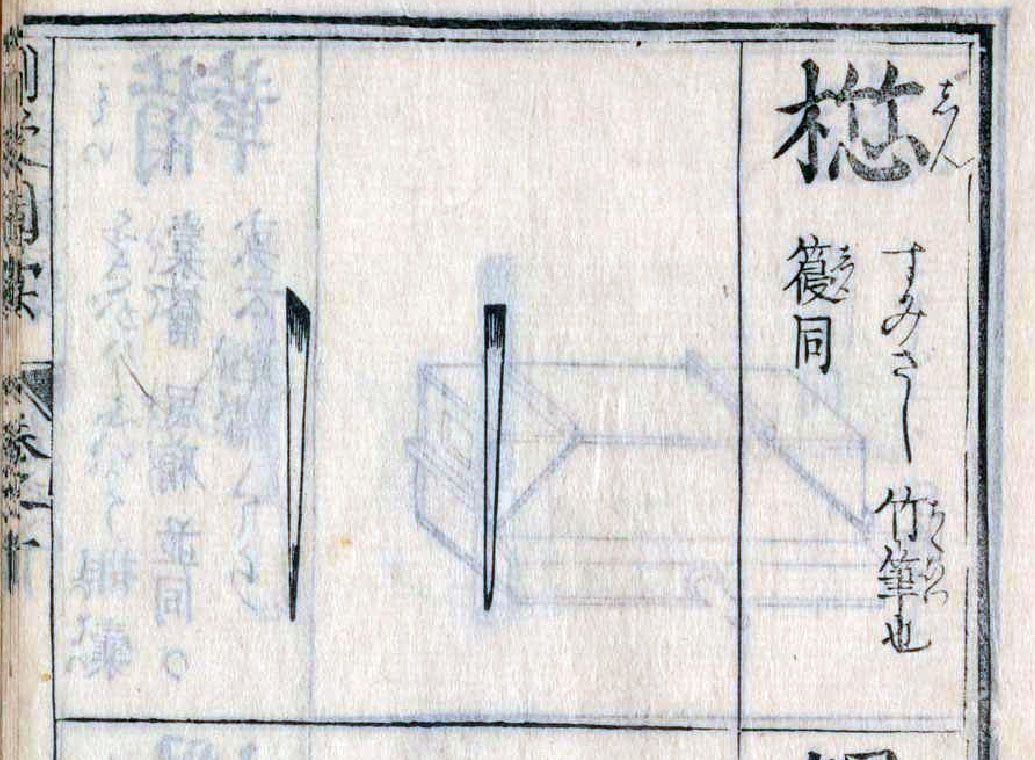 ふで、笔、同じ。筆。管。ふでのつか。筆帽。今按ずるに、ふでのさや、筆錔同じ。筆筒、今按ずるに、ふでたて。
