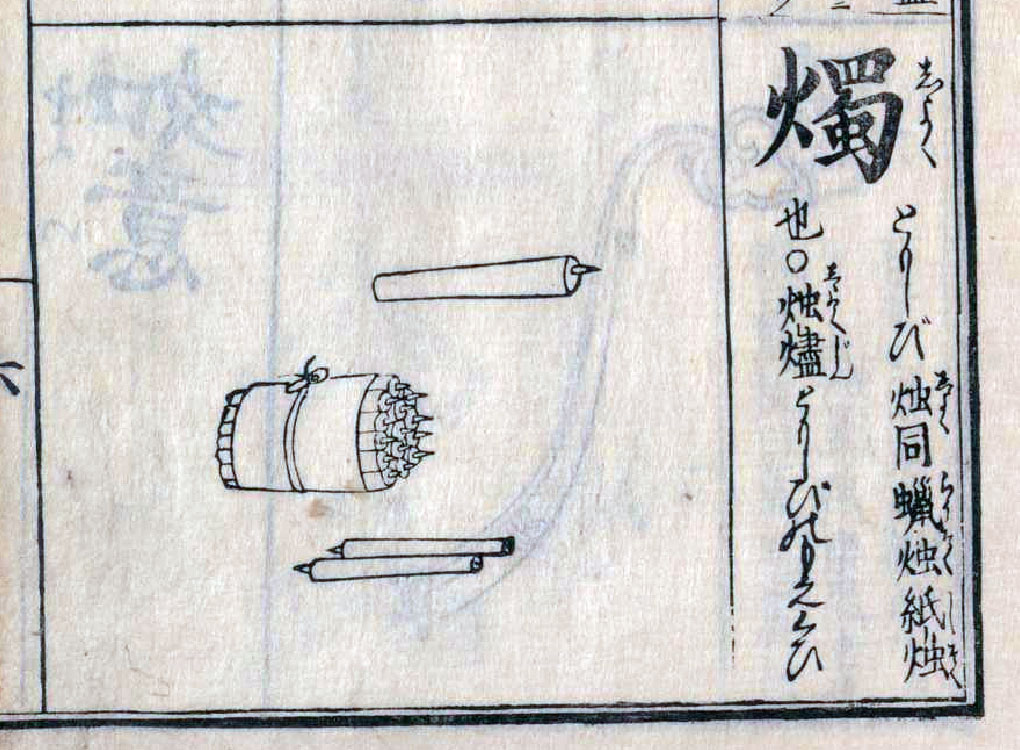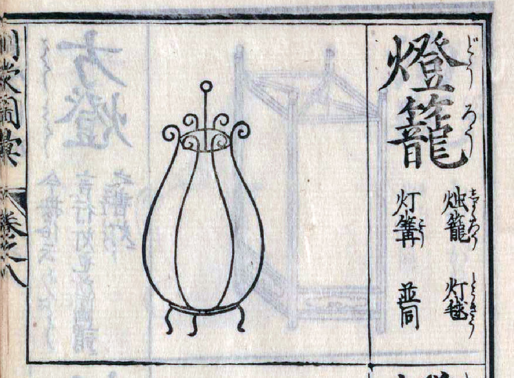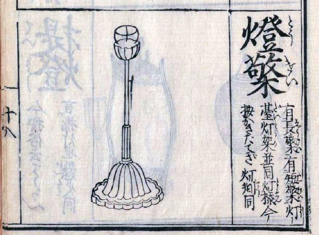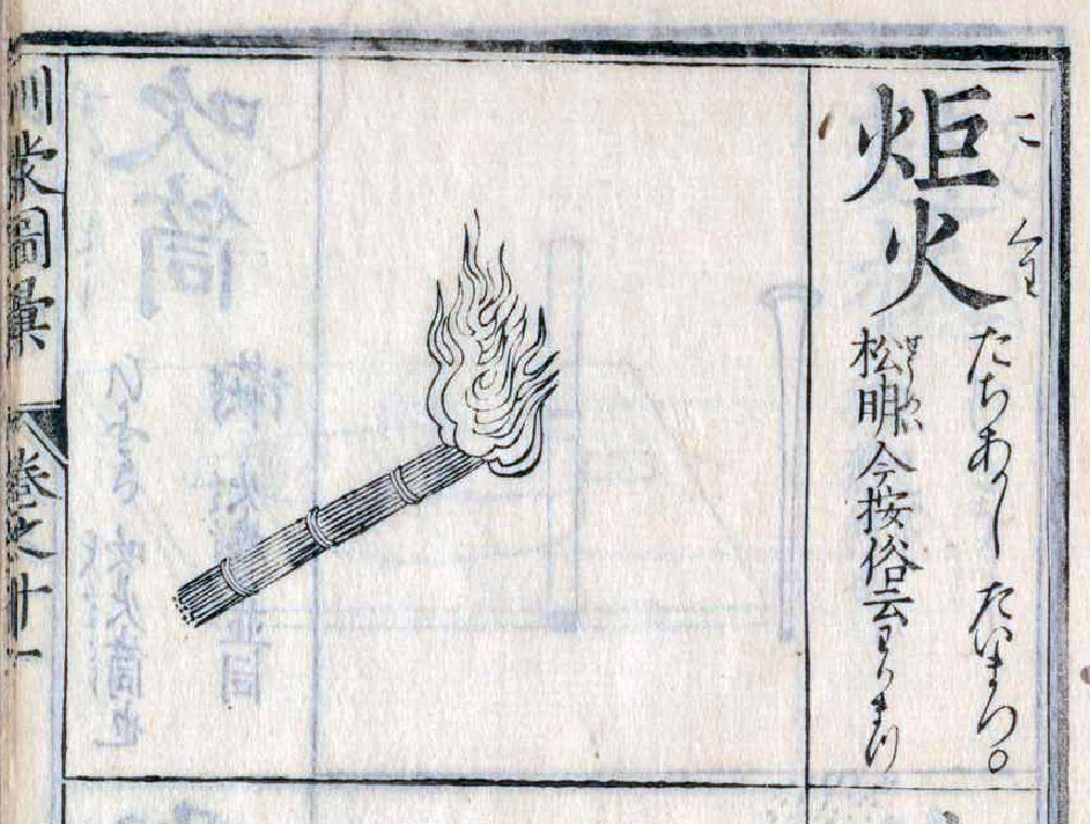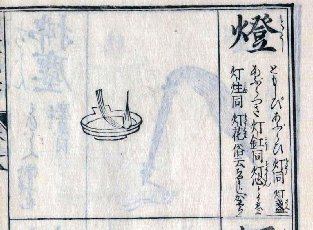 ともしび。あぶらひ。灯、同じ。灯盃、あぶらつき、灯釭、同じ。灯心、とうしみ。灯炷、同じ。灯花、俗云、ちょうじがしら。