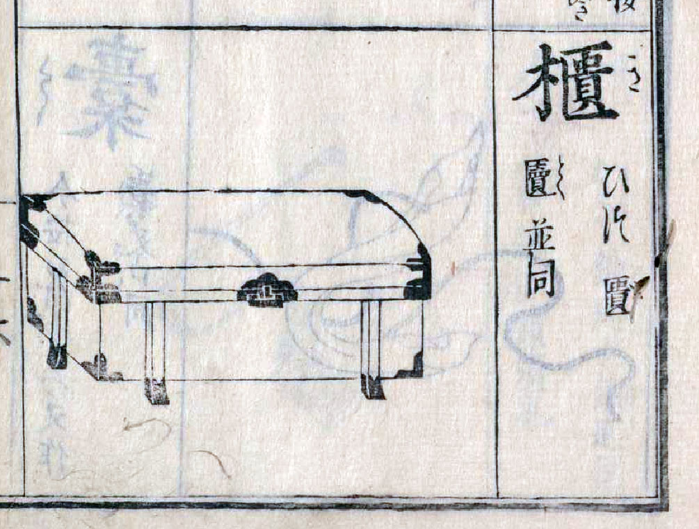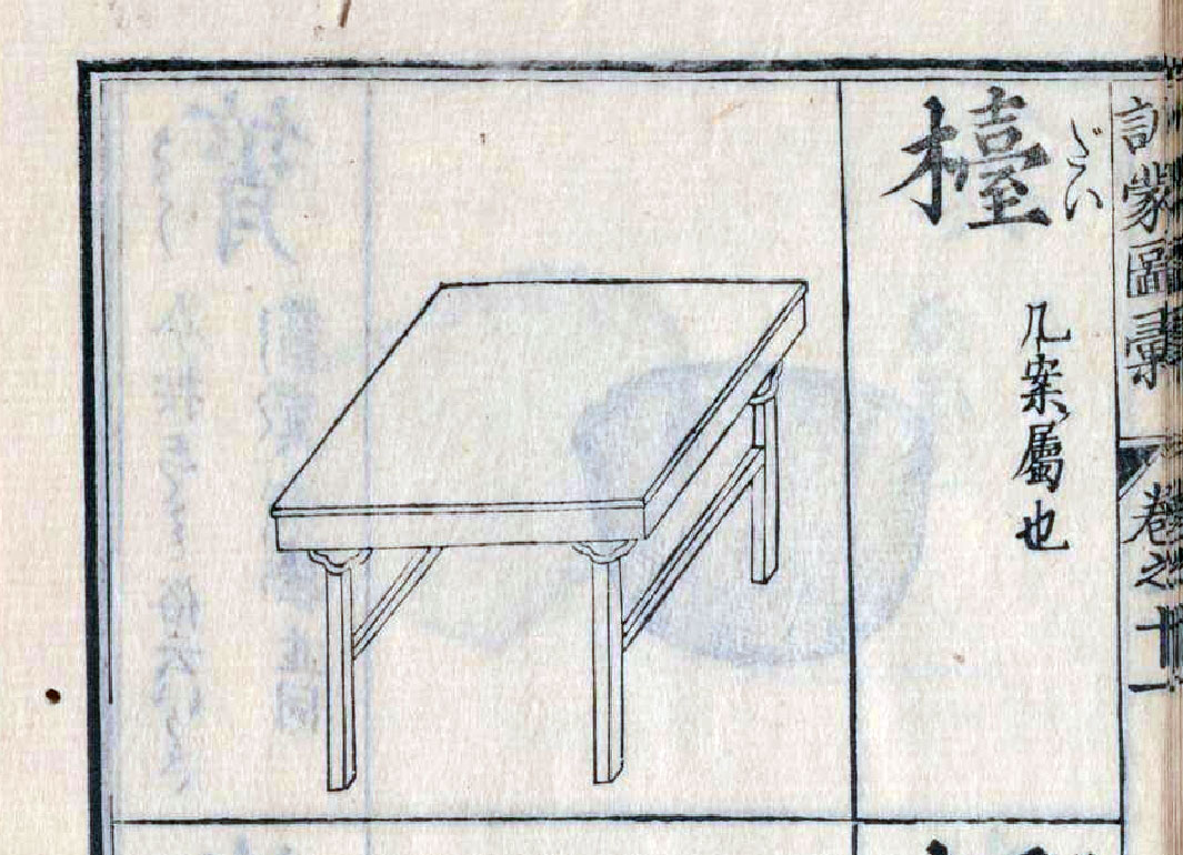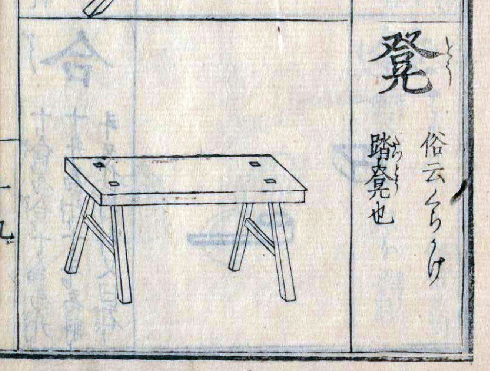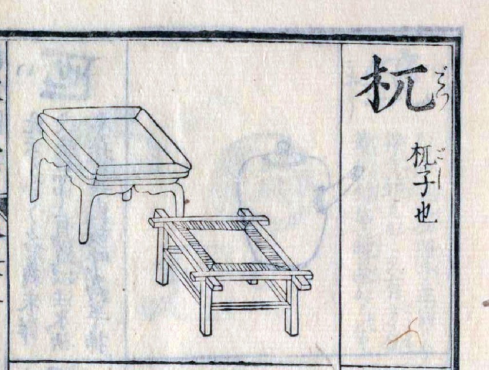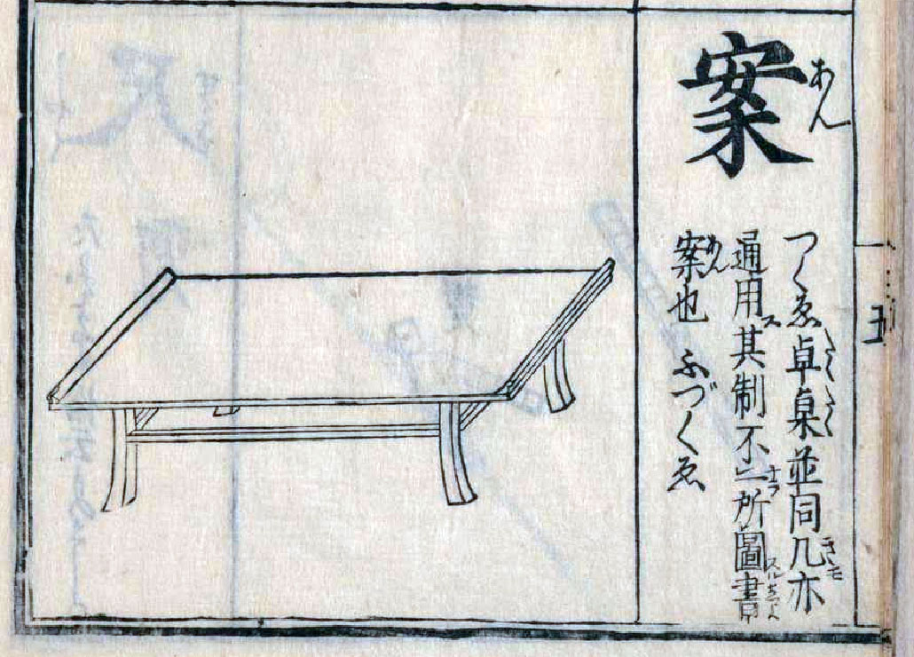 つくえ。卓、桌、並びに同じ。几も亦通用す。其制一ならず図する所書案也。ふづくえ。