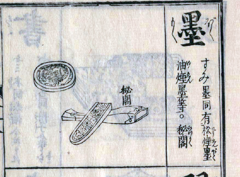 すみ。墨、同じ。松煙墨、油煙墨等有り。秘閣。