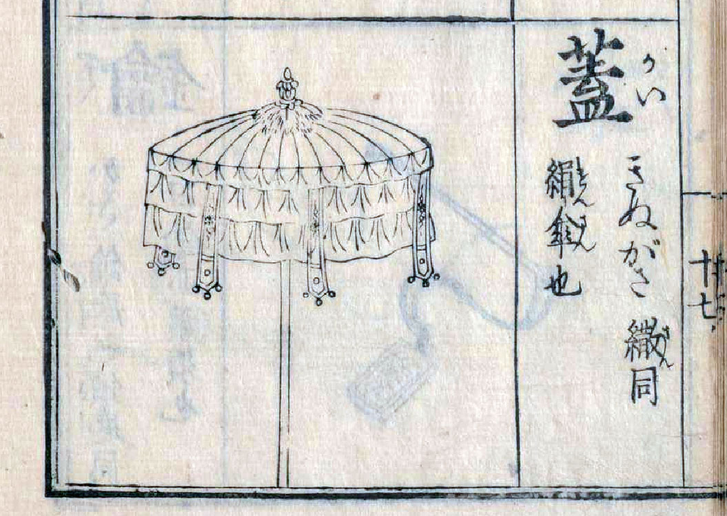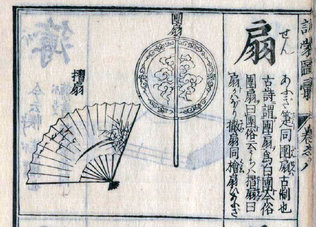 おうぎ。箑、同じ。団扇は古制也。古詩に団扇を謂て白団と為す。今俗、団扇を団と曰う。俗に云う、うちわ摺扇を扇と曰う。かわぼり撒扇、同じ。檜扇、ひあふぎ。団扇。摺扇。
