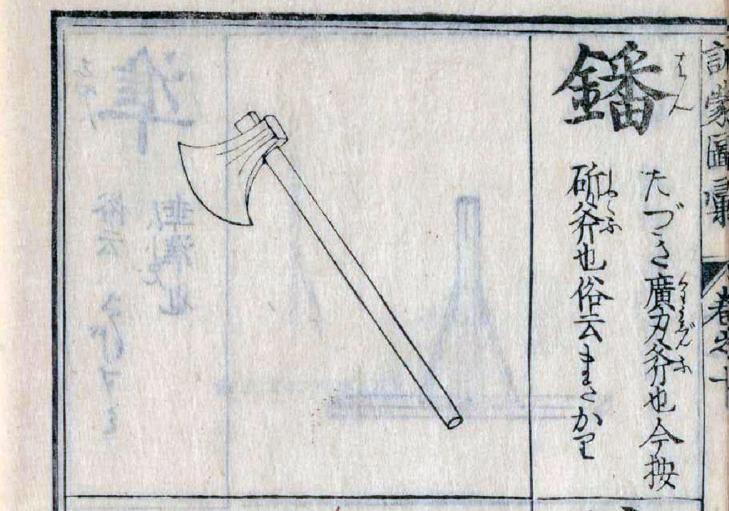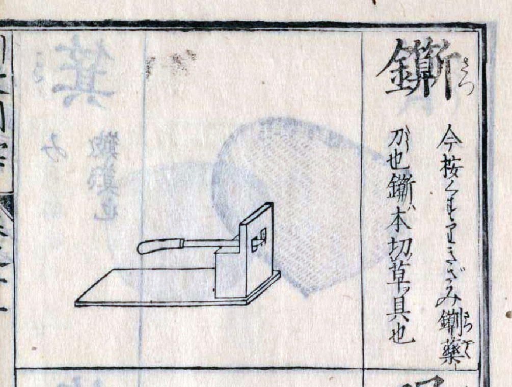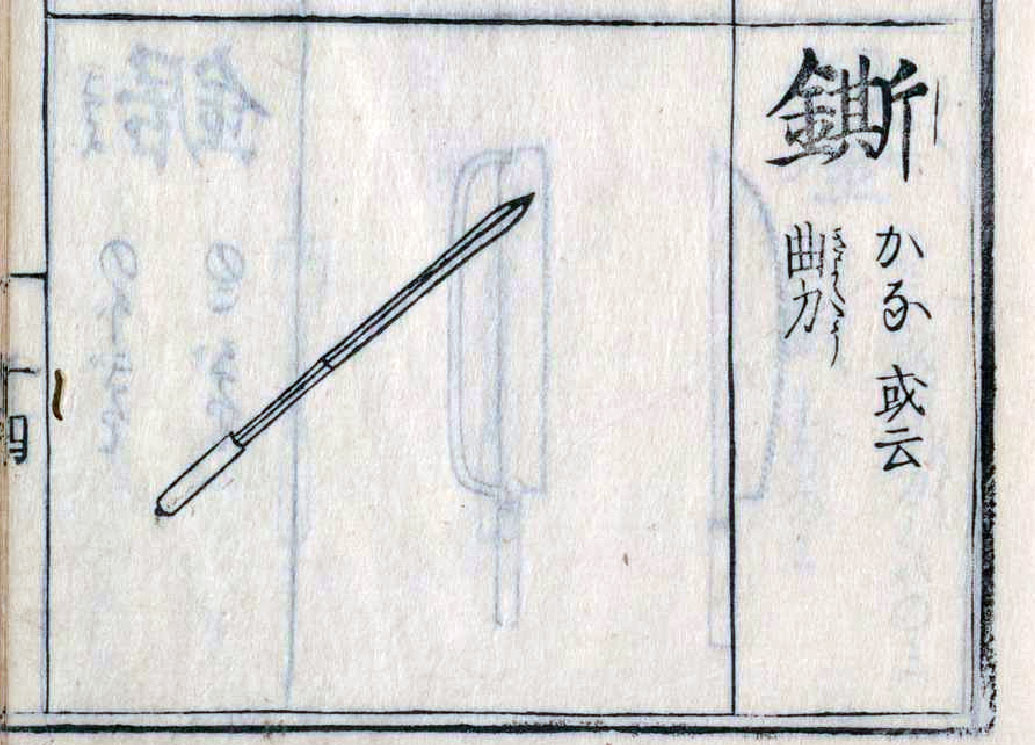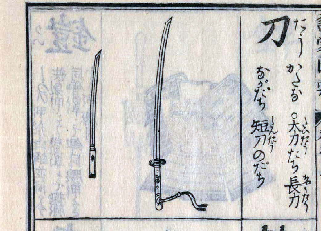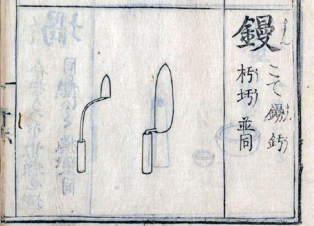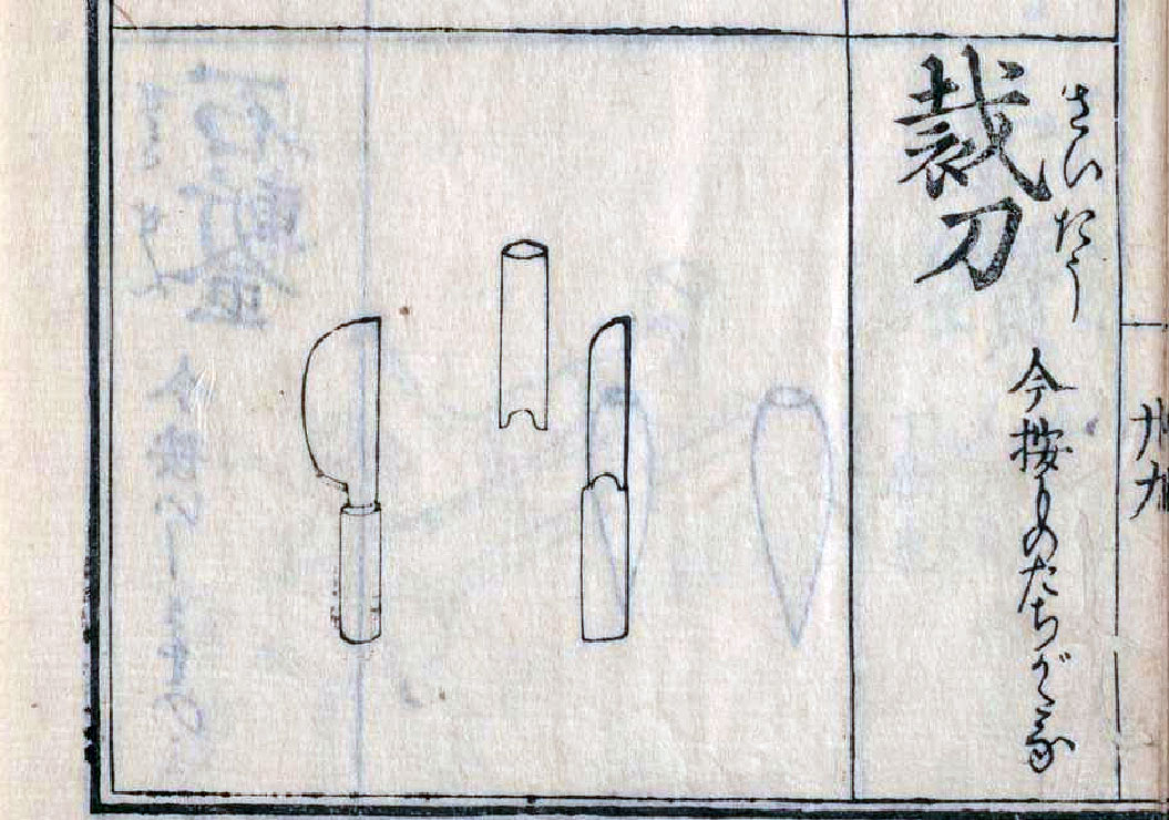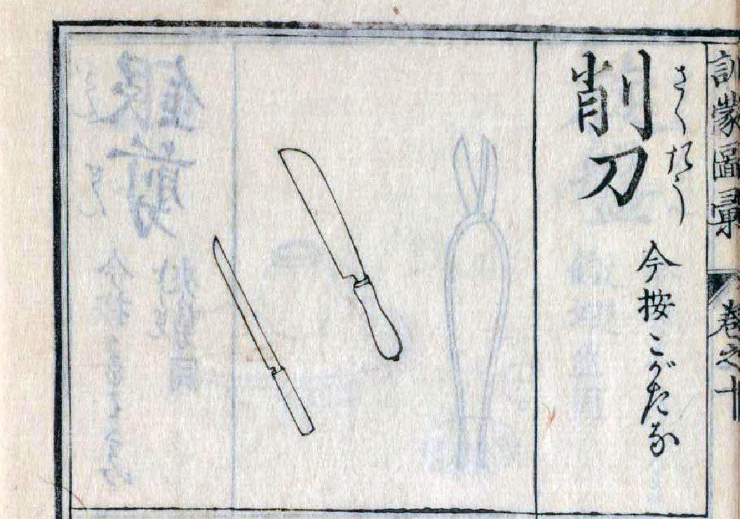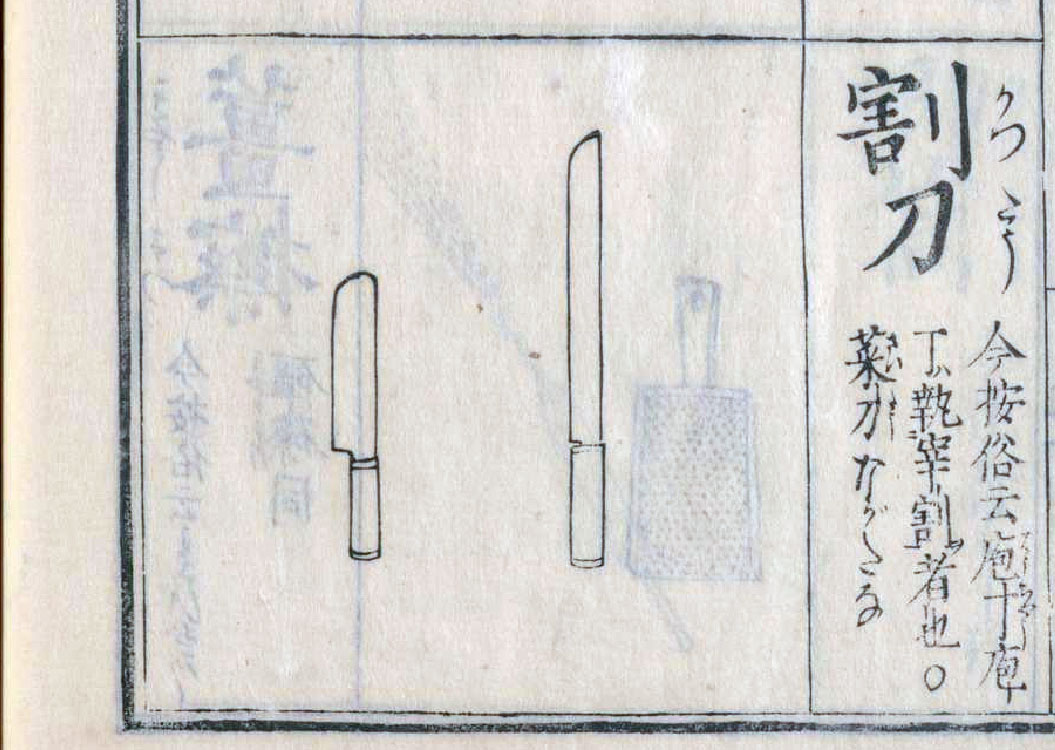 今按ずるに俗に云う、庖丁。庖丁は宰を執る者也。菜刀、ながたな。