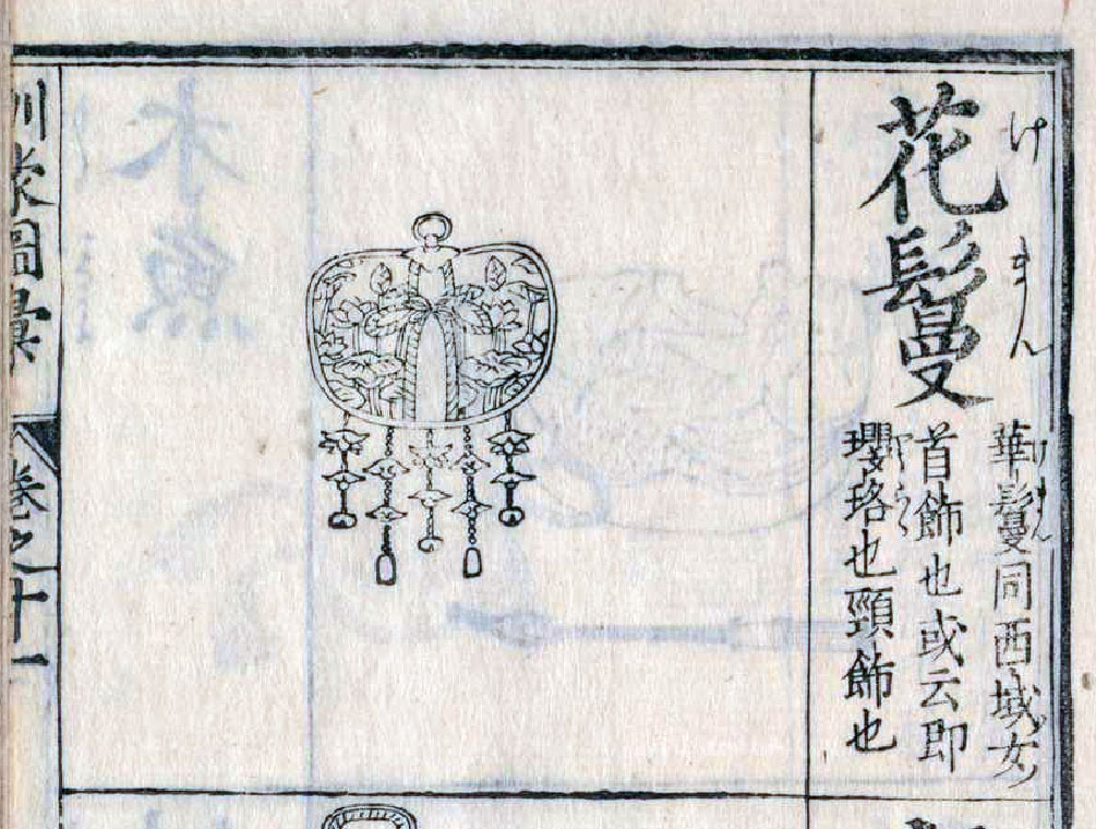 華鬘。同、西域の女の首飾也。或いは云わく、即珱珞也。頸飾也。