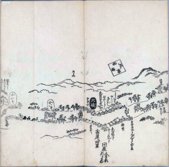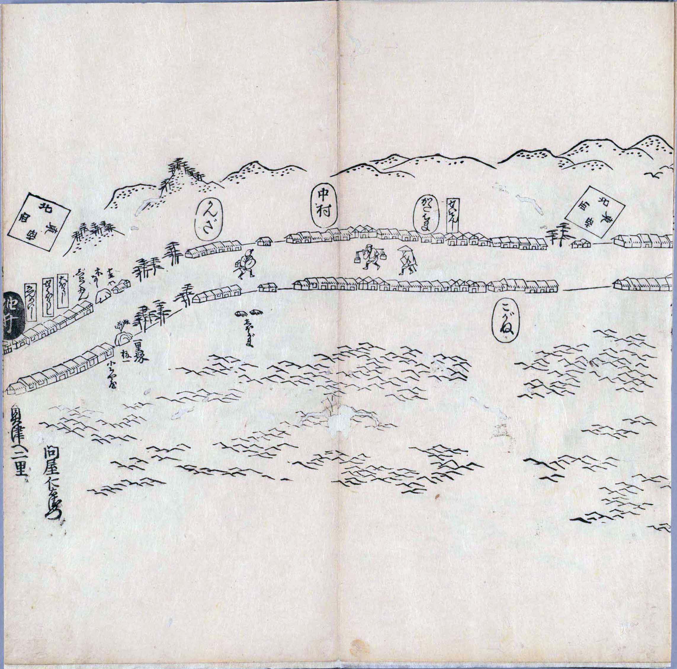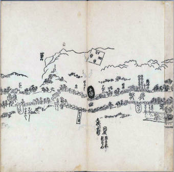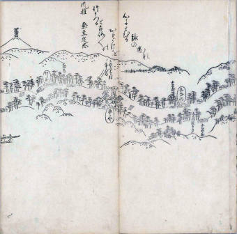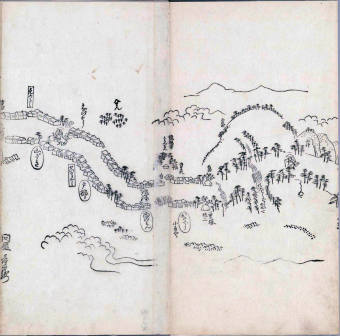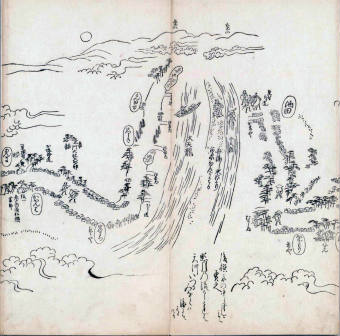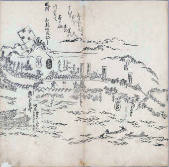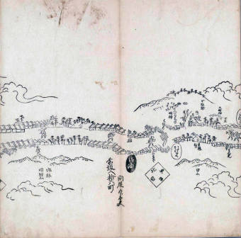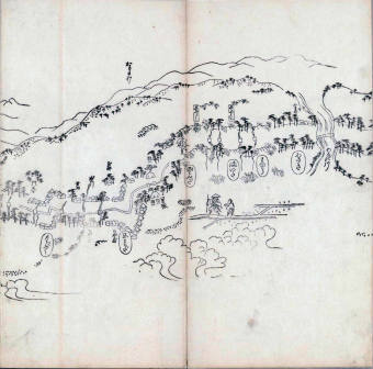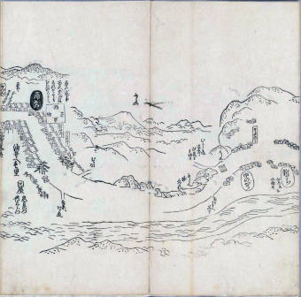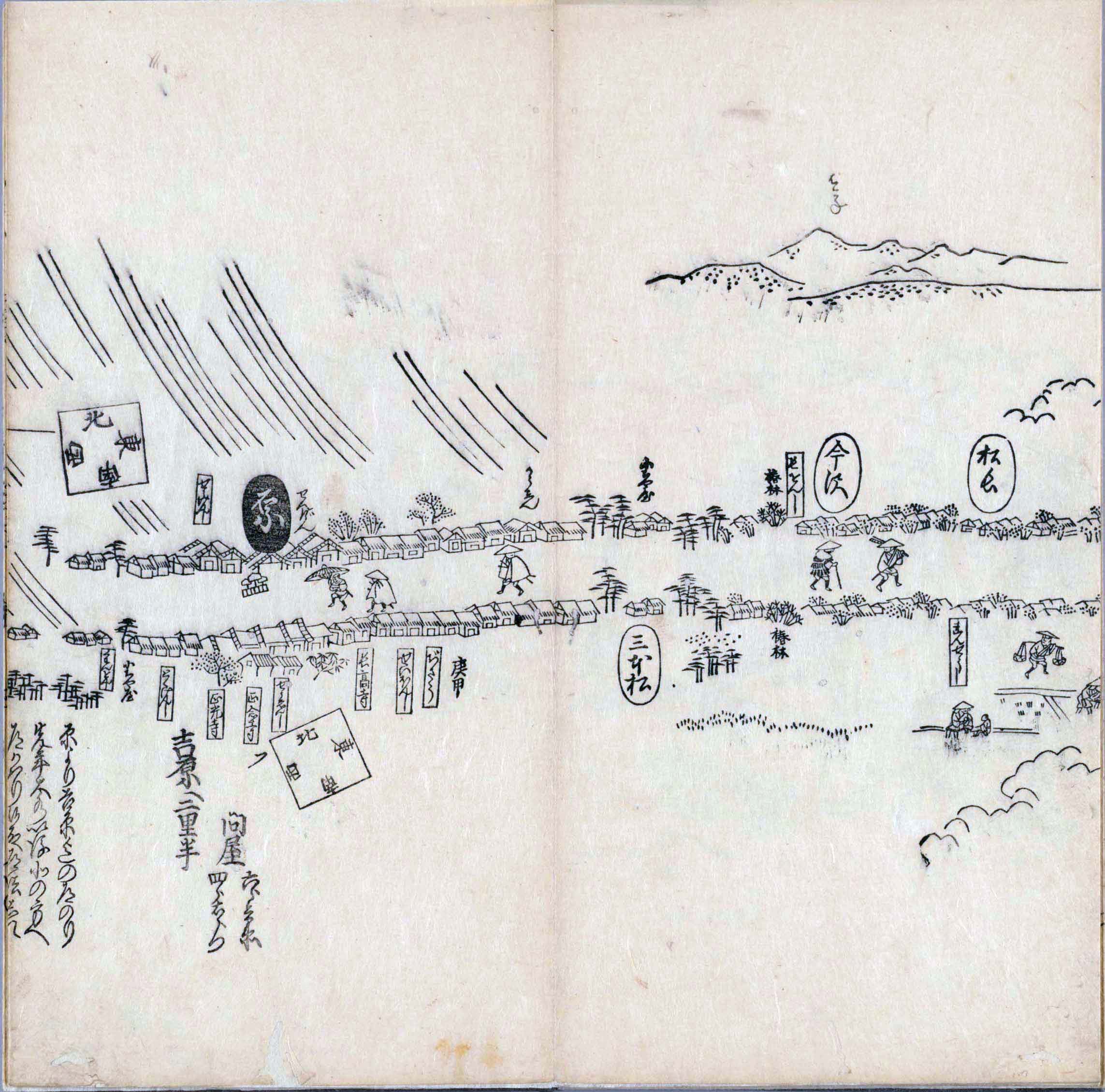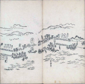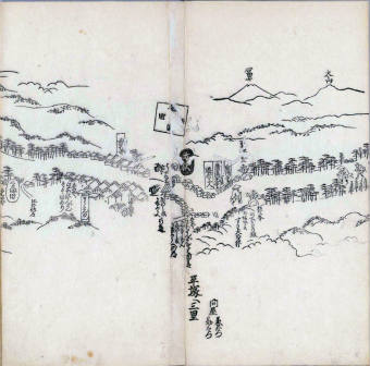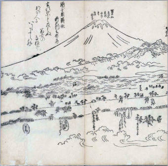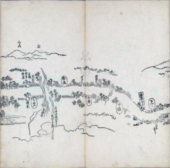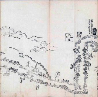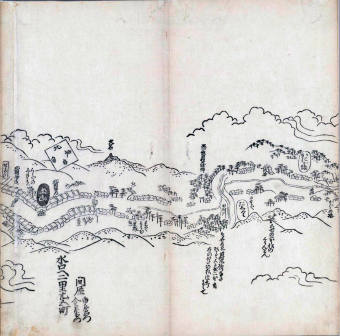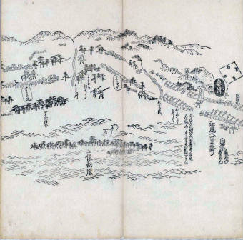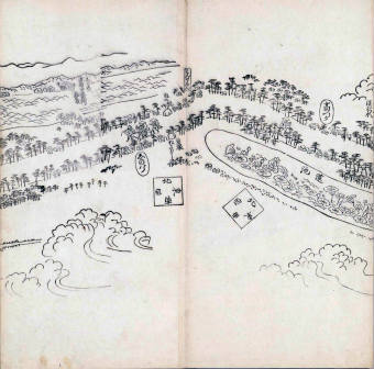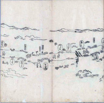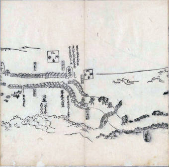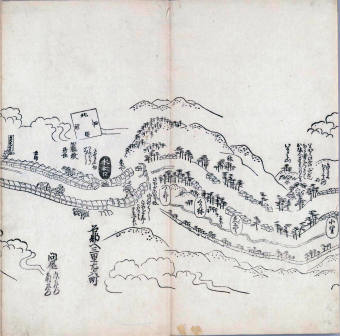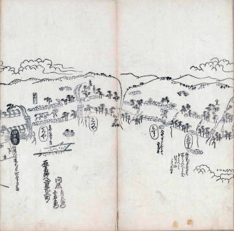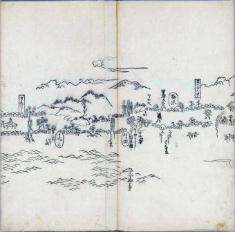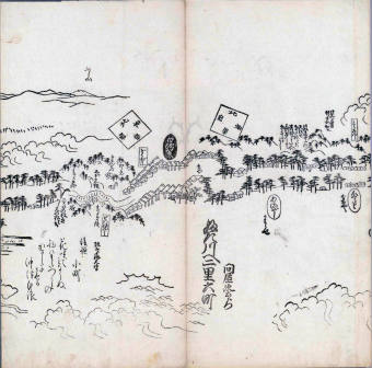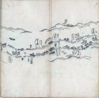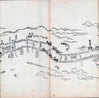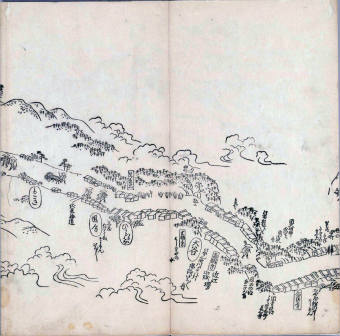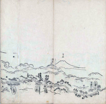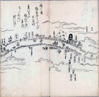 其他、一分四拾間の懐中の図、考と雖ども分厘のただえなし。故に上一下万人に至る迄、一同の名誉を唱ること勿論也去るに依り道印に因んで東海道五十三次の道法分間に顕し而、所々の景、村付け、馬次、家並、名所、旧跡、山川、海道、微細に考え、既に板行令と清書を画師菱河氏に請う。時に彼師云う指図計りにては通達の慰用共ならず。唯右の図を風俗に顕し、うるわしきを以って高位の簾中、下劣の女童に至迄、明鏡に向かいて自面之みるがごとくならしめん。と功筆を抜す。