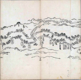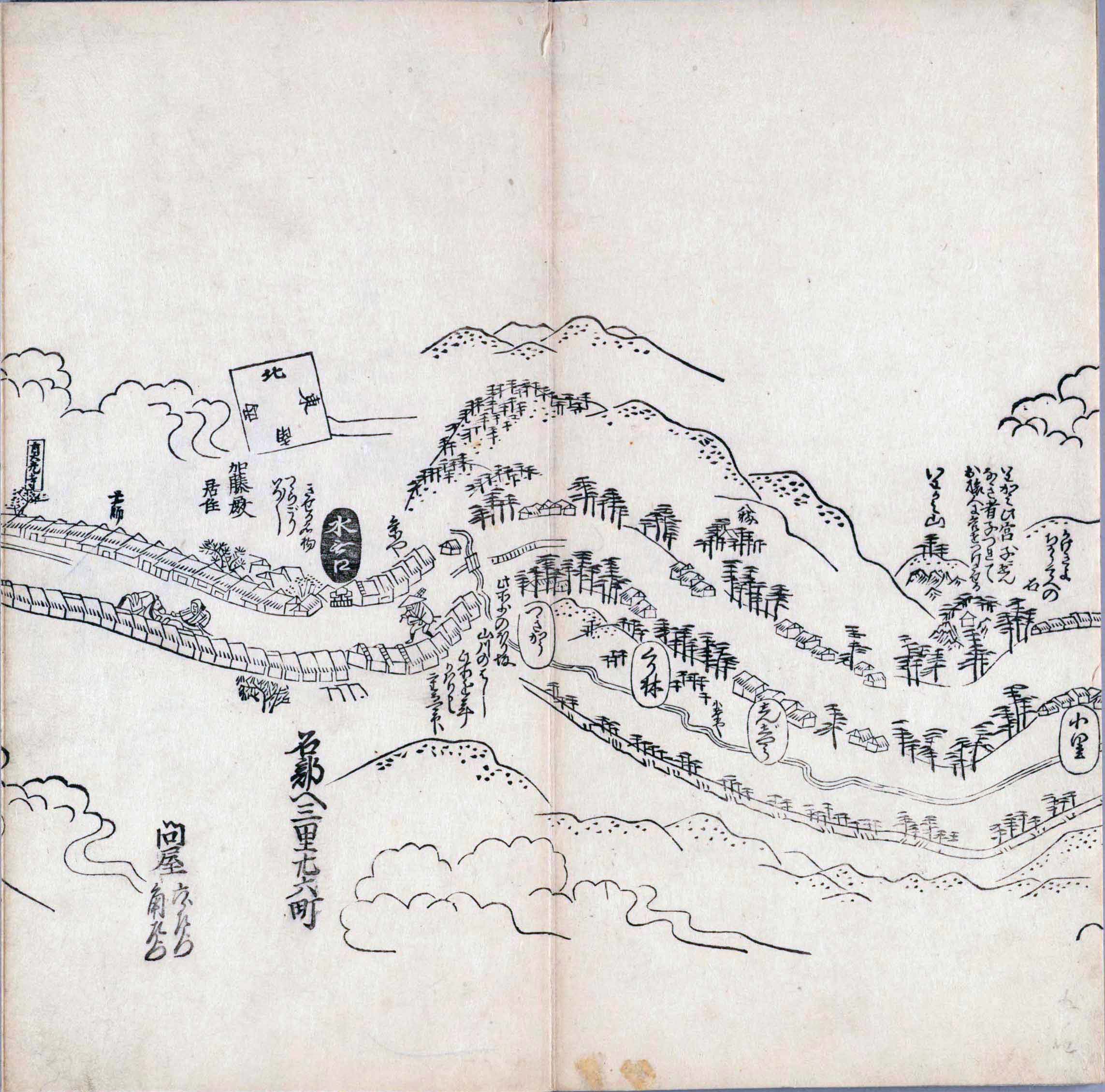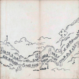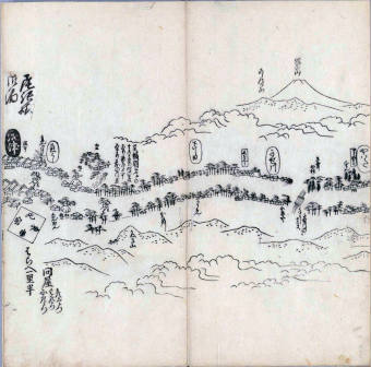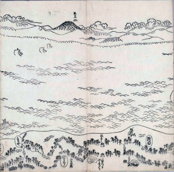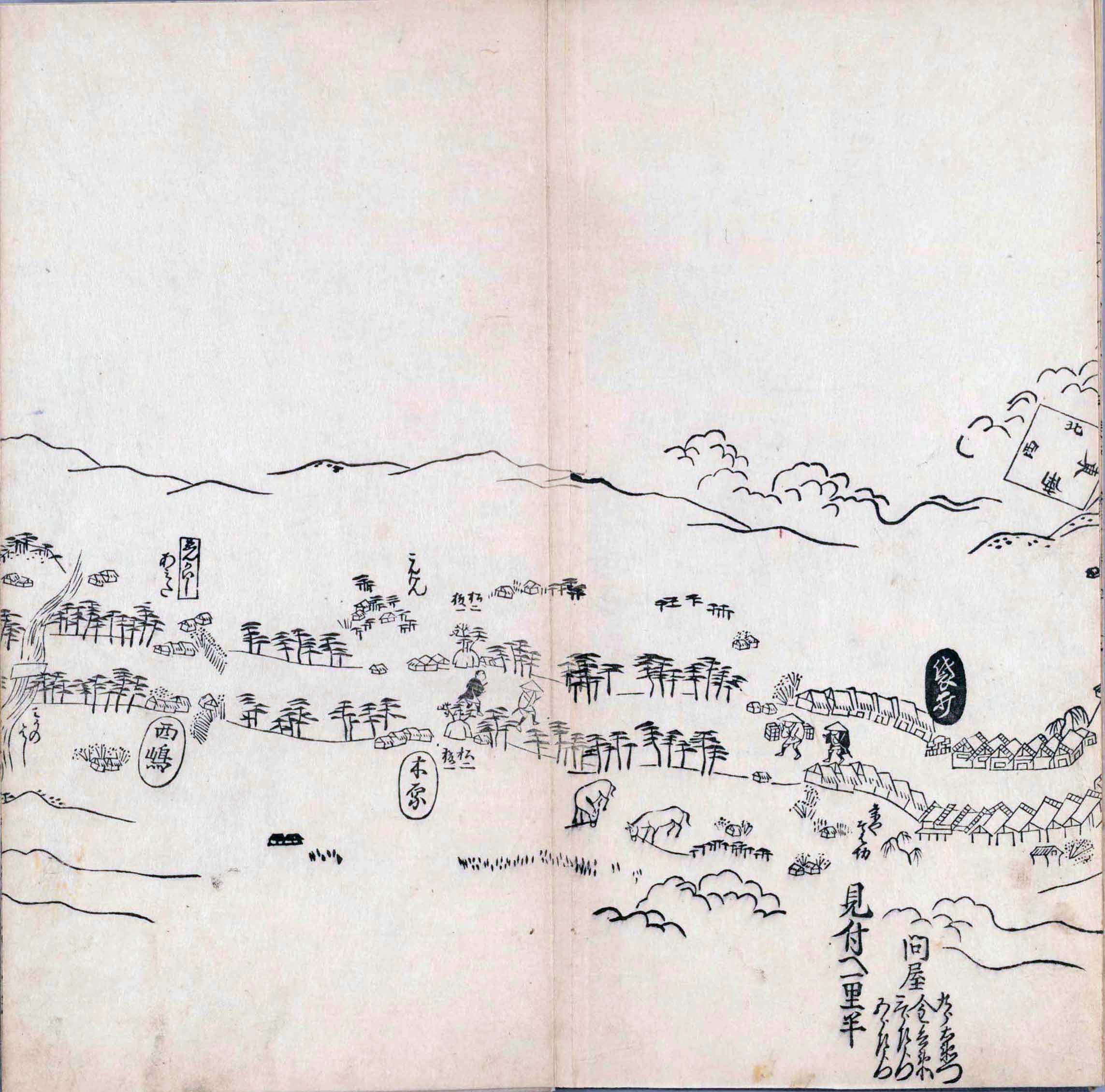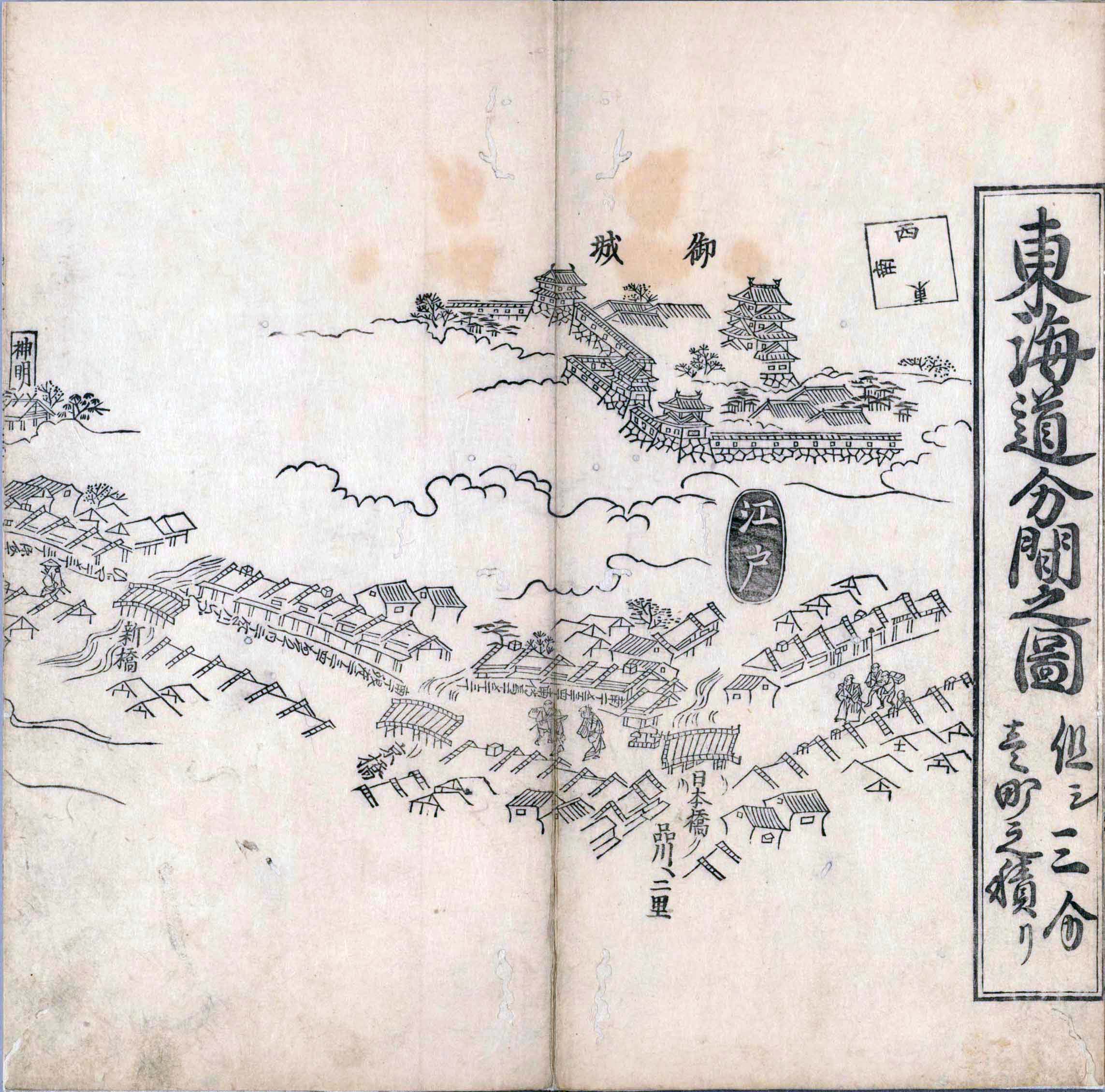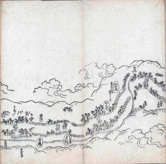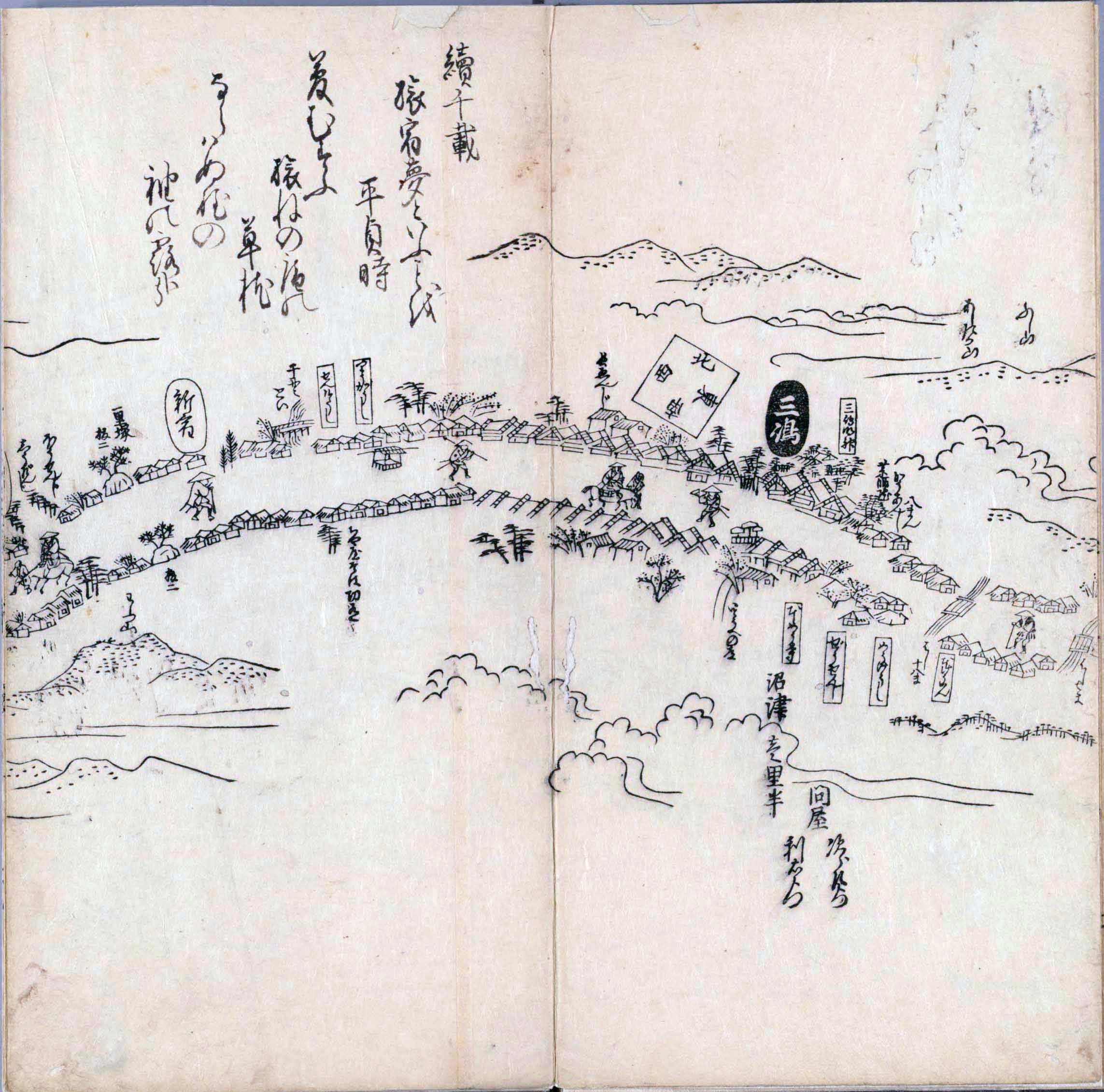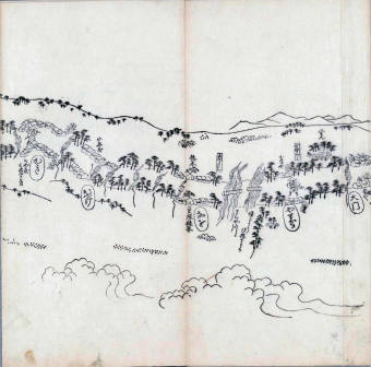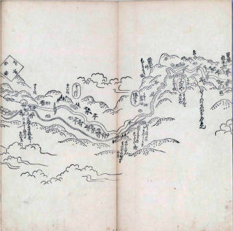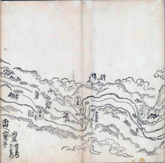 其他、一分四拾間の懐中の図、考と雖ども分厘のただえなし。故に上一下万人に至る迄、一同の名誉を唱ること勿論也去るに依り道印に因んで東海道五十三次の道法分間に顕し而、所々の景、村付け、馬次、家並、名所、旧跡、山川、海道、微細に考え、既に板行令と清書を画師菱河氏に請う。時に彼師云う指図計りにては通達の慰用共ならず。唯右の図を風俗に顕し、うるわしきを以って高位の簾中、下劣の女童に至迄、明鏡に向かいて自面之みるがごとくならしめん。と功筆を抜す。