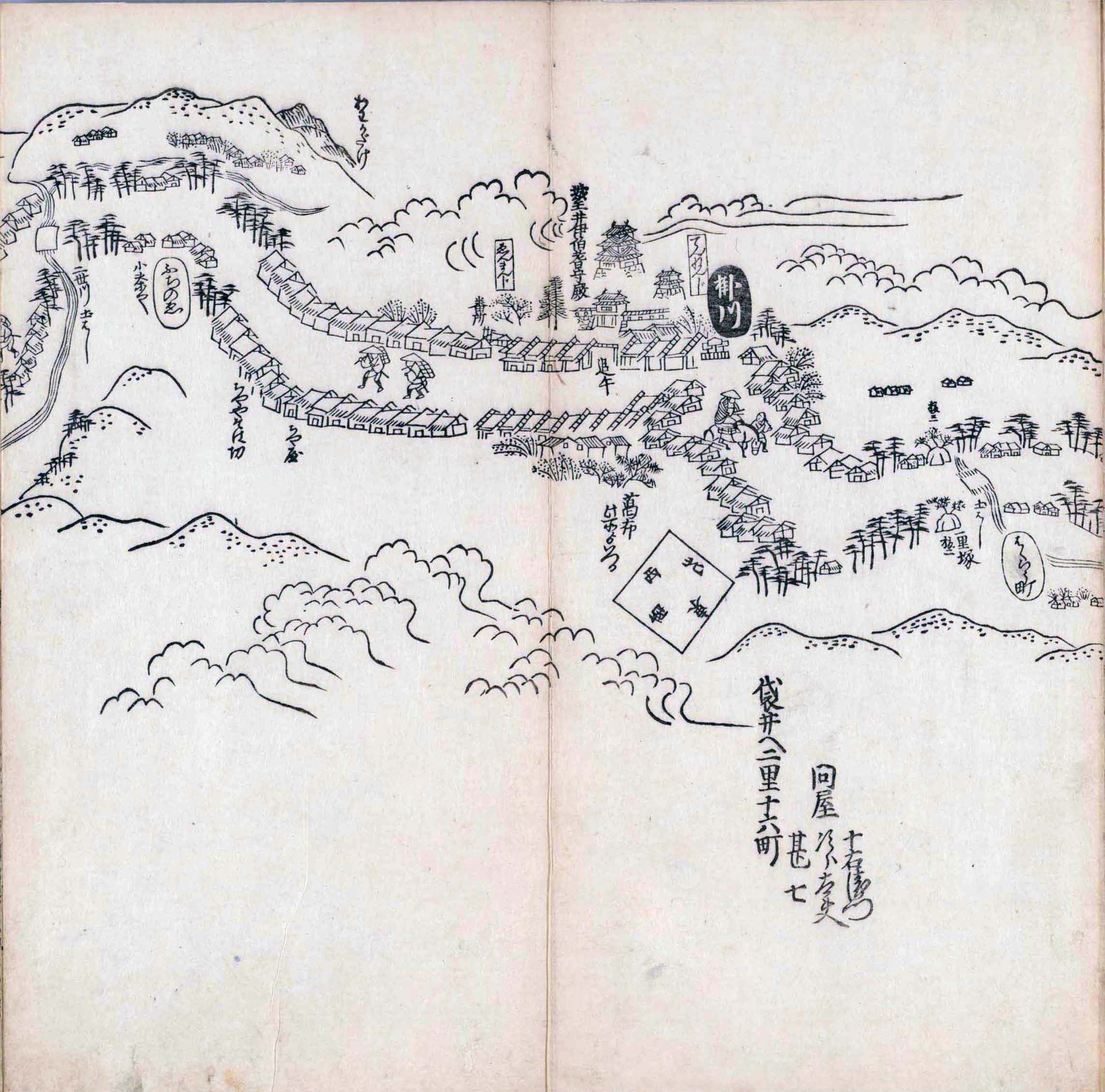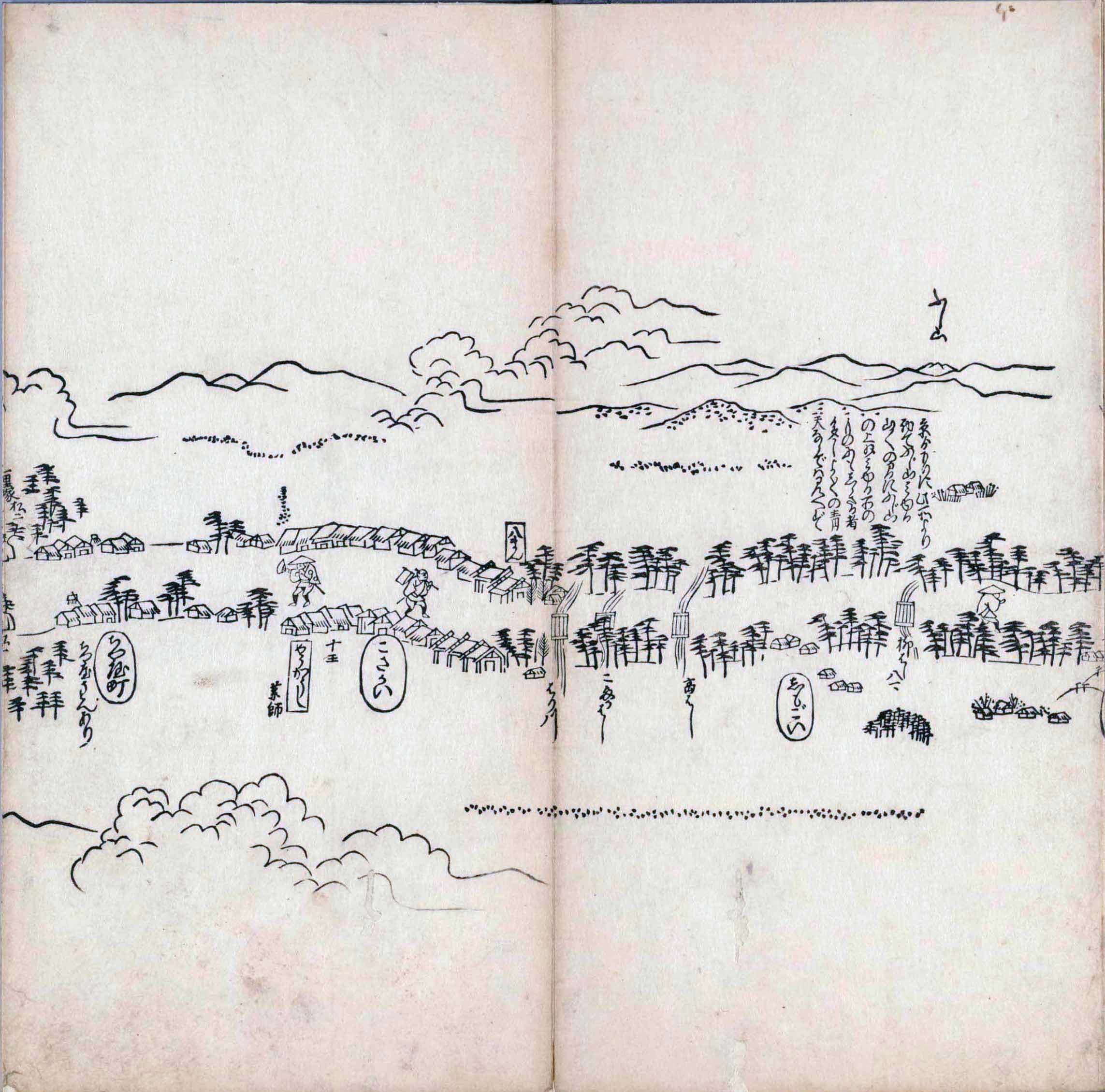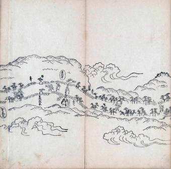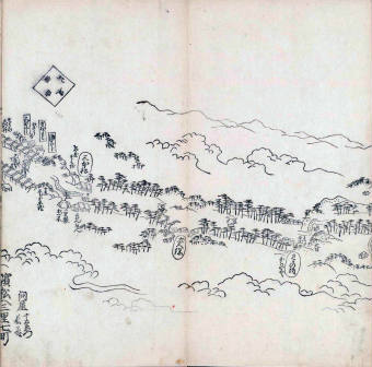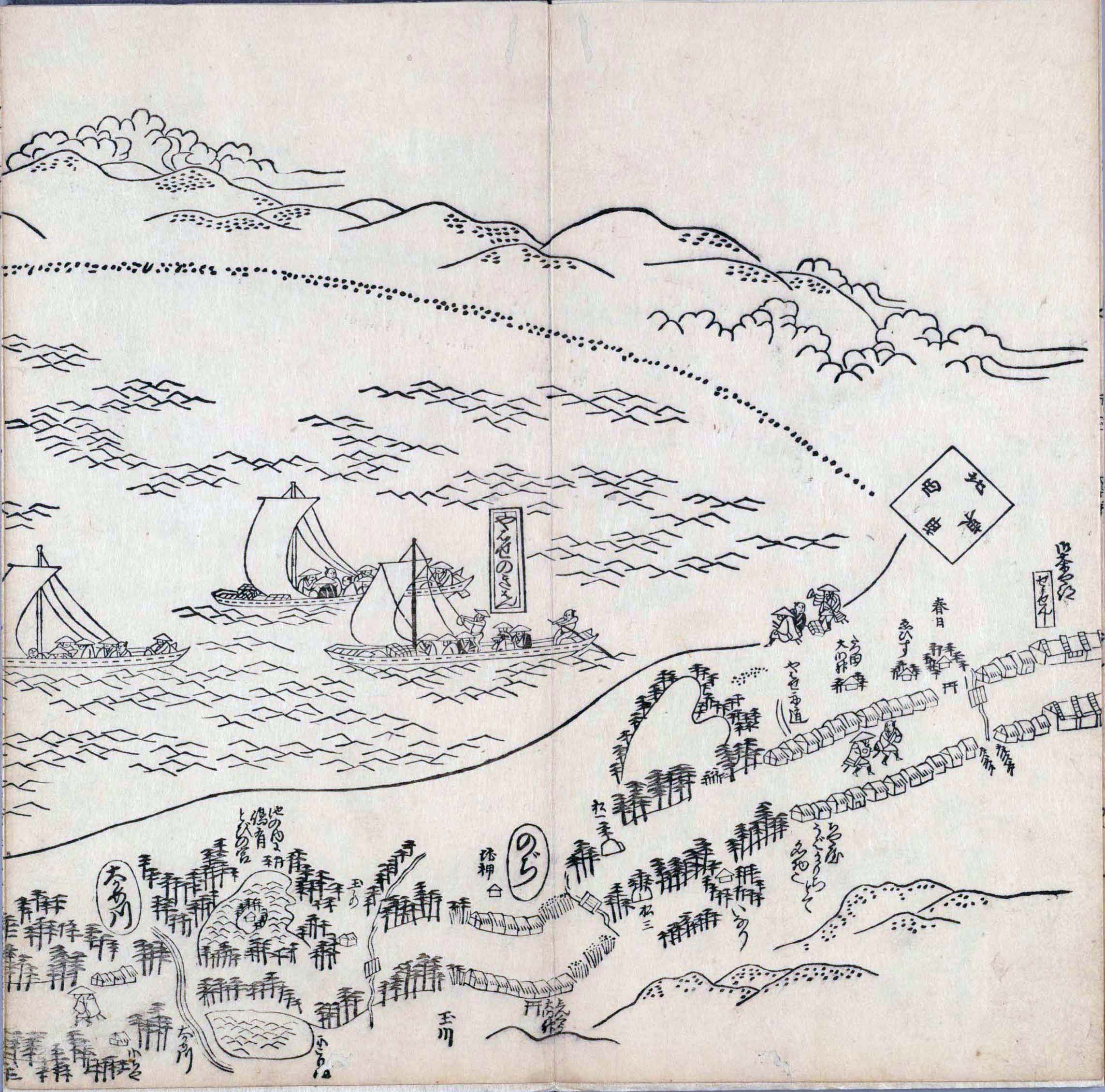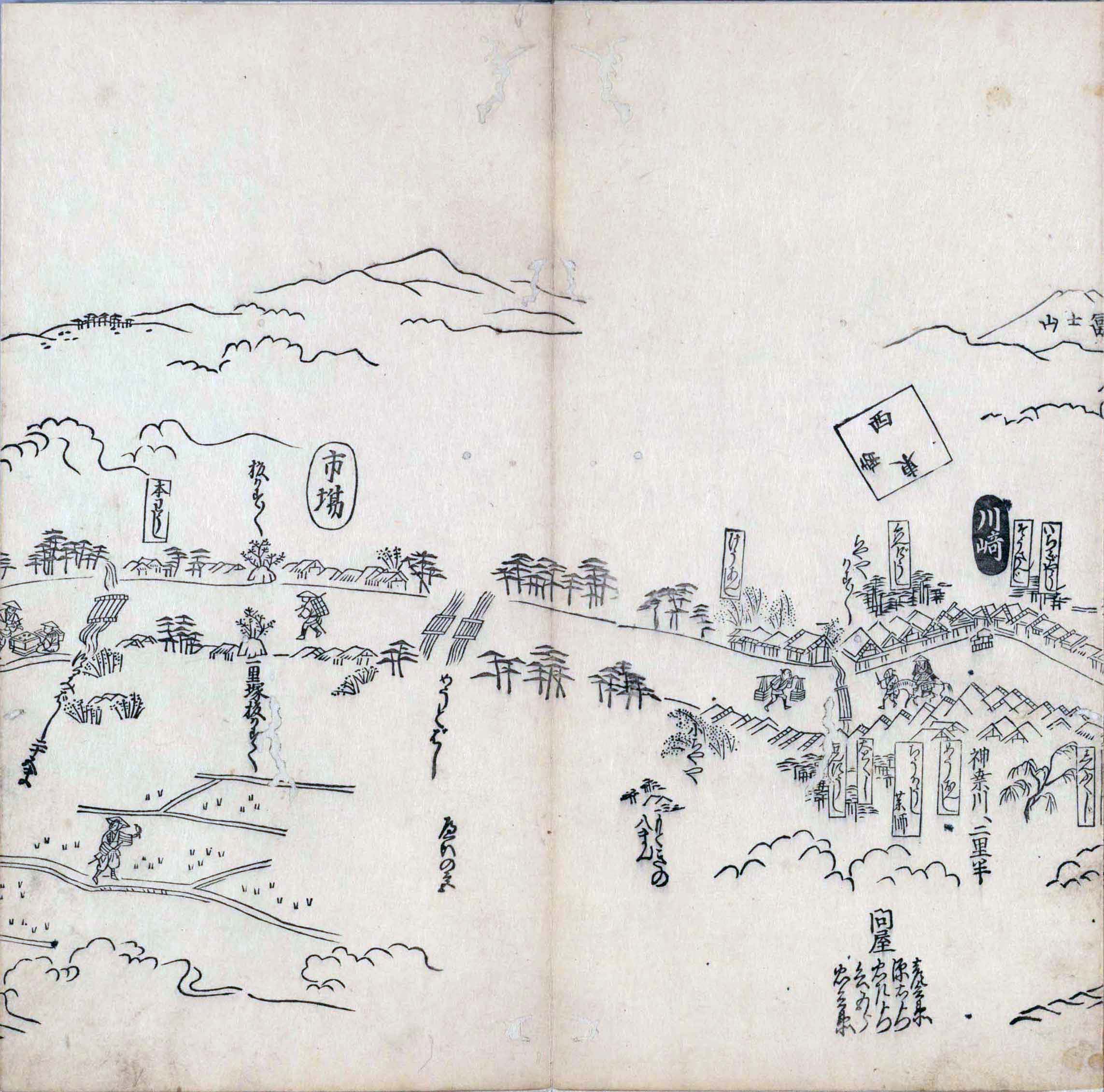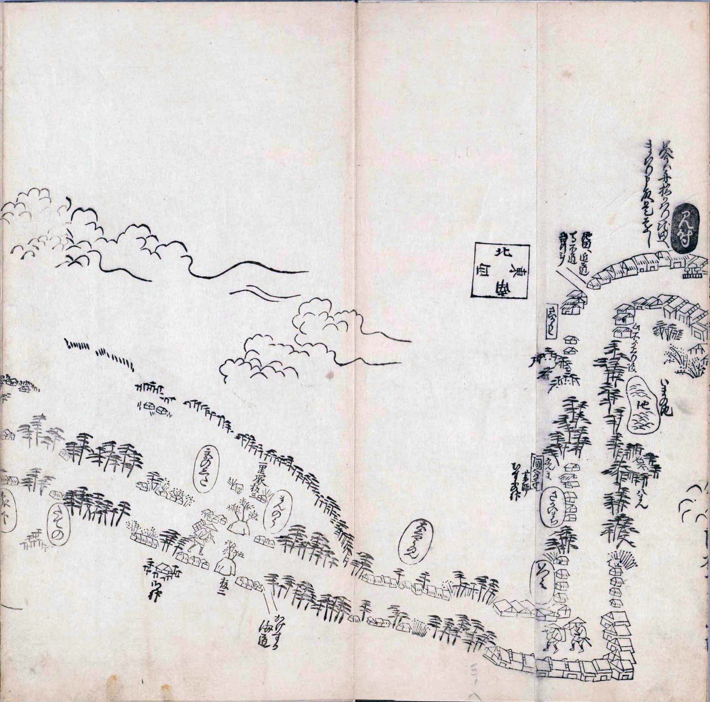 其他、一分四拾間の懐中の図、考と雖ども分厘のただえなし。故に上一下万人に至る迄、一同の名誉を唱ること勿論也去るに依り道印に因んで東海道五十三次の道法分間に顕し而、所々の景、村付け、馬次、家並、名所、旧跡、山川、海道、微細に考え、既に板行令と清書を画師菱河氏に請う。時に彼師云う指図計りにては通達の慰用共ならず。唯右の図を風俗に顕し、うるわしきを以って高位の簾中、下劣の女童に至迄、明鏡に向かいて自面之みるがごとくならしめん。と功筆を抜す。