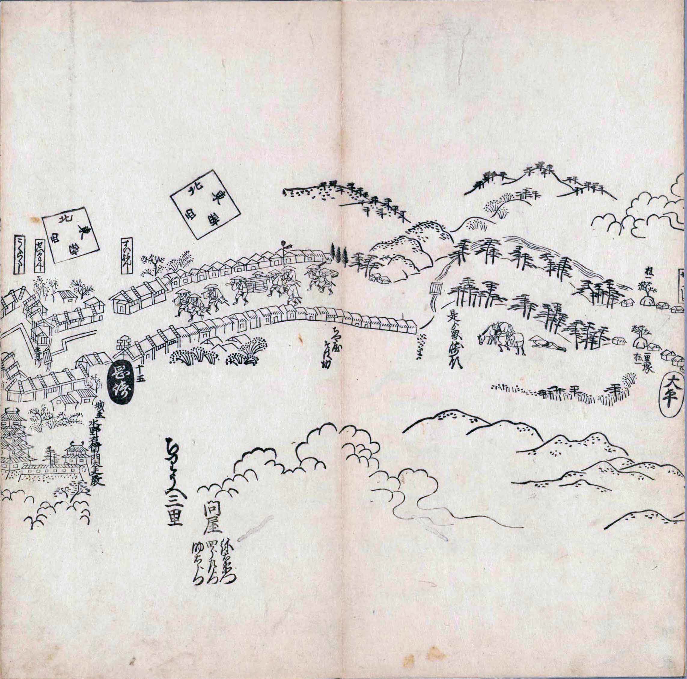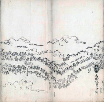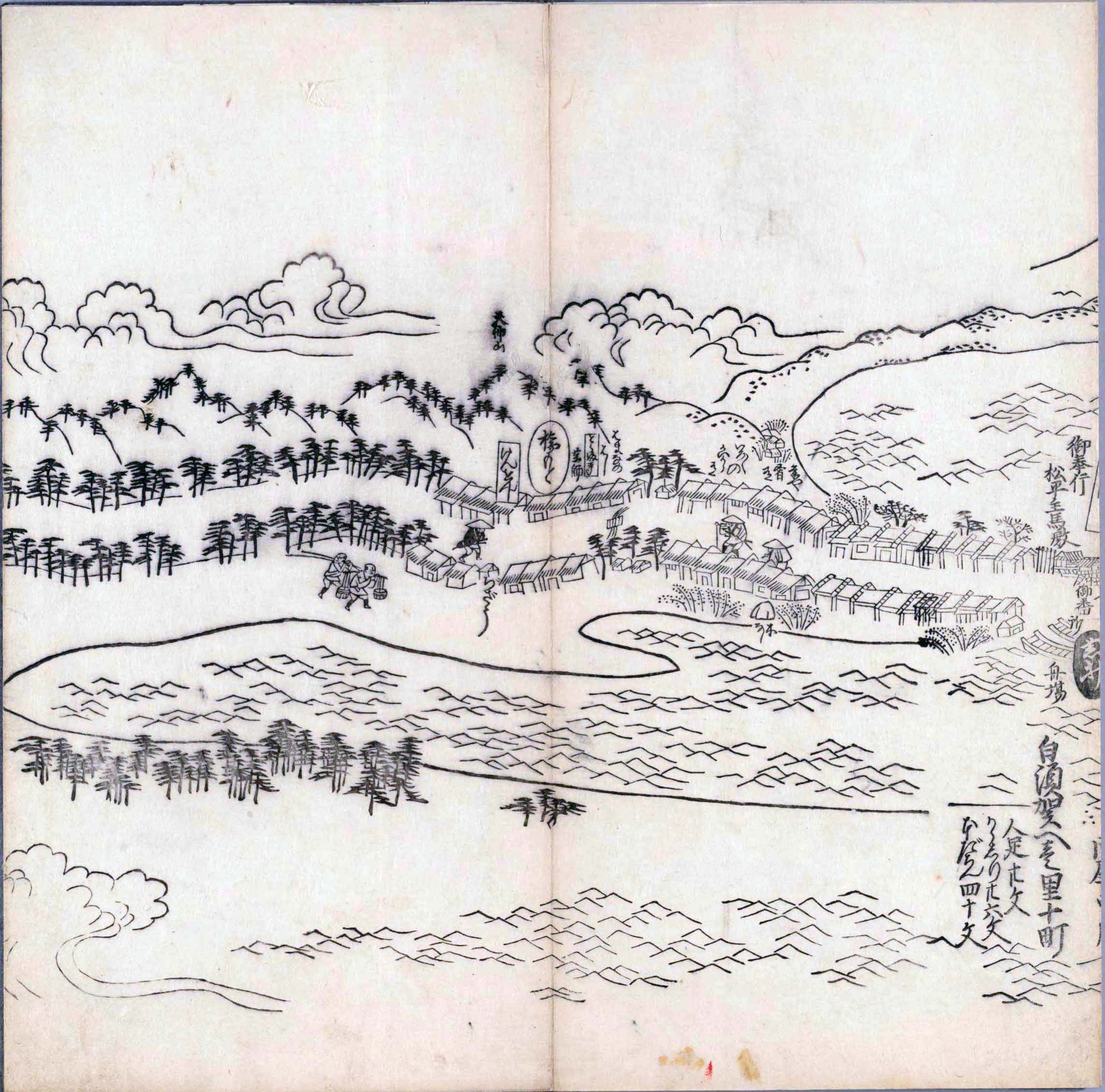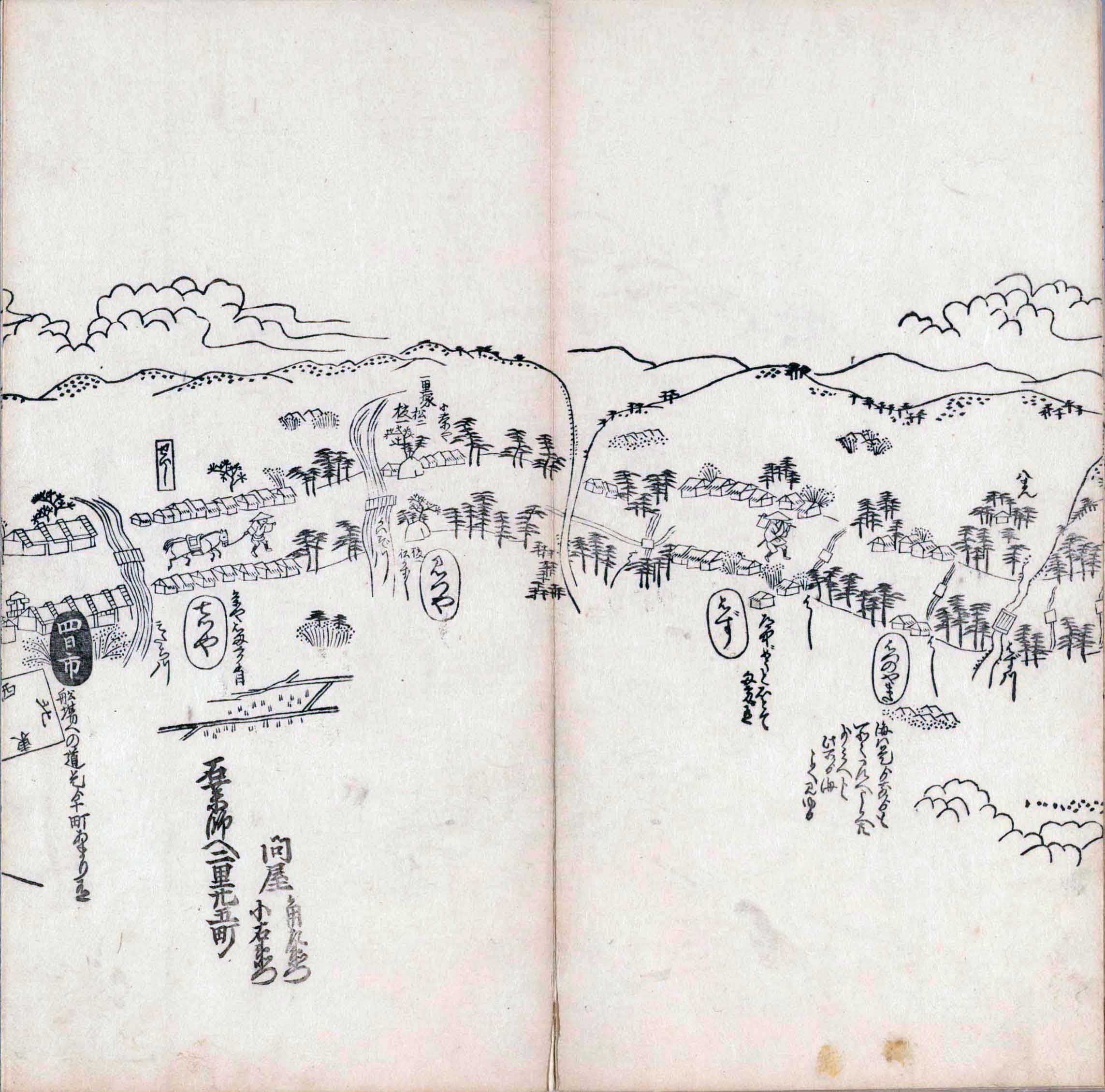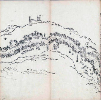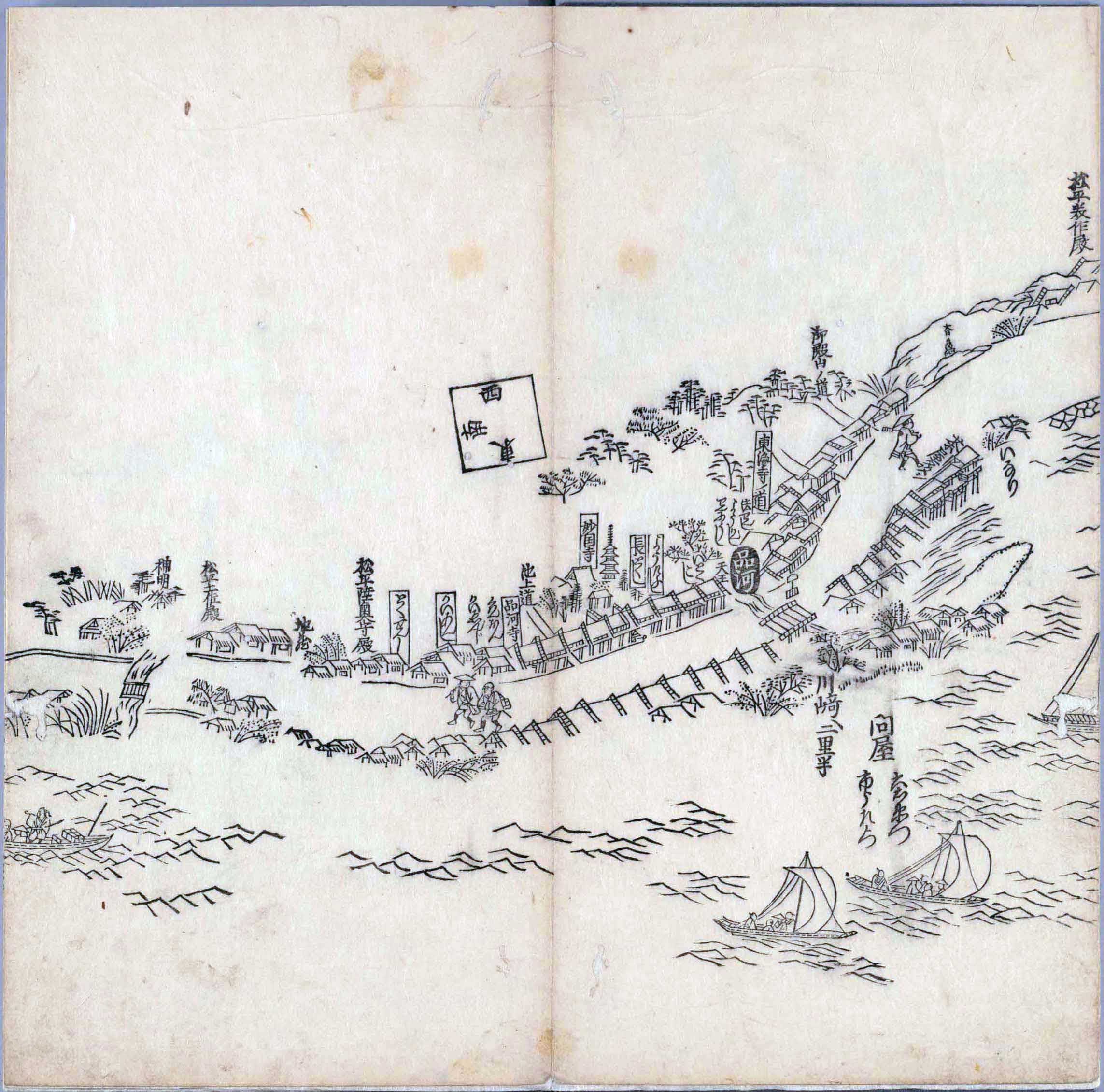 其他、一分四拾間の懐中の図、考と雖ども分厘のただえなし。故に上一下万人に至る迄、一同の名誉を唱ること勿論也去るに依り道印に因んで東海道五十三次の道法分間に顕し而、所々の景、村付け、馬次、家並、名所、旧跡、山川、海道、微細に考え、既に板行令と清書を画師菱河氏に請う。時に彼師云う指図計りにては通達の慰用共ならず。唯右の図を風俗に顕し、うるわしきを以って高位の簾中、下劣の女童に至迄、明鏡に向かいて自面之みるがごとくならしめん。と功筆を抜す。