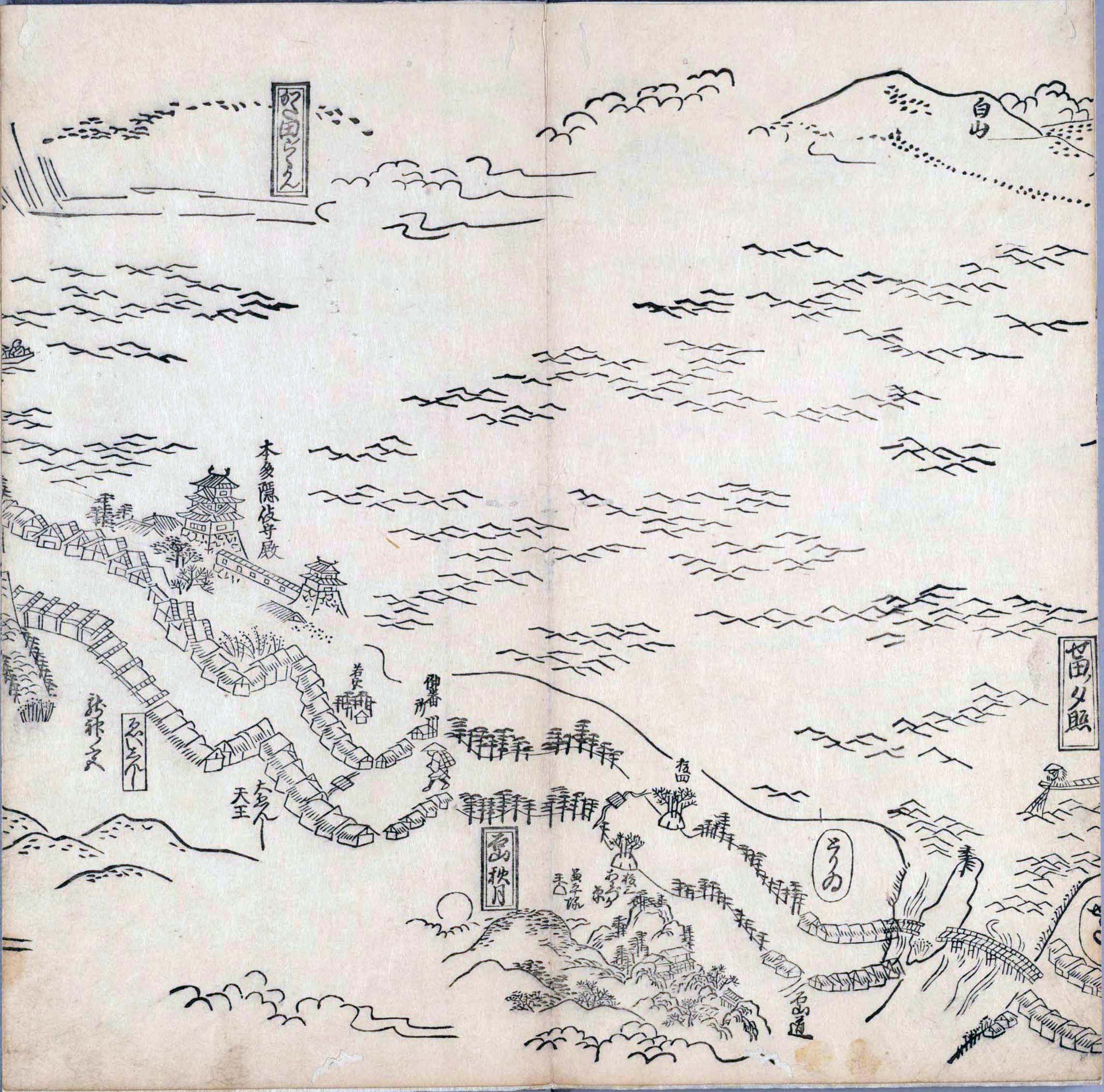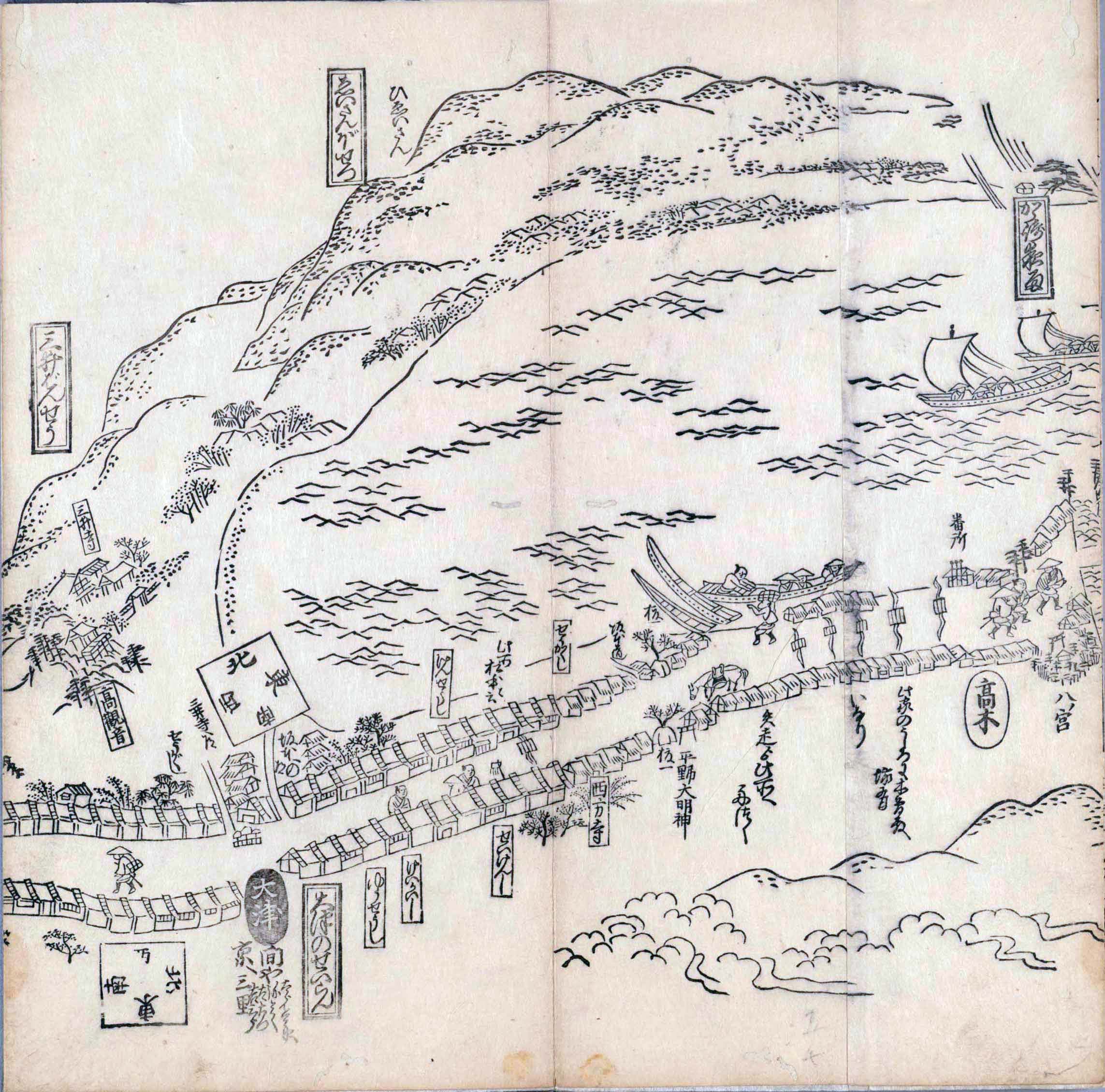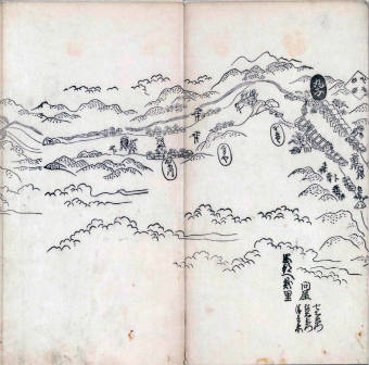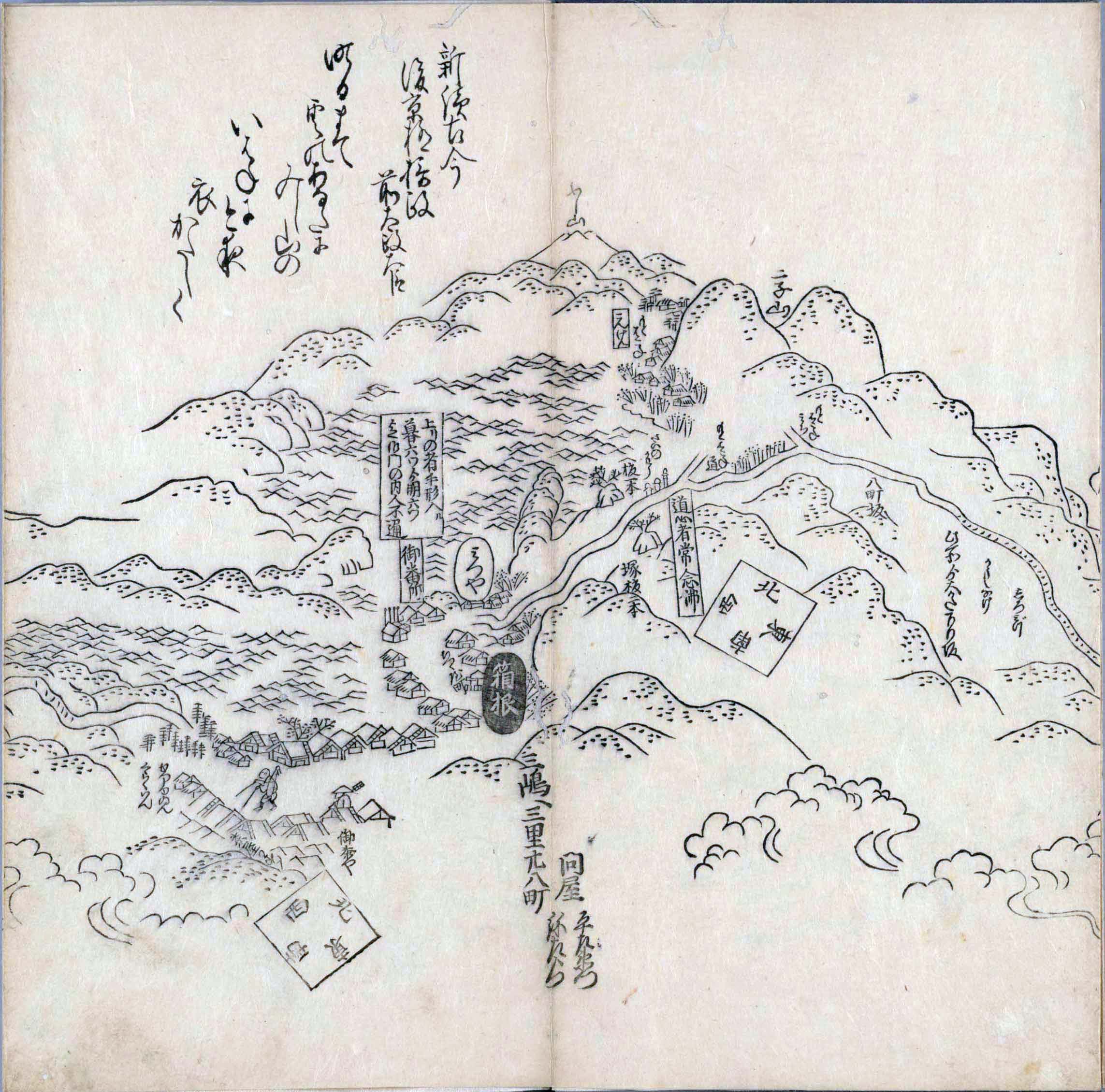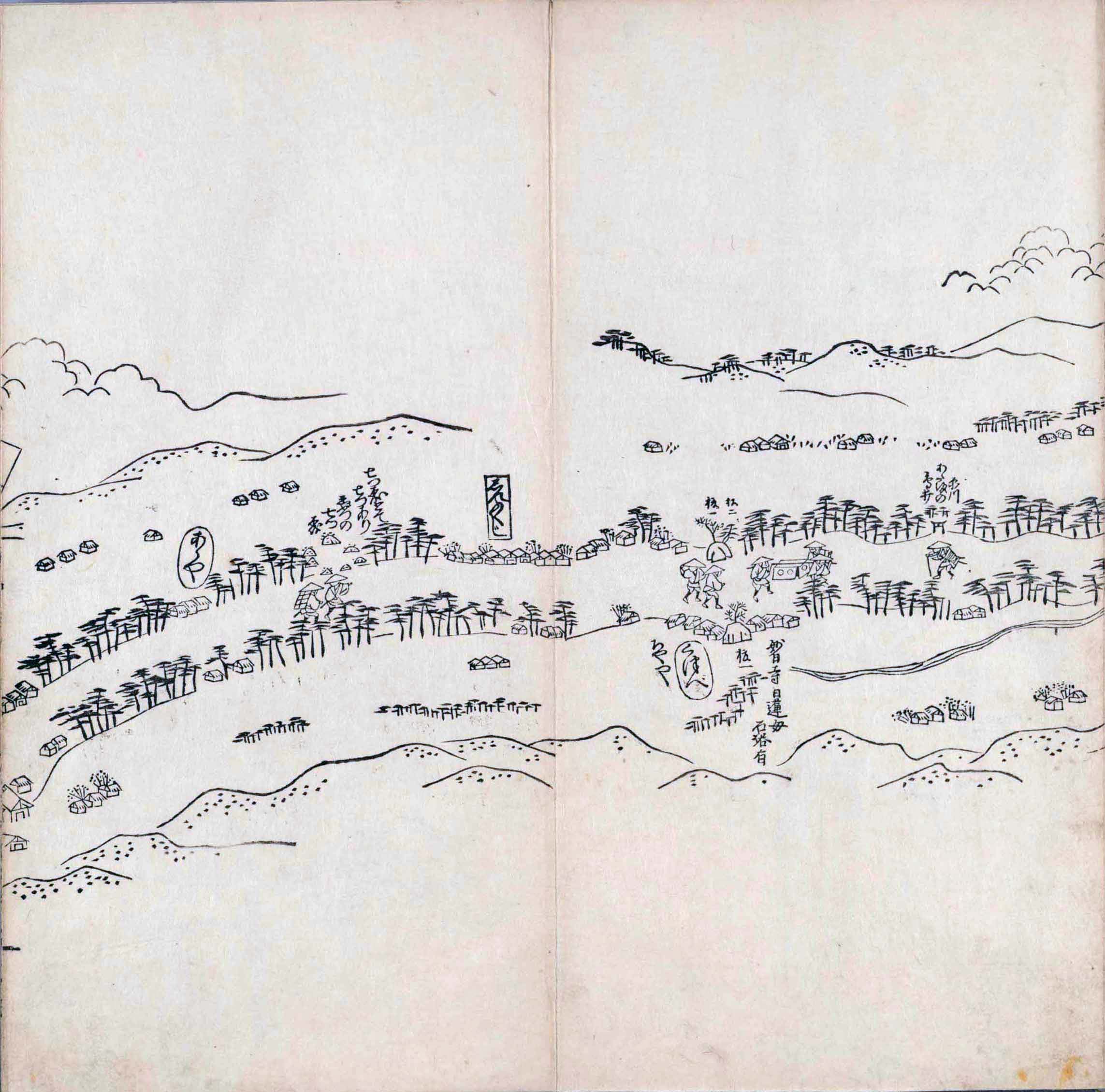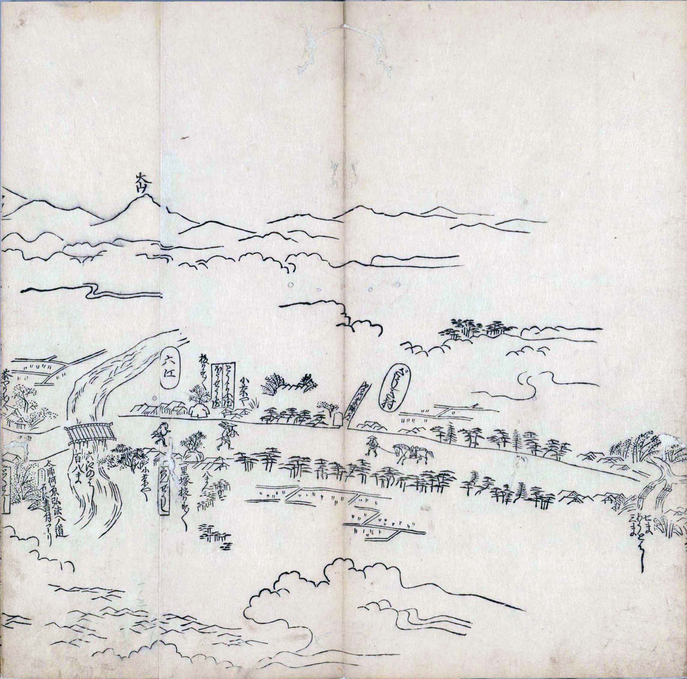 其他、一分四拾間の懐中の図、考と雖ども分厘のただえなし。故に上一下万人に至る迄、一同の名誉を唱ること勿論也去るに依り道印に因んで東海道五十三次の道法分間に顕し而、所々の景、村付け、馬次、家並、名所、旧跡、山川、海道、微細に考え、既に板行令と清書を画師菱河氏に請う。時に彼師云う指図計りにては通達の慰用共ならず。唯右の図を風俗に顕し、うるわしきを以って高位の簾中、下劣の女童に至迄、明鏡に向かいて自面之みるがごとくならしめん。と功筆を抜す。