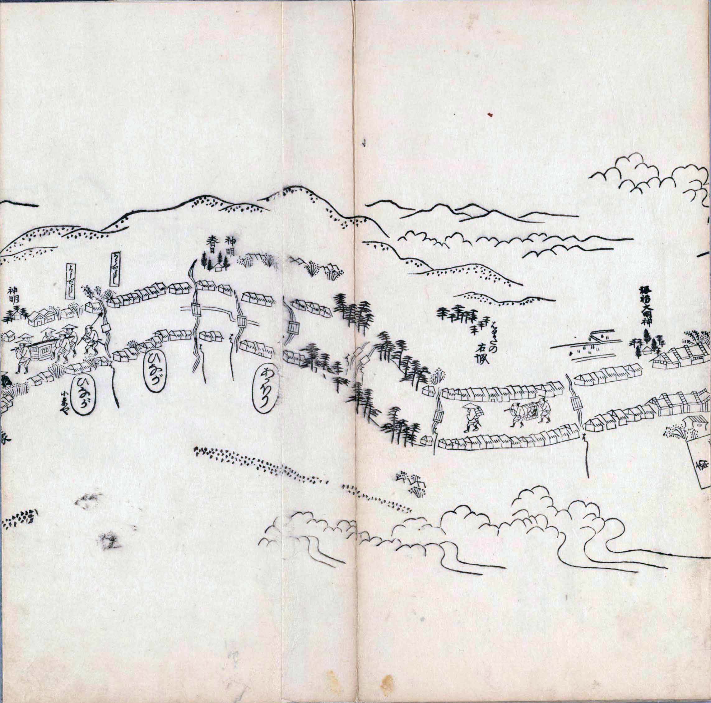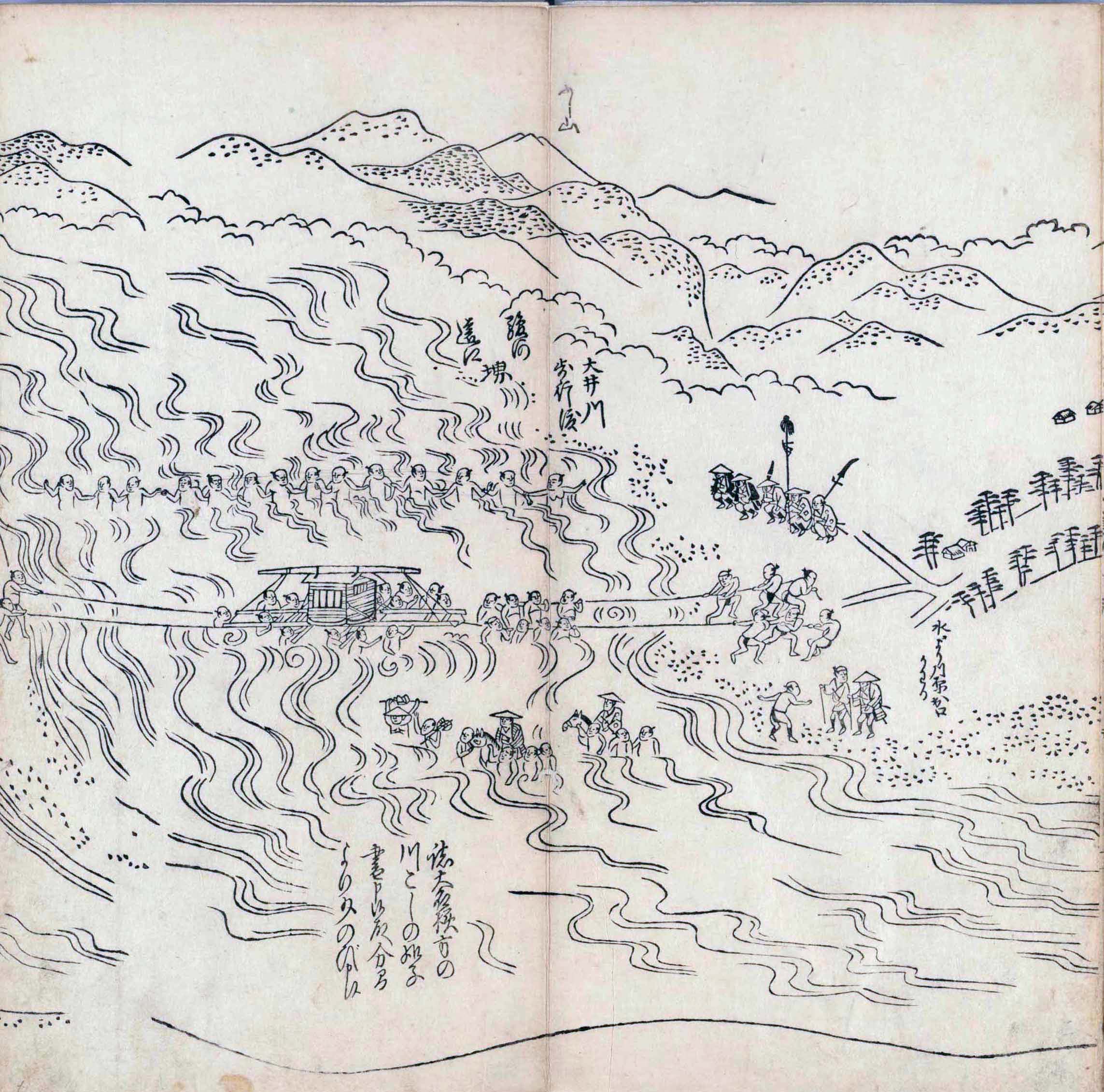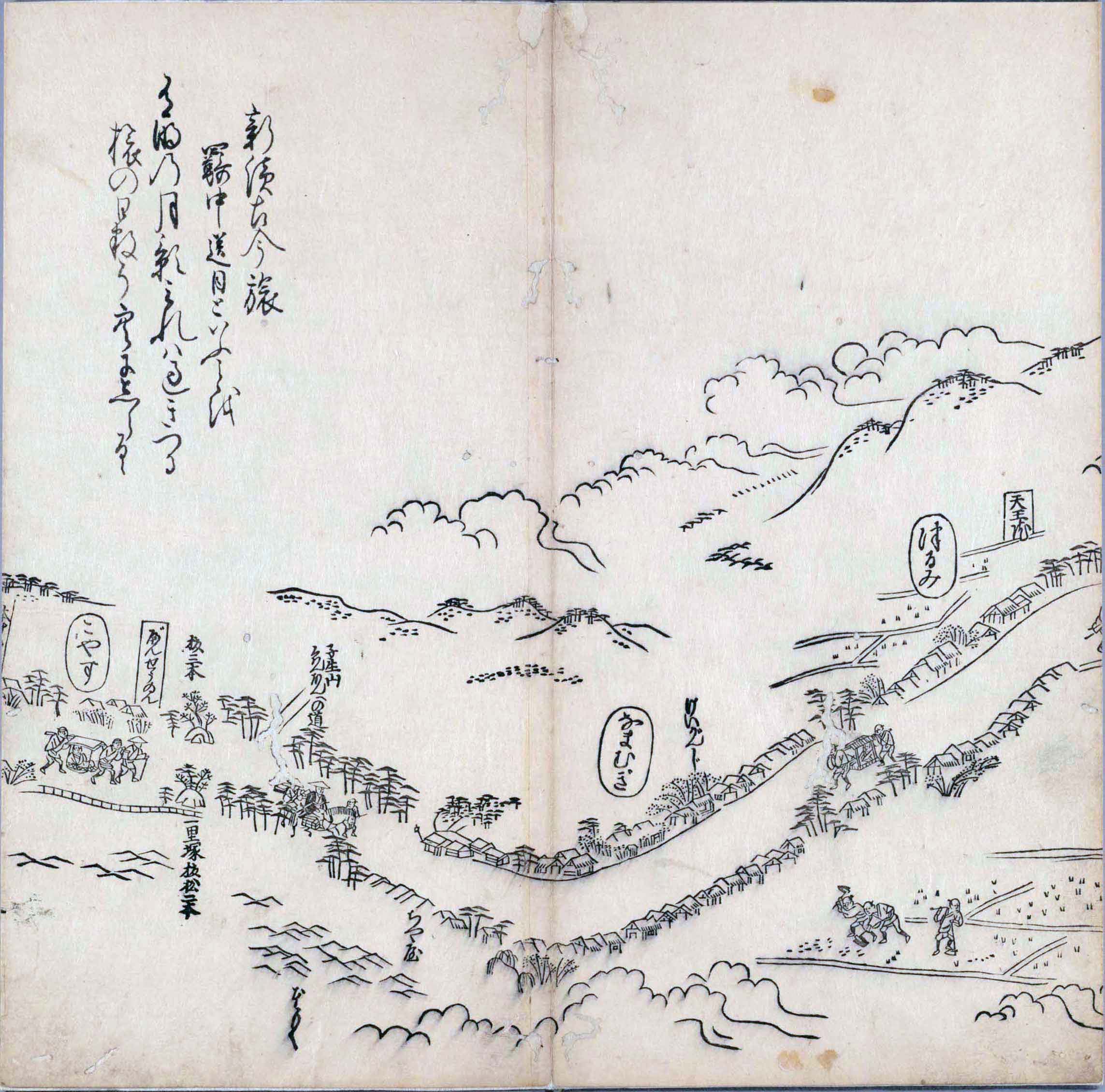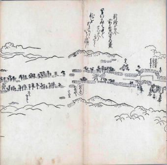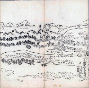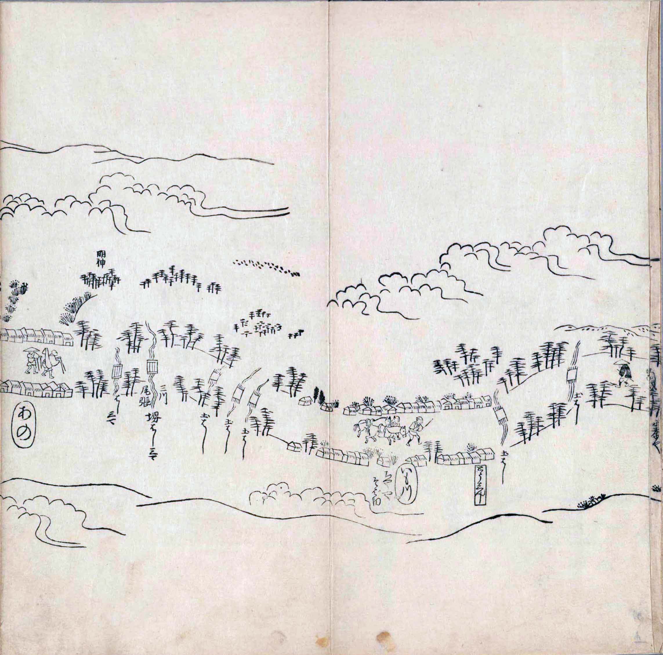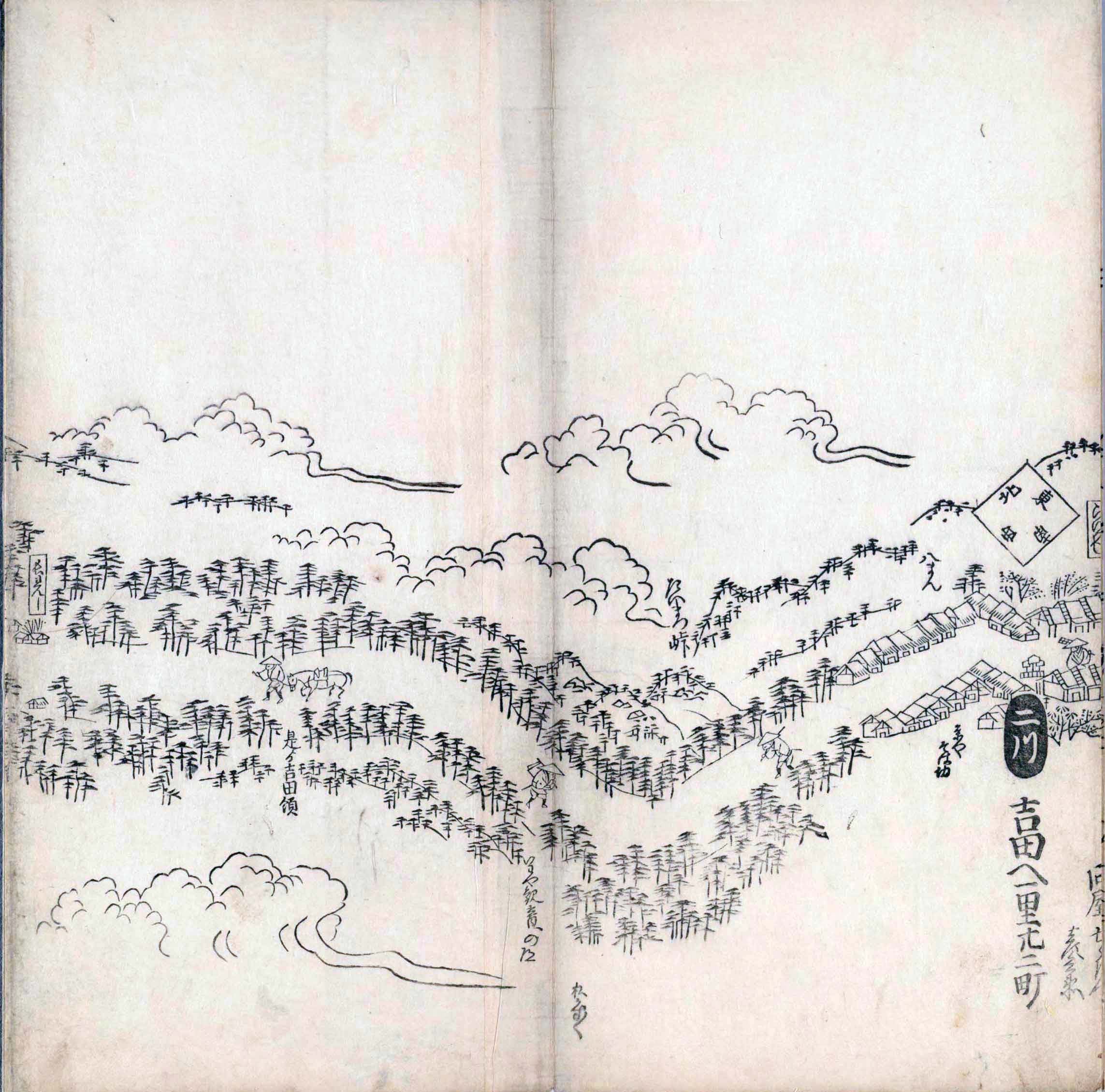 其他、一分四拾間の懐中の図、考と雖ども分厘のただえなし。故に上一下万人に至る迄、一同の名誉を唱ること勿論也去るに依り道印に因んで東海道五十三次の道法分間に顕し而、所々の景、村付け、馬次、家並、名所、旧跡、山川、海道、微細に考え、既に板行令と清書を画師菱河氏に請う。時に彼師云う指図計りにては通達の慰用共ならず。唯右の図を風俗に顕し、うるわしきを以って高位の簾中、下劣の女童に至迄、明鏡に向かいて自面之みるがごとくならしめん。と功筆を抜す。