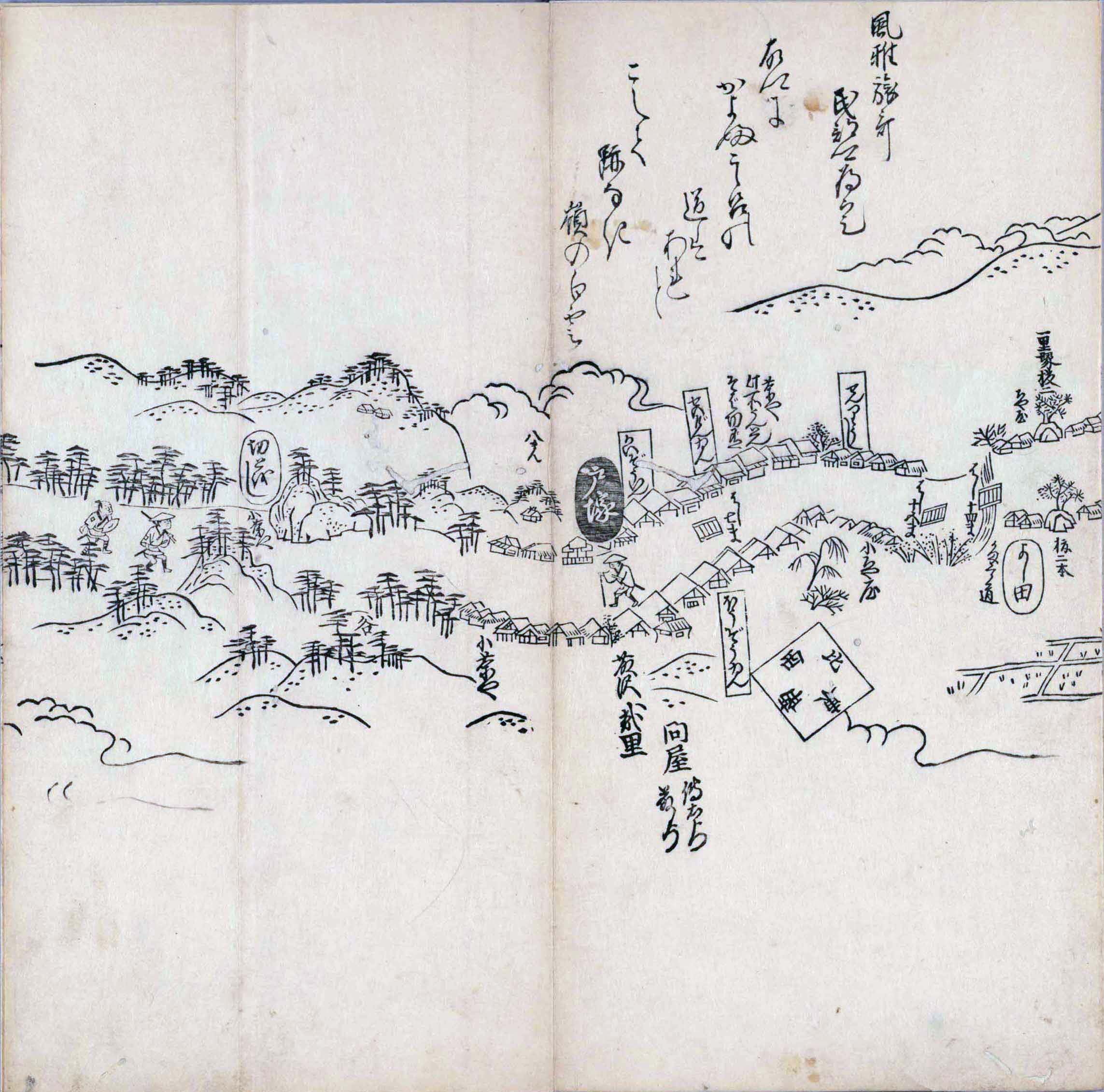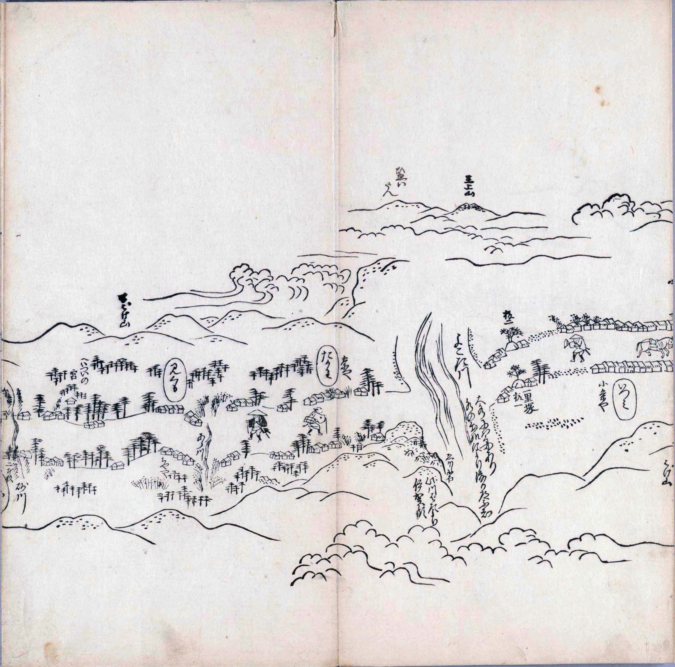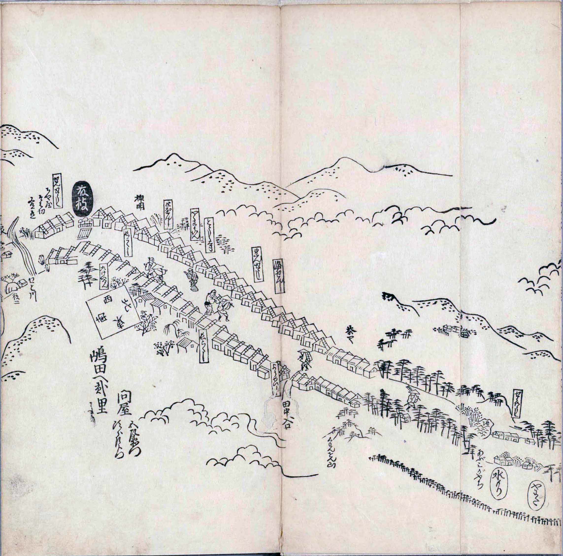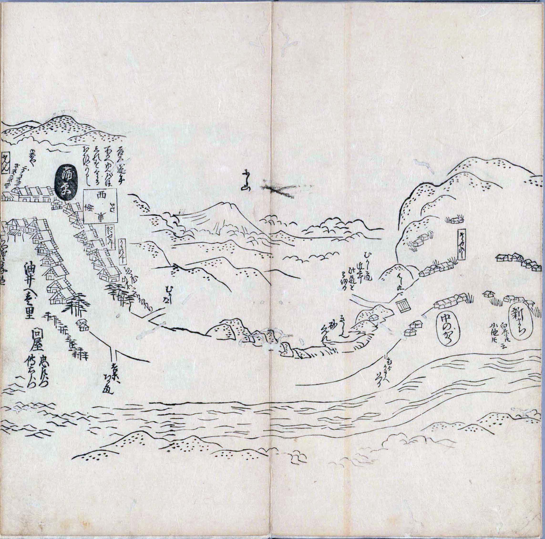 其他、一分四拾間の懐中の図、考と雖ども分厘のただえなし。故に上一下万人に至る迄、一同の名誉を唱ること勿論也去るに依り道印に因んで東海道五十三次の道法分間に顕し而、所々の景、村付け、馬次、家並、名所、旧跡、山川、海道、微細に考え、既に板行令と清書を画師菱河氏に請う。時に彼師云う指図計りにては通達の慰用共ならず。唯右の図を風俗に顕し、うるわしきを以って高位の簾中、下劣の女童に至迄、明鏡に向かいて自面之みるがごとくならしめん。と功筆を抜す。