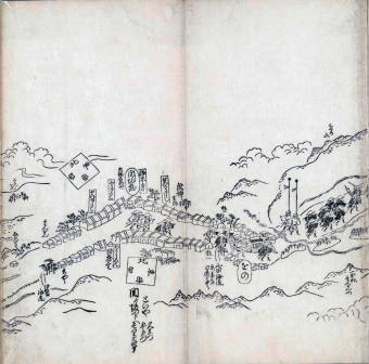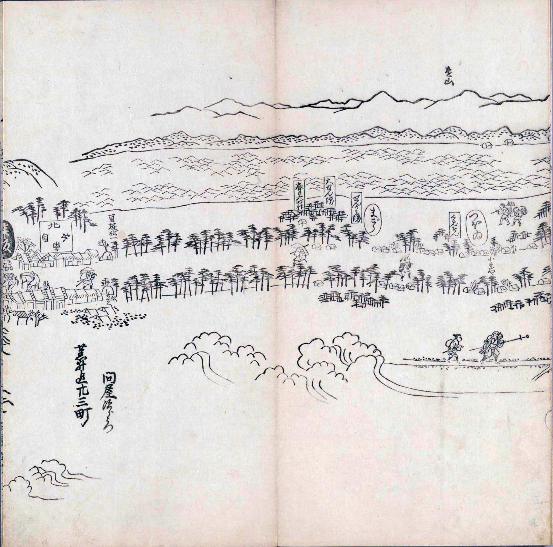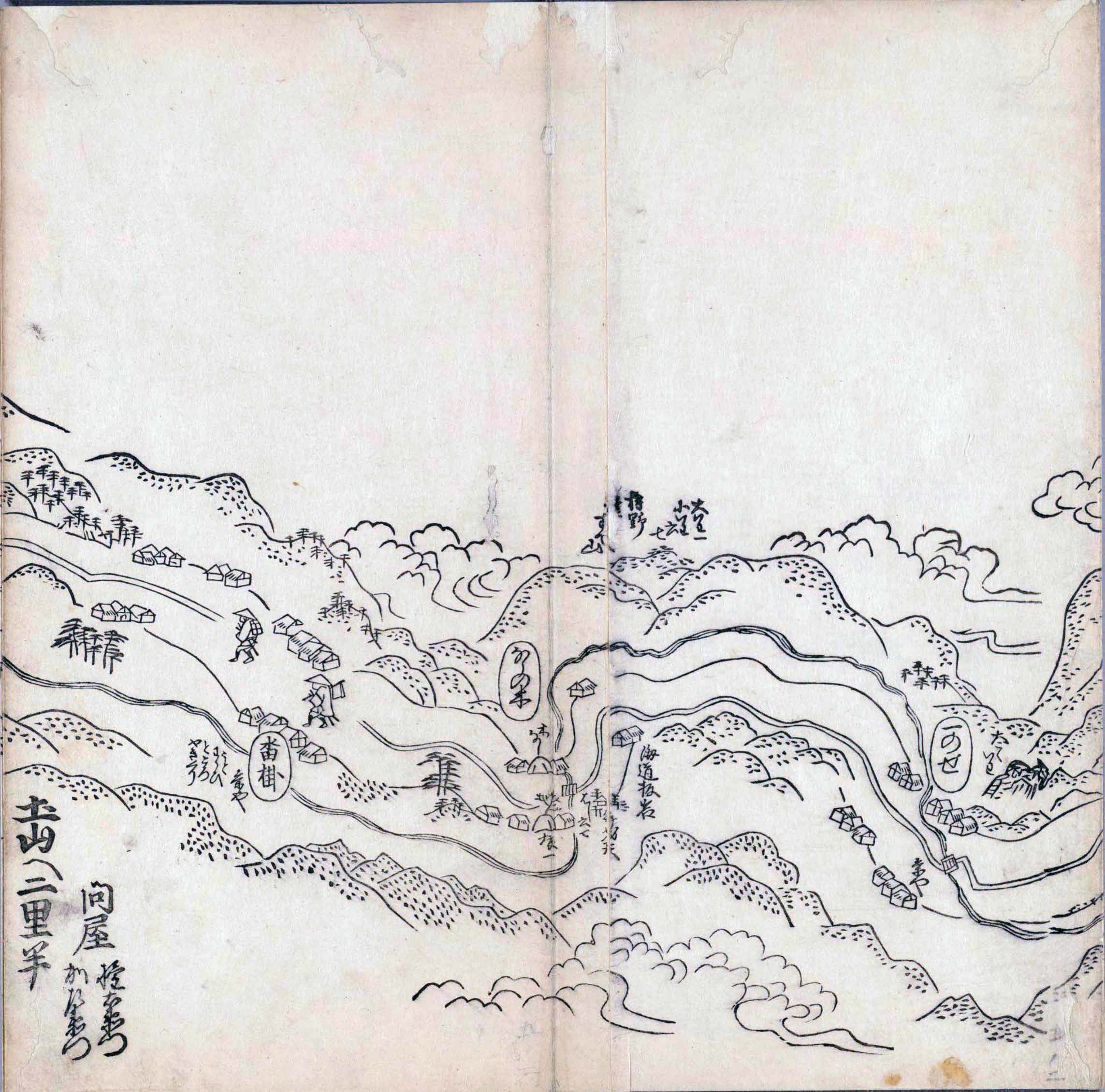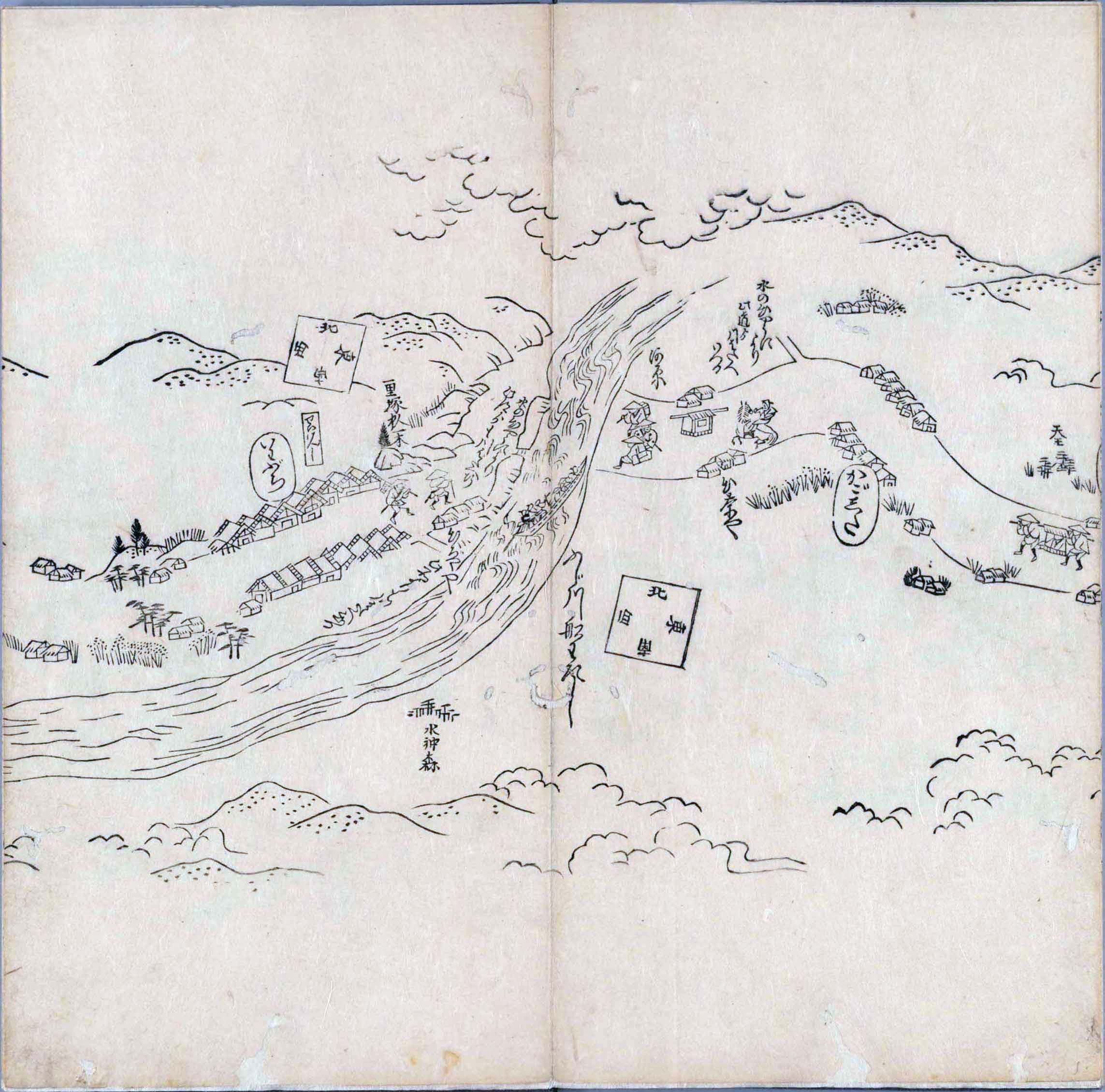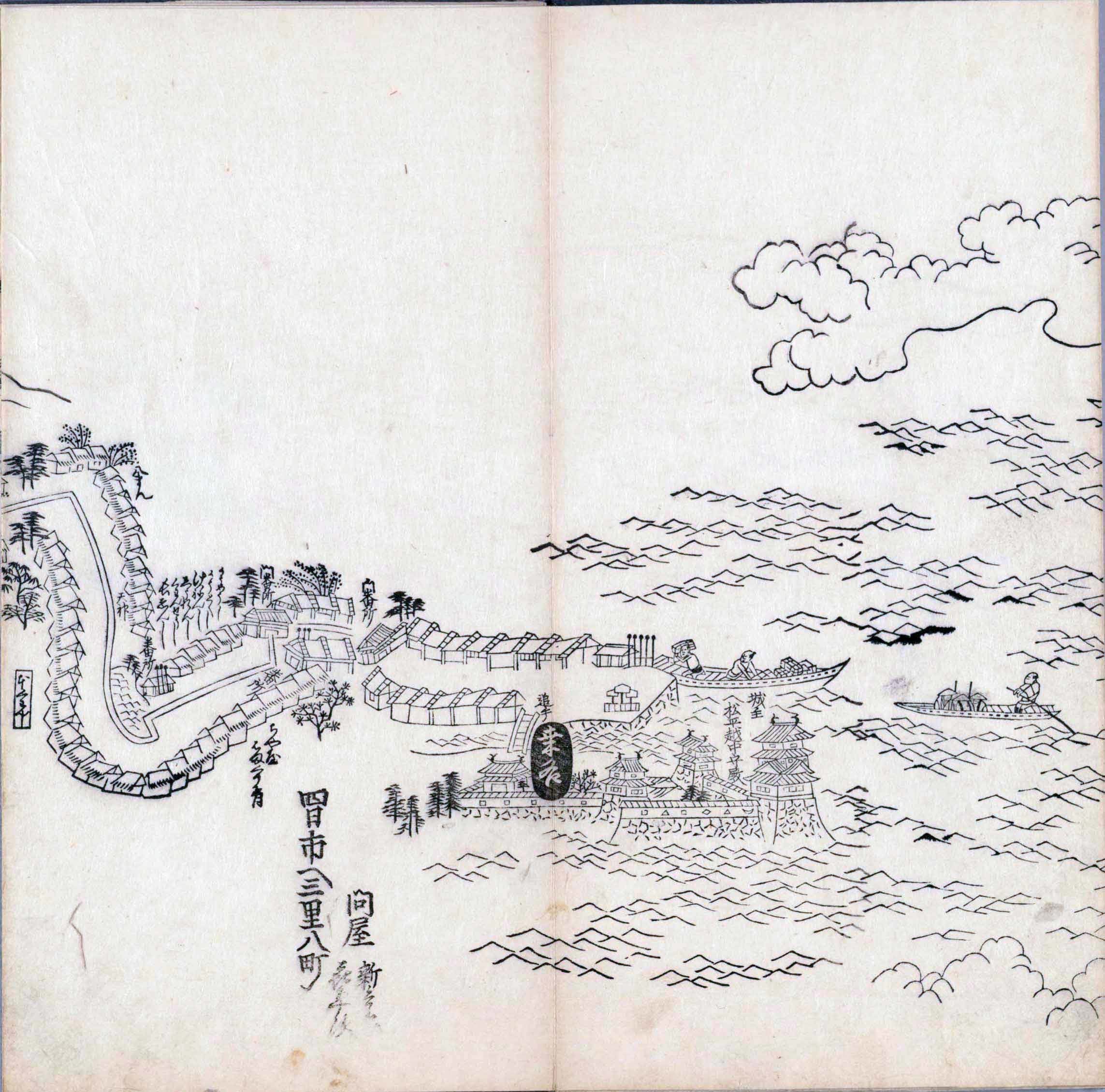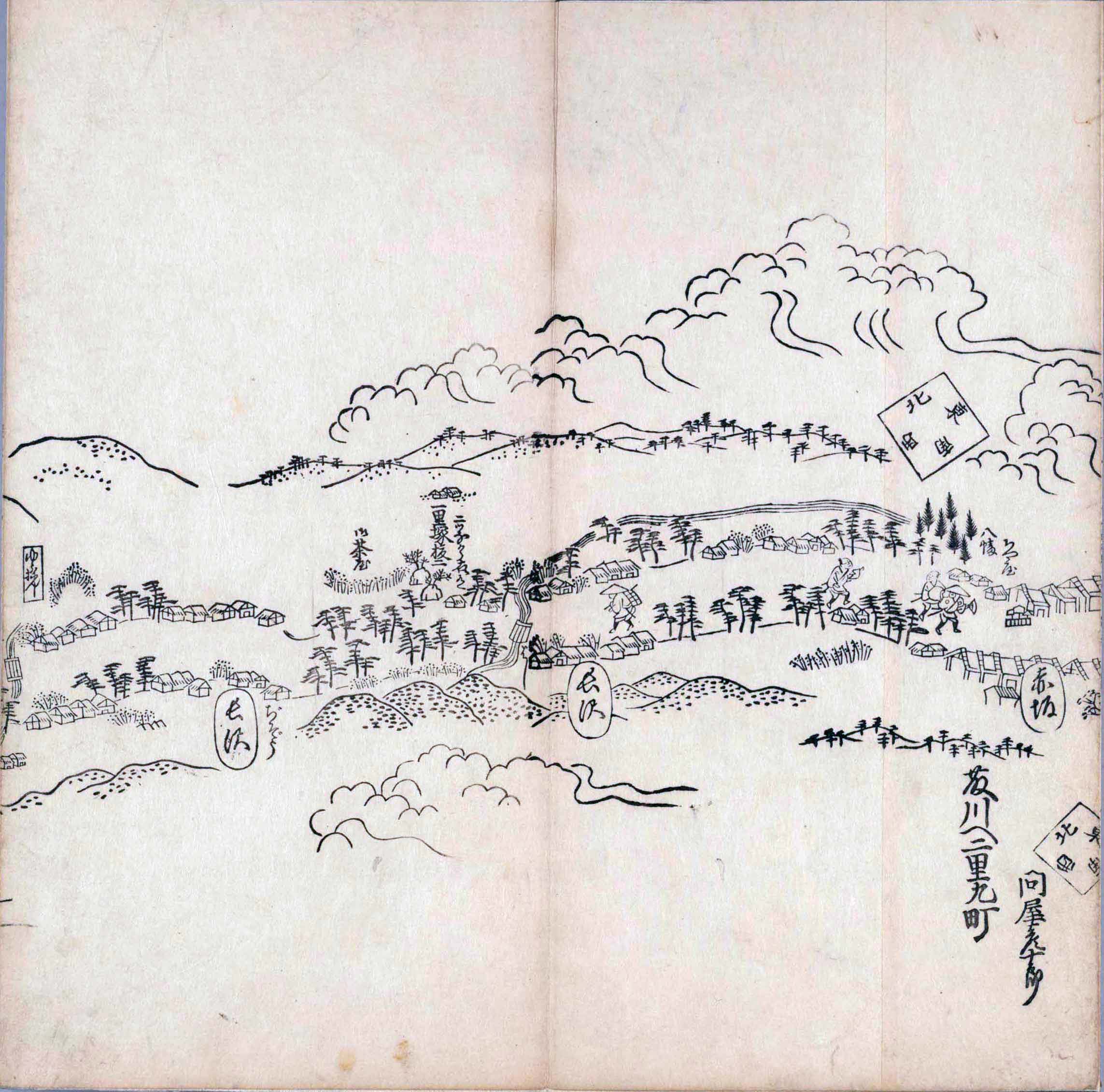 其他、一分四拾間の懐中の図、考と雖ども分厘のただえなし。故に上一下万人に至る迄、一同の名誉を唱ること勿論也去るに依り道印に因んで東海道五十三次の道法分間に顕し而、所々の景、村付け、馬次、家並、名所、旧跡、山川、海道、微細に考え、既に板行令と清書を画師菱河氏に請う。時に彼師云う指図計りにては通達の慰用共ならず。唯右の図を風俗に顕し、うるわしきを以って高位の簾中、下劣の女童に至迄、明鏡に向かいて自面之みるがごとくならしめん。と功筆を抜す。