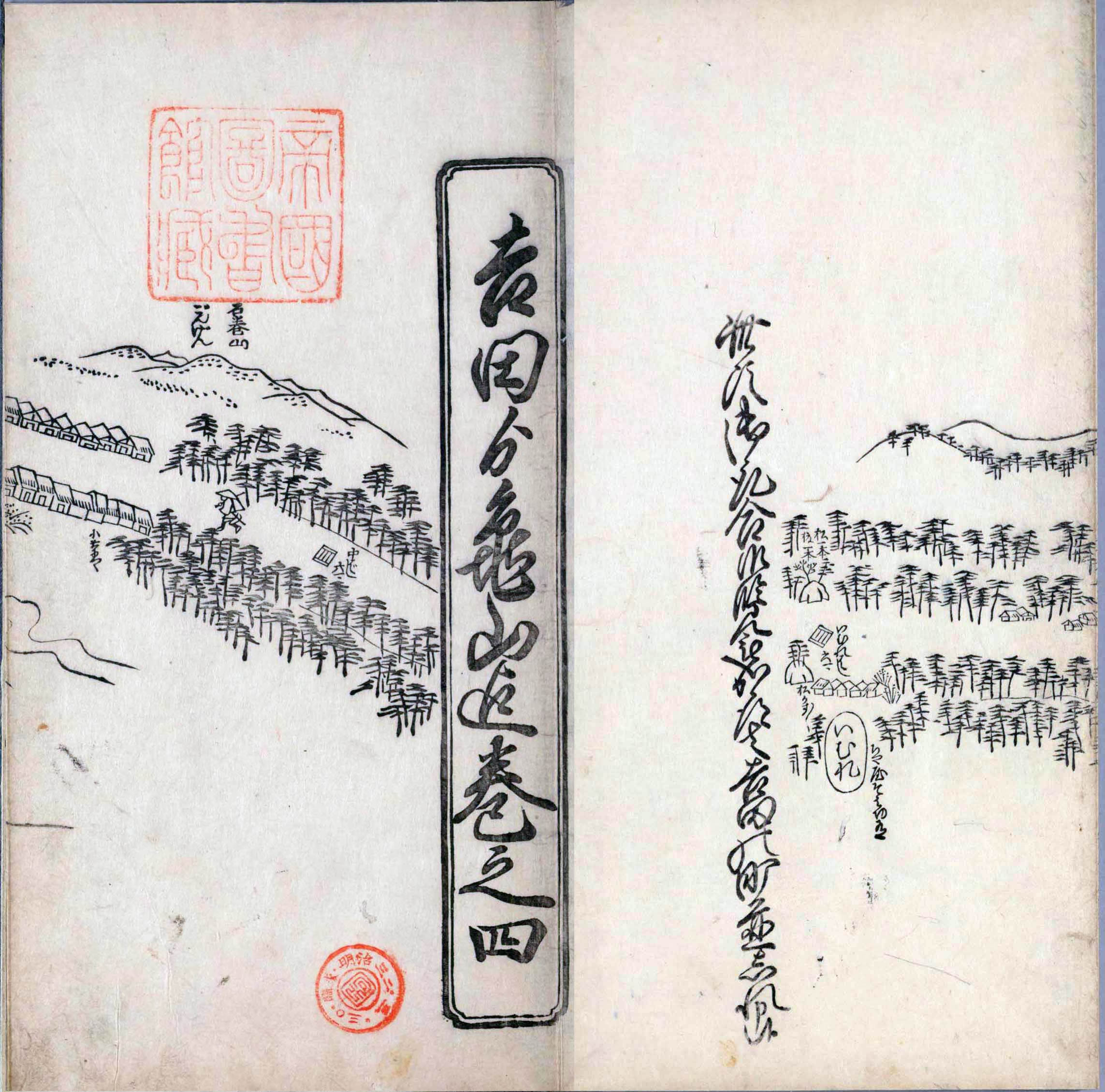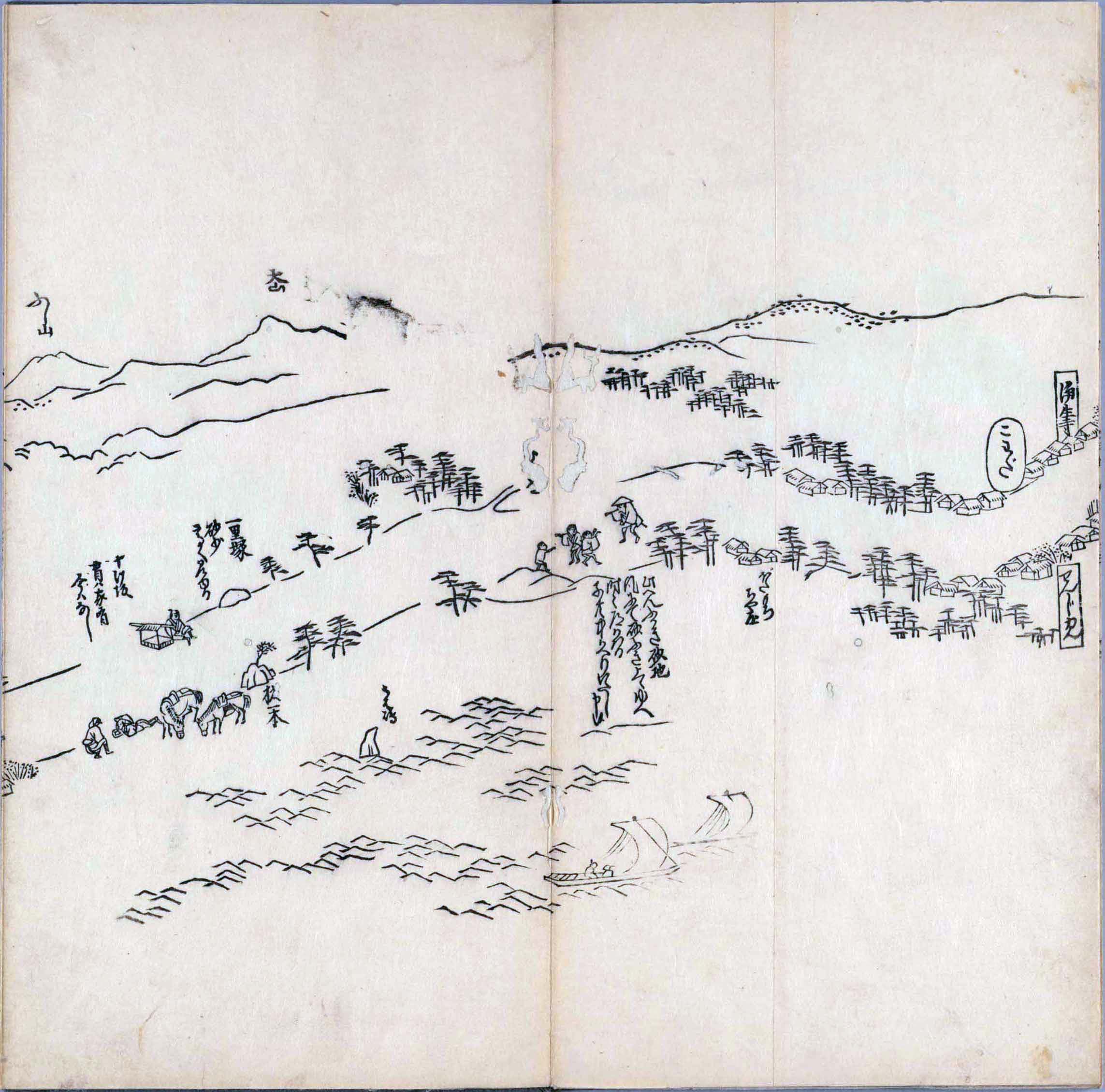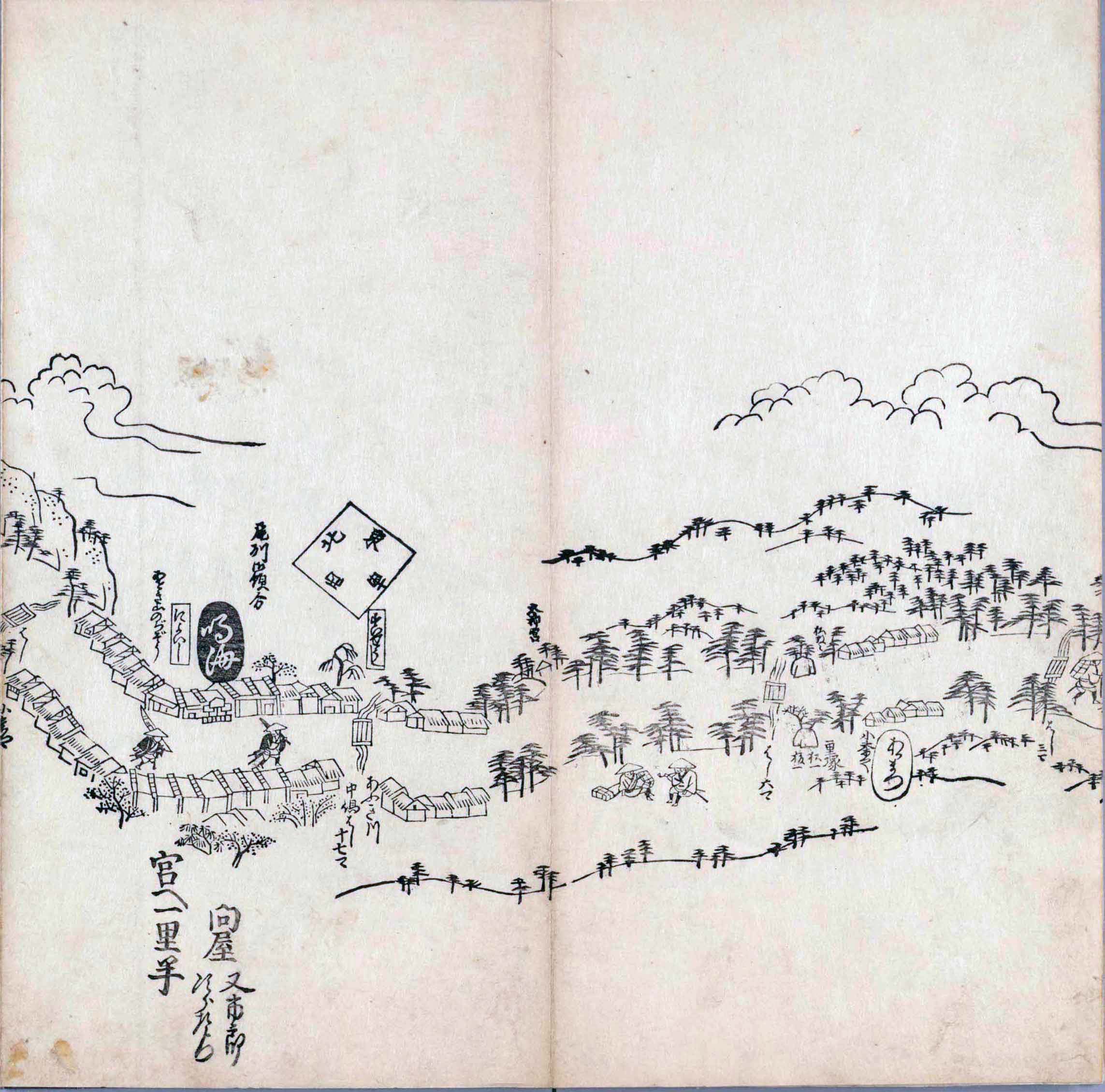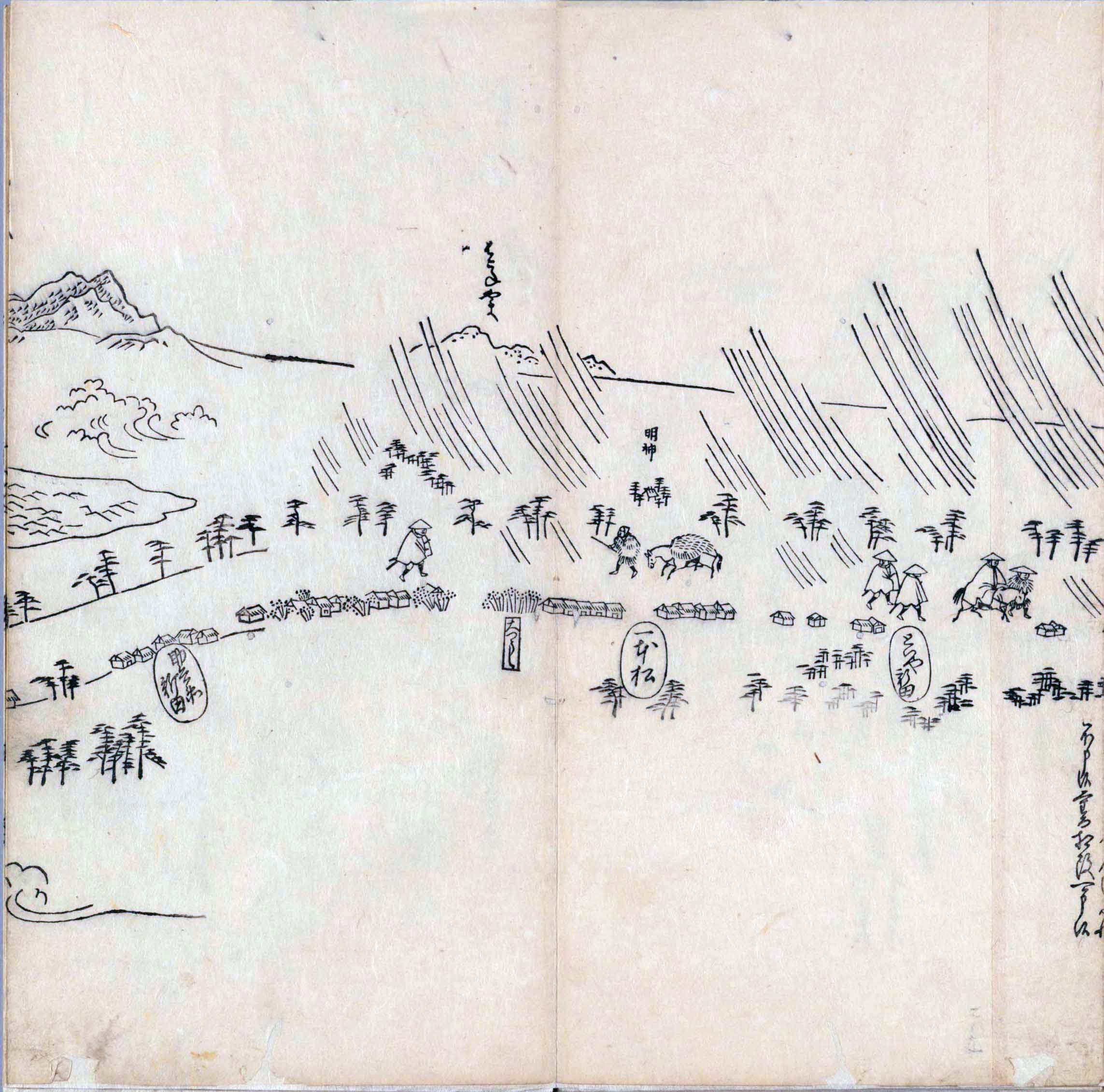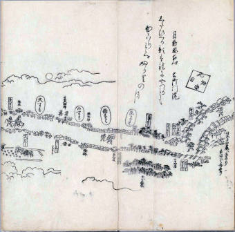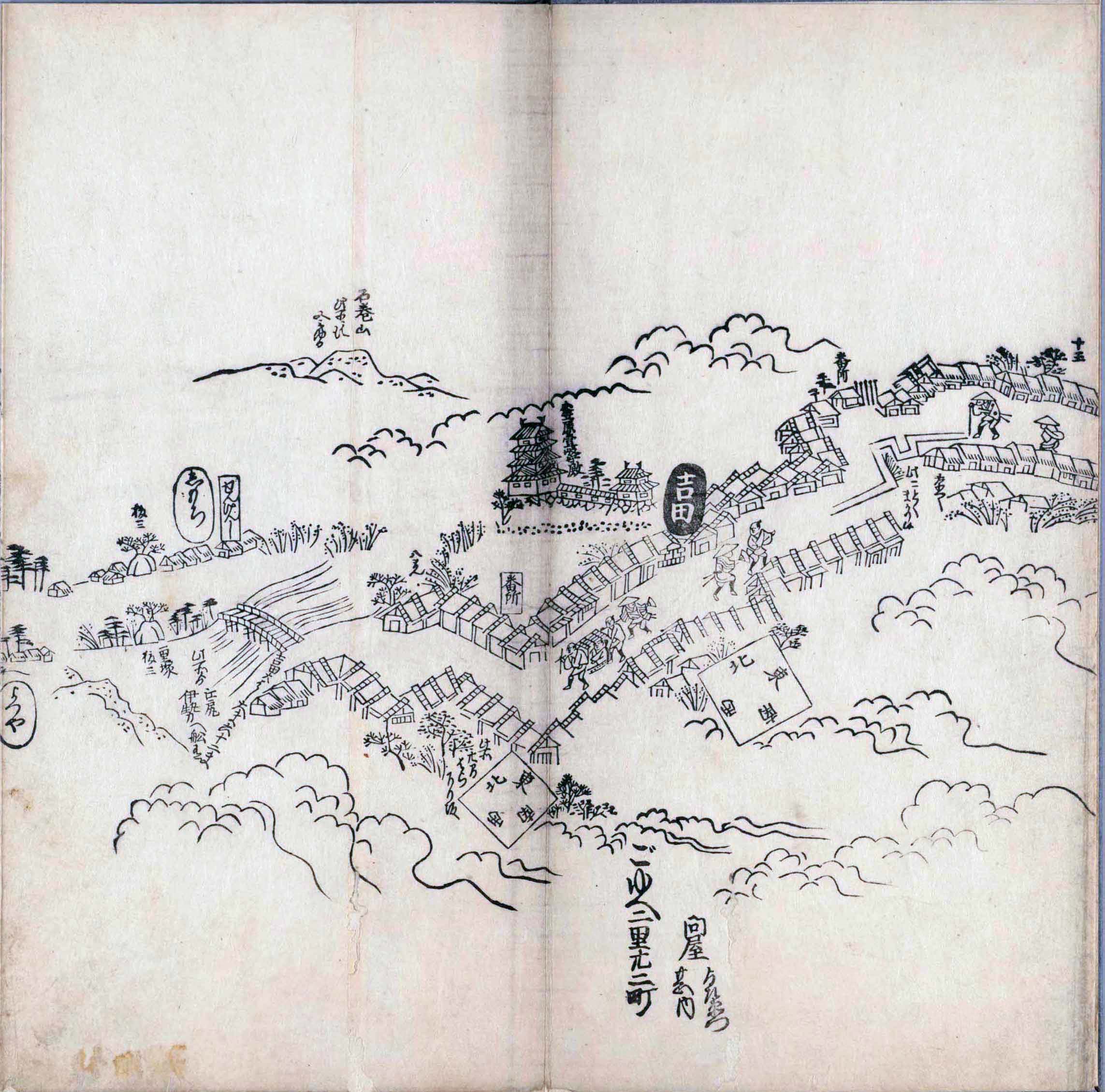 其他、一分四拾間の懐中の図、考と雖ども分厘のただえなし。故に上一下万人に至る迄、一同の名誉を唱ること勿論也去るに依り道印に因んで東海道五十三次の道法分間に顕し而、所々の景、村付け、馬次、家並、名所、旧跡、山川、海道、微細に考え、既に板行令と清書を画師菱河氏に請う。時に彼師云う指図計りにては通達の慰用共ならず。唯右の図を風俗に顕し、うるわしきを以って高位の簾中、下劣の女童に至迄、明鏡に向かいて自面之みるがごとくならしめん。と功筆を抜す。