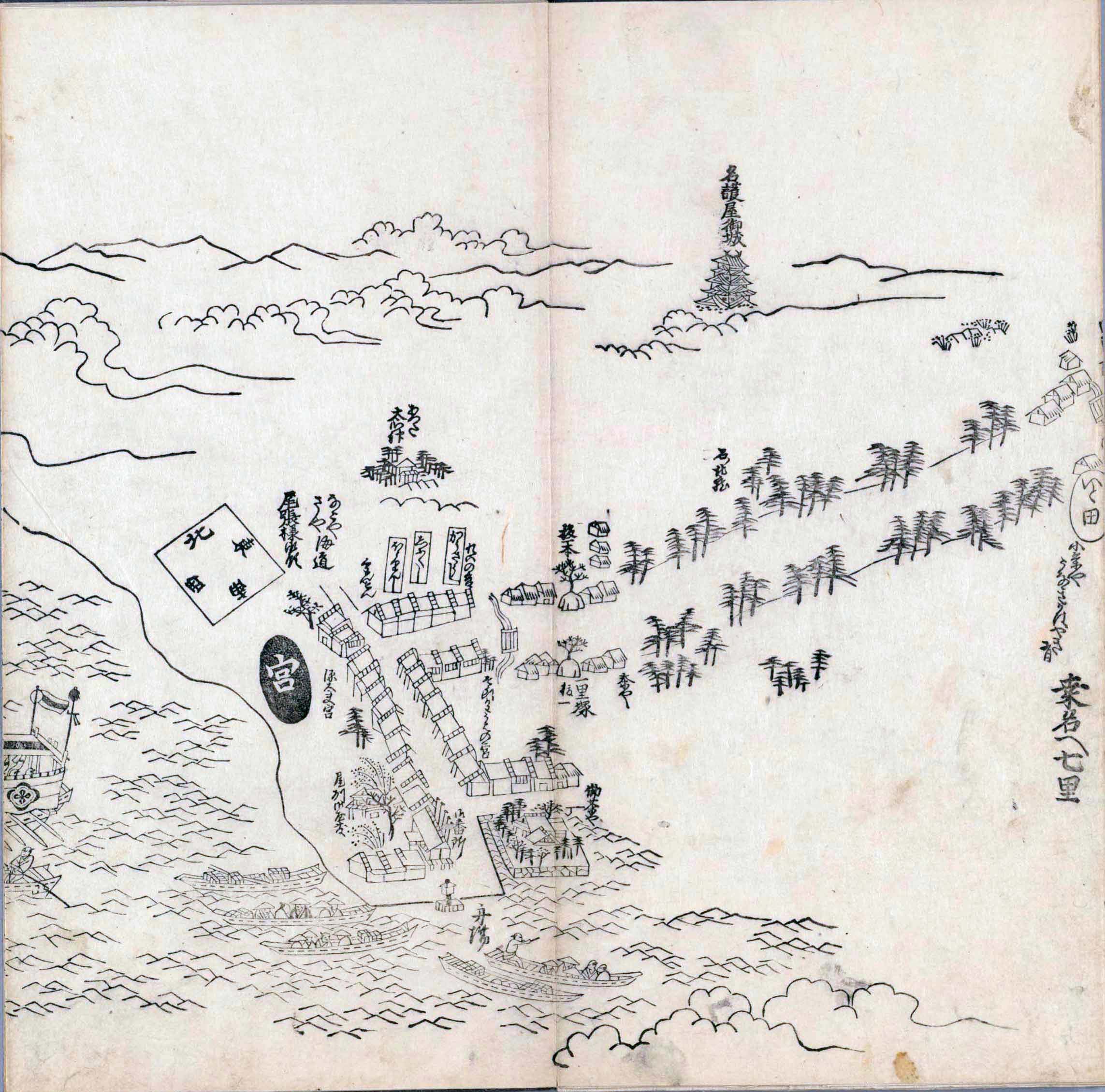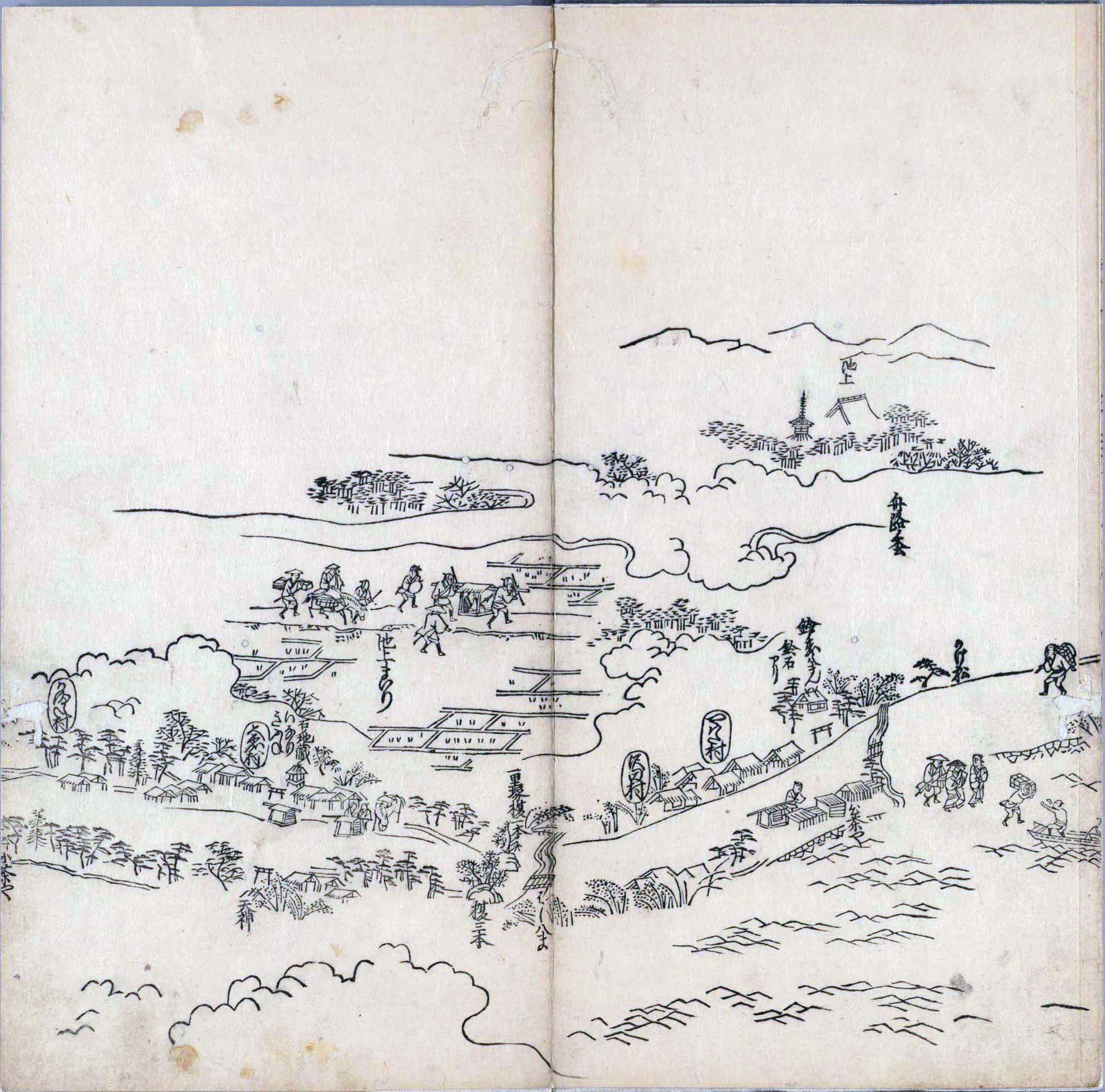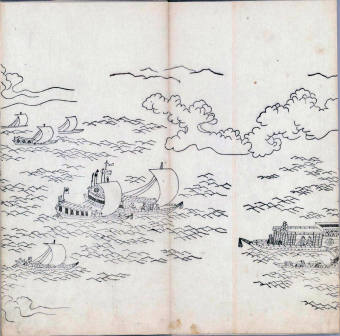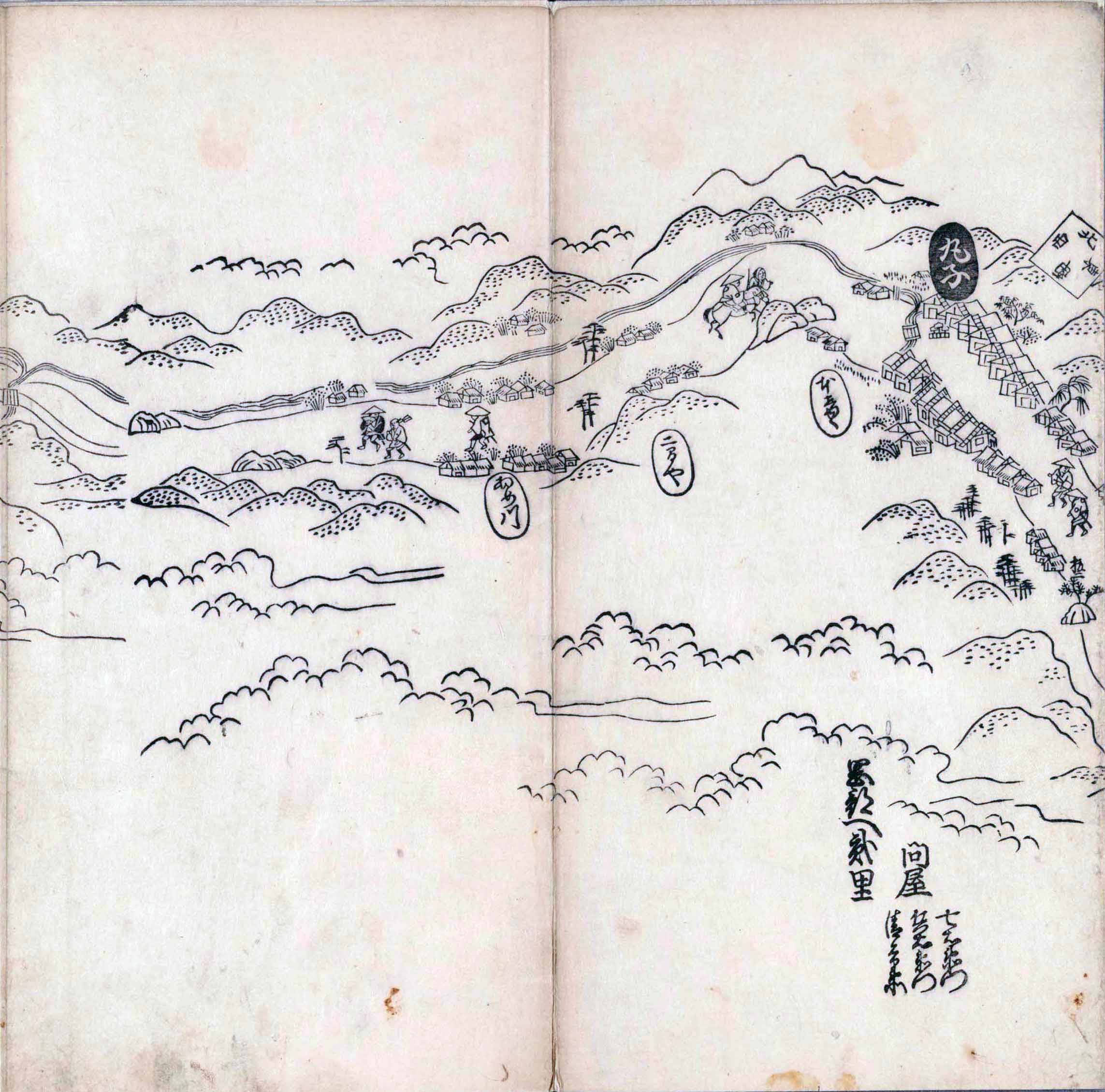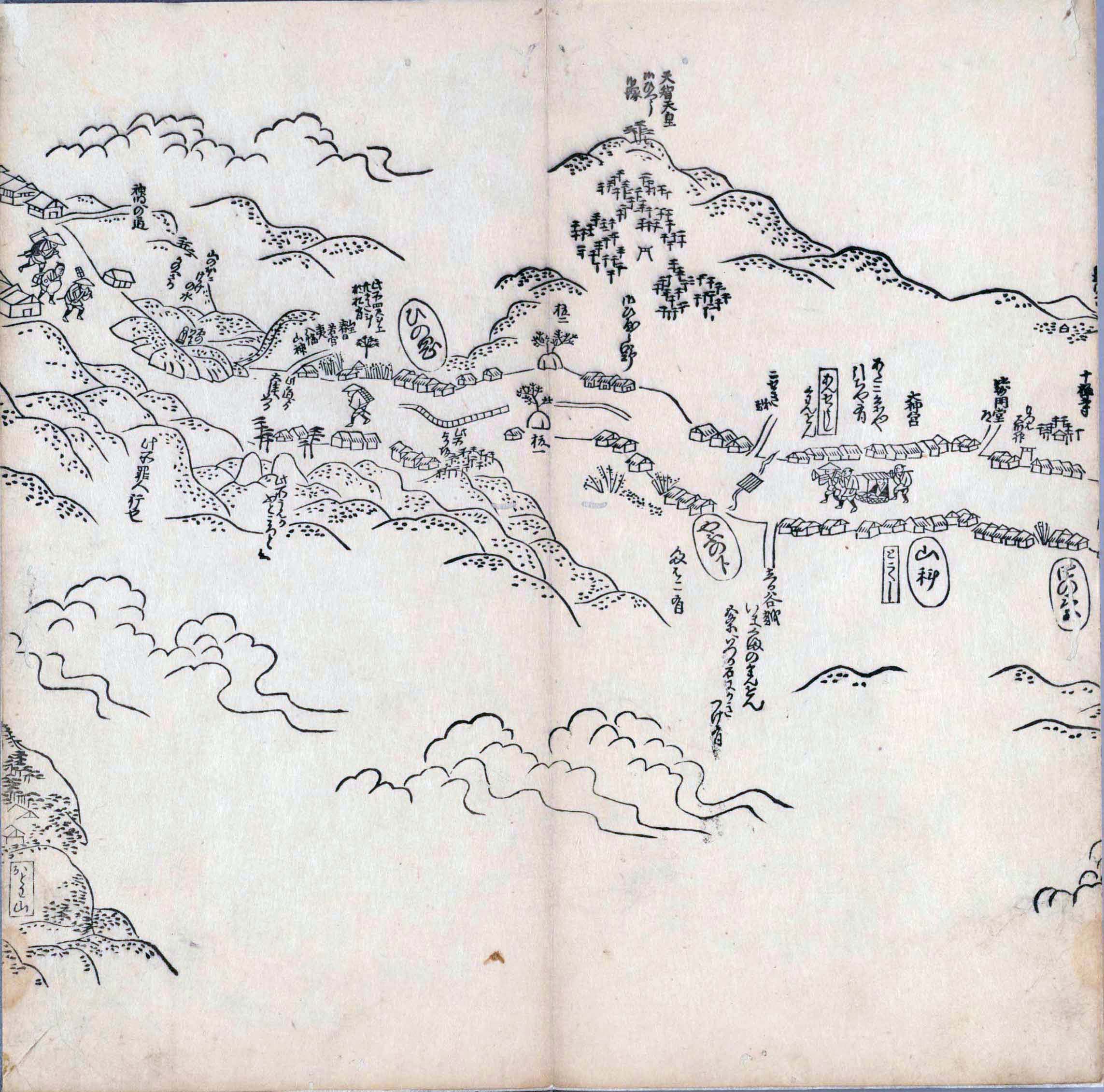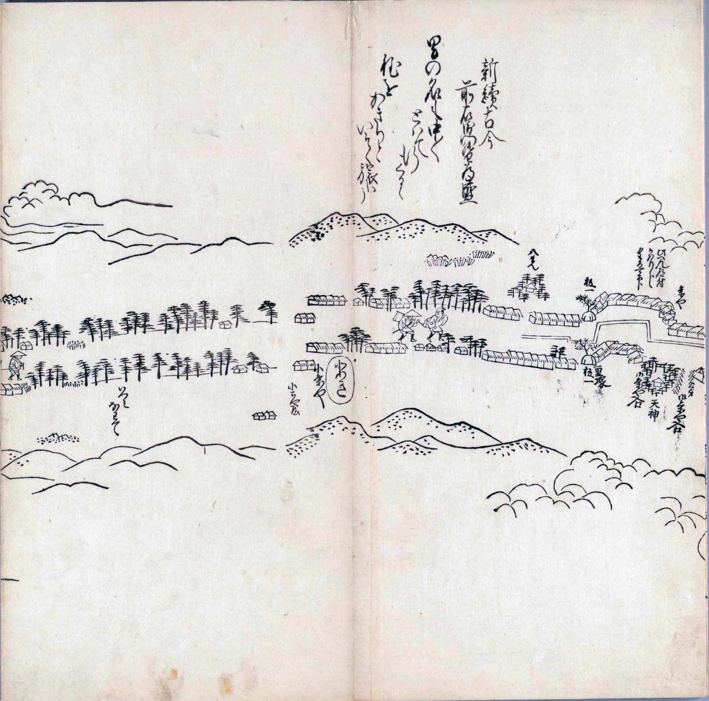 其他、一分四拾間の懐中の図、考と雖ども分厘のただえなし。故に上一下万人に至る迄、一同の名誉を唱ること勿論也去るに依り道印に因んで東海道五十三次の道法分間に顕し而、所々の景、村付け、馬次、家並、名所、旧跡、山川、海道、微細に考え、既に板行令と清書を画師菱河氏に請う。時に彼師云う指図計りにては通達の慰用共ならず。唯右の図を風俗に顕し、うるわしきを以って高位の簾中、下劣の女童に至迄、明鏡に向かいて自面之みるがごとくならしめん。と功筆を抜す。