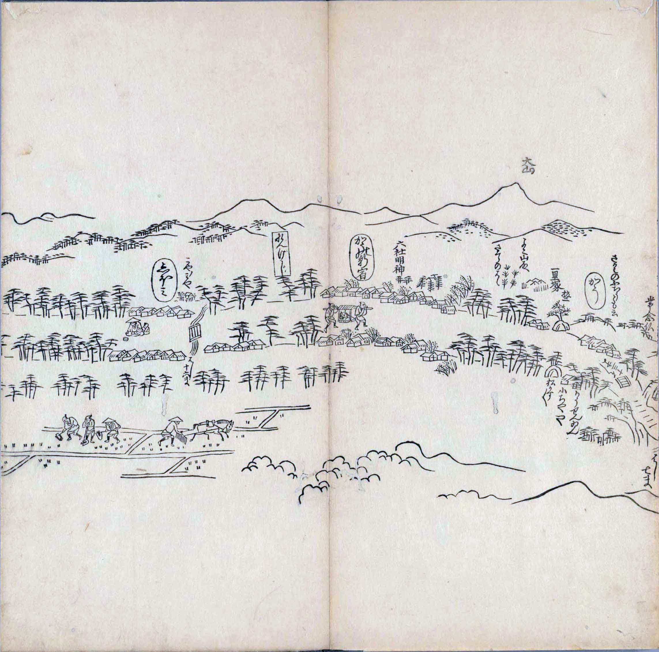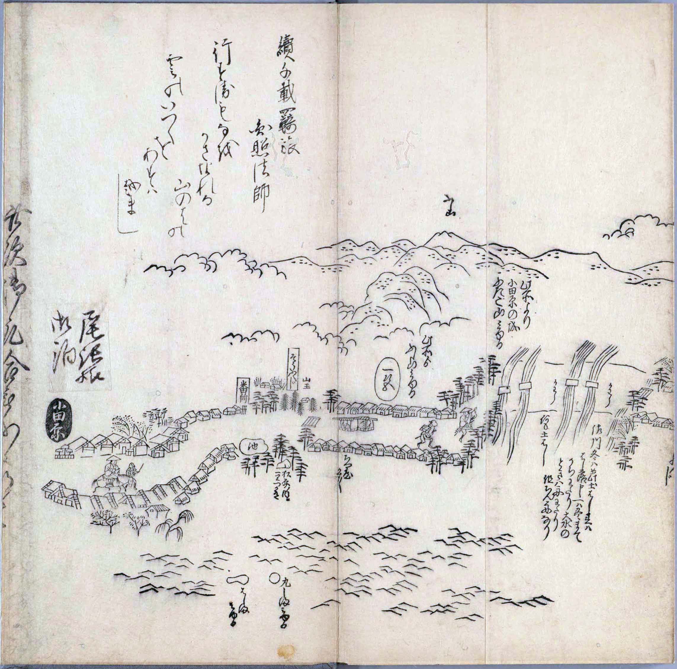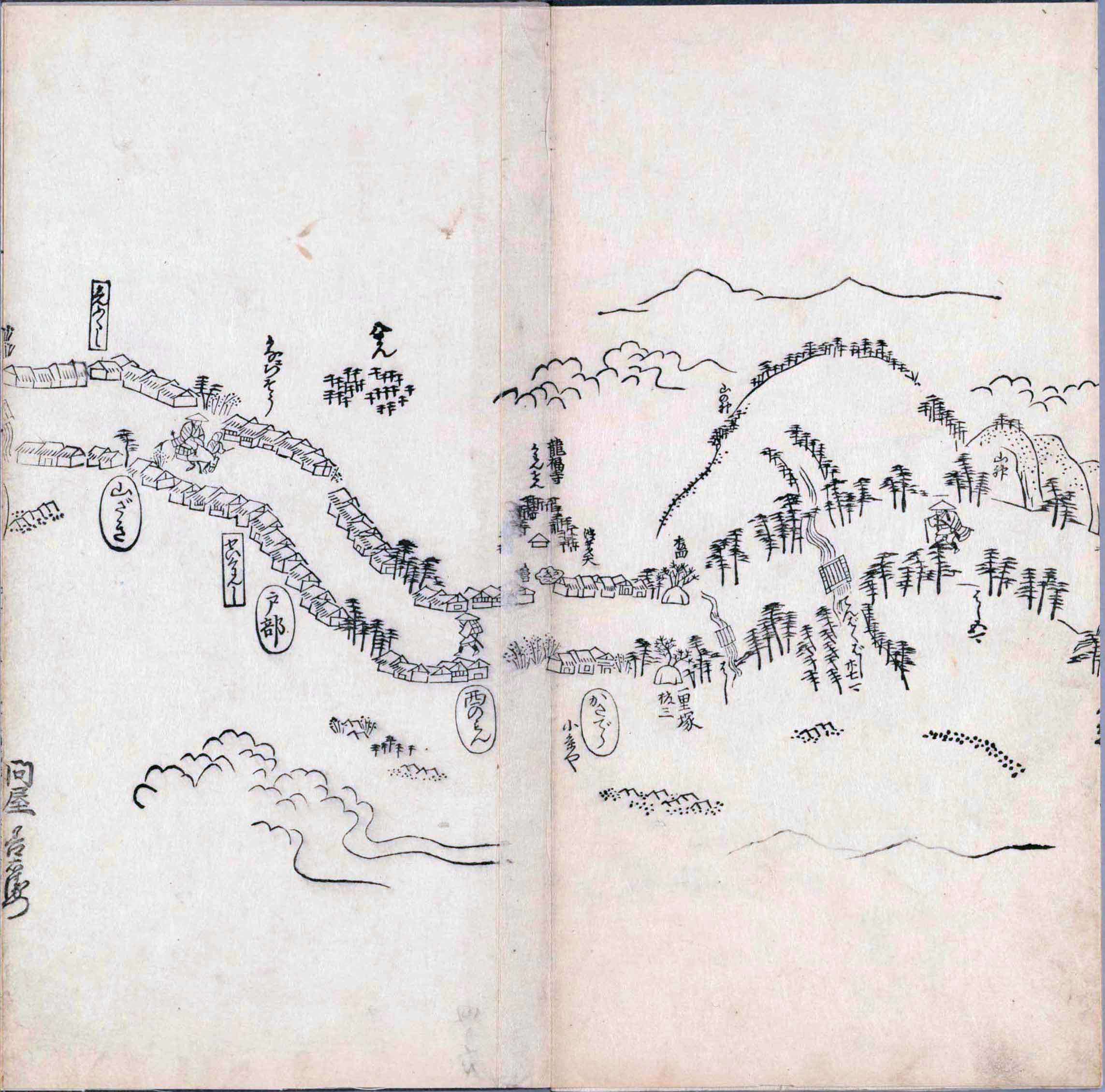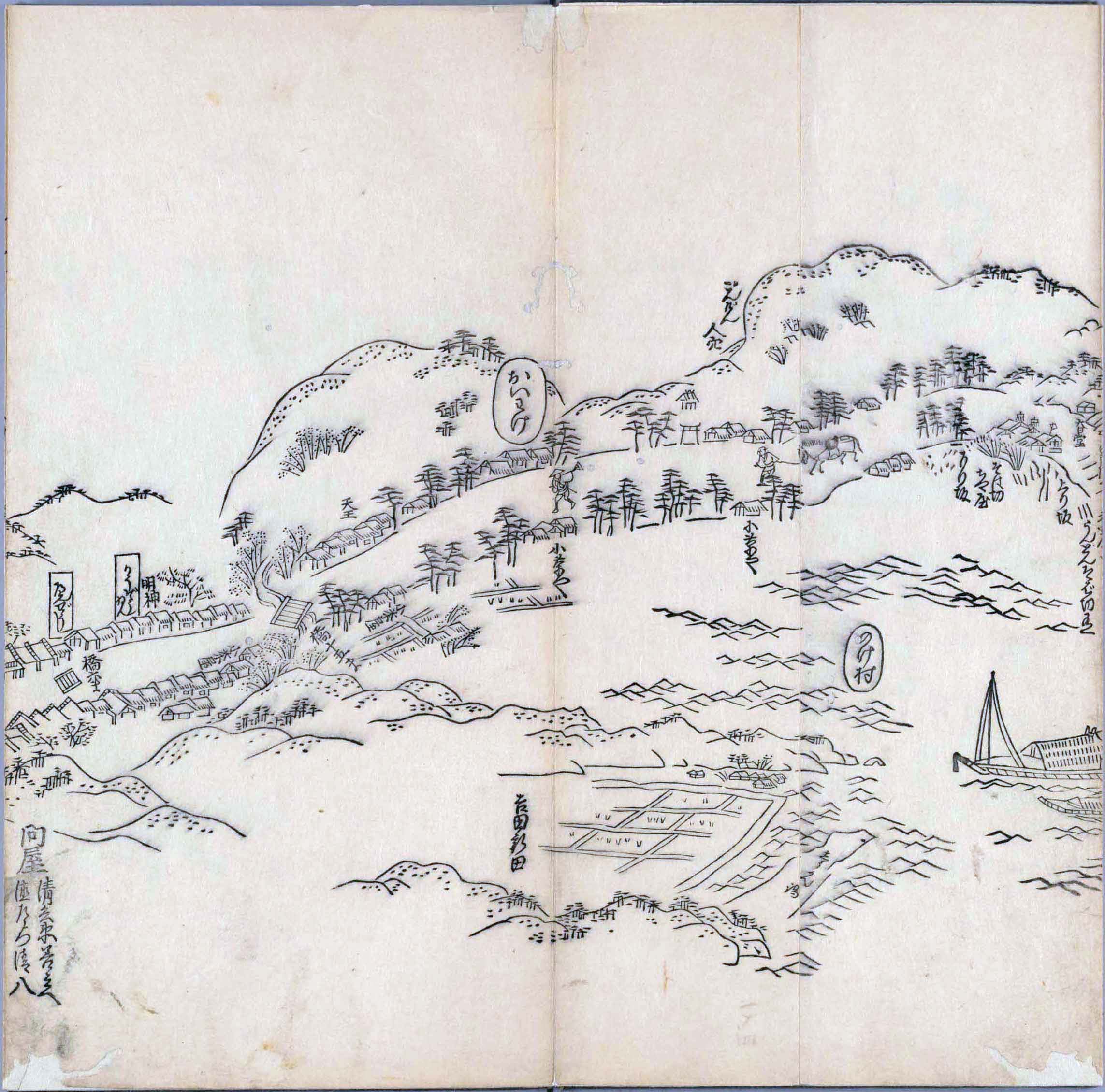 其他、一分四拾間の懐中の図、考と雖ども分厘のただえなし。故に上一下万人に至る迄、一同の名誉を唱ること勿論也去るに依り道印に因んで東海道五十三次の道法分間に顕し而、所々の景、村付け、馬次、家並、名所、旧跡、山川、海道、微細に考え、既に板行令と清書を画師菱河氏に請う。時に彼師云う指図計りにては通達の慰用共ならず。唯右の図を風俗に顕し、うるわしきを以って高位の簾中、下劣の女童に至迄、明鏡に向かいて自面之みるがごとくならしめん。と功筆を抜す。