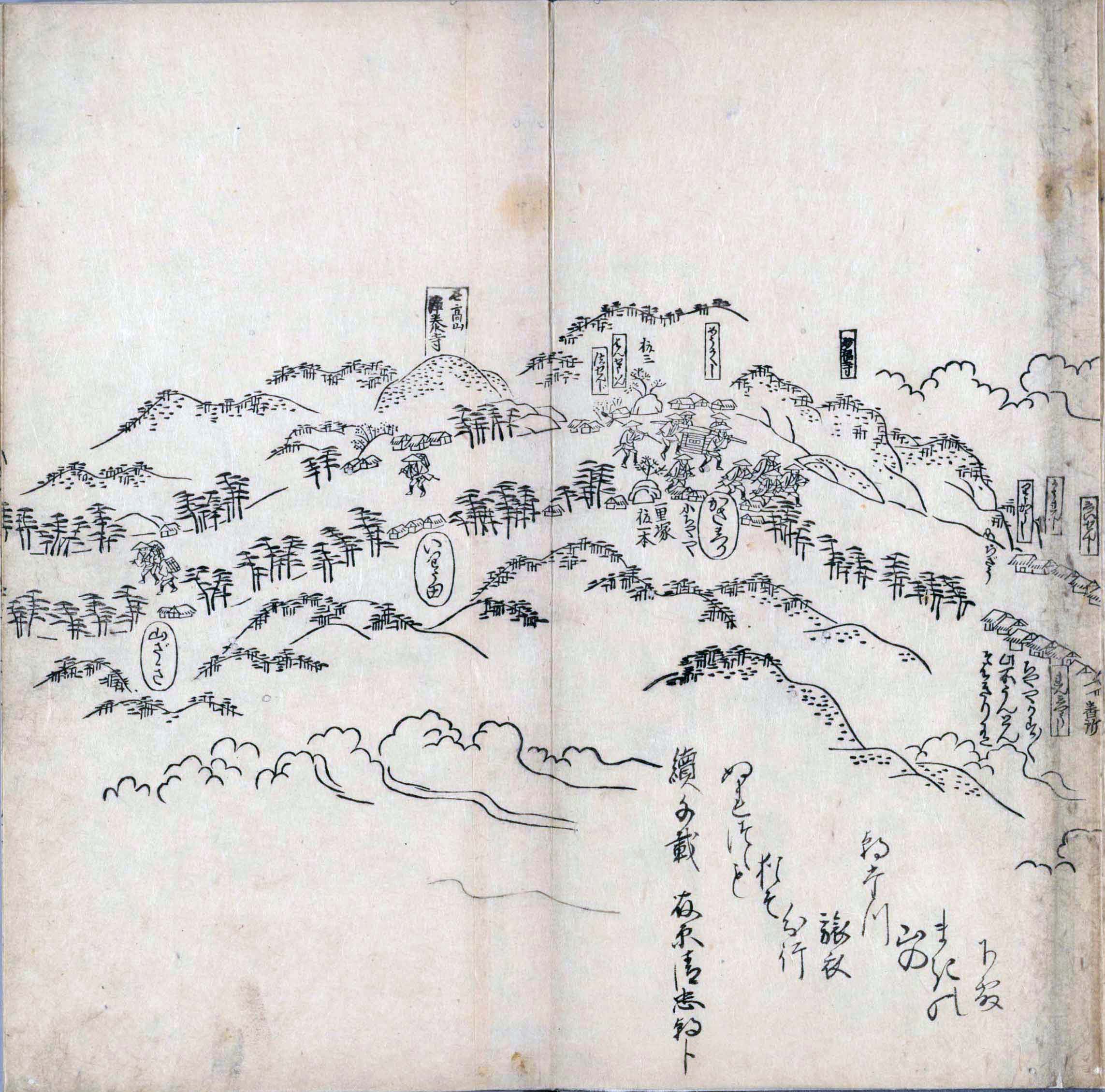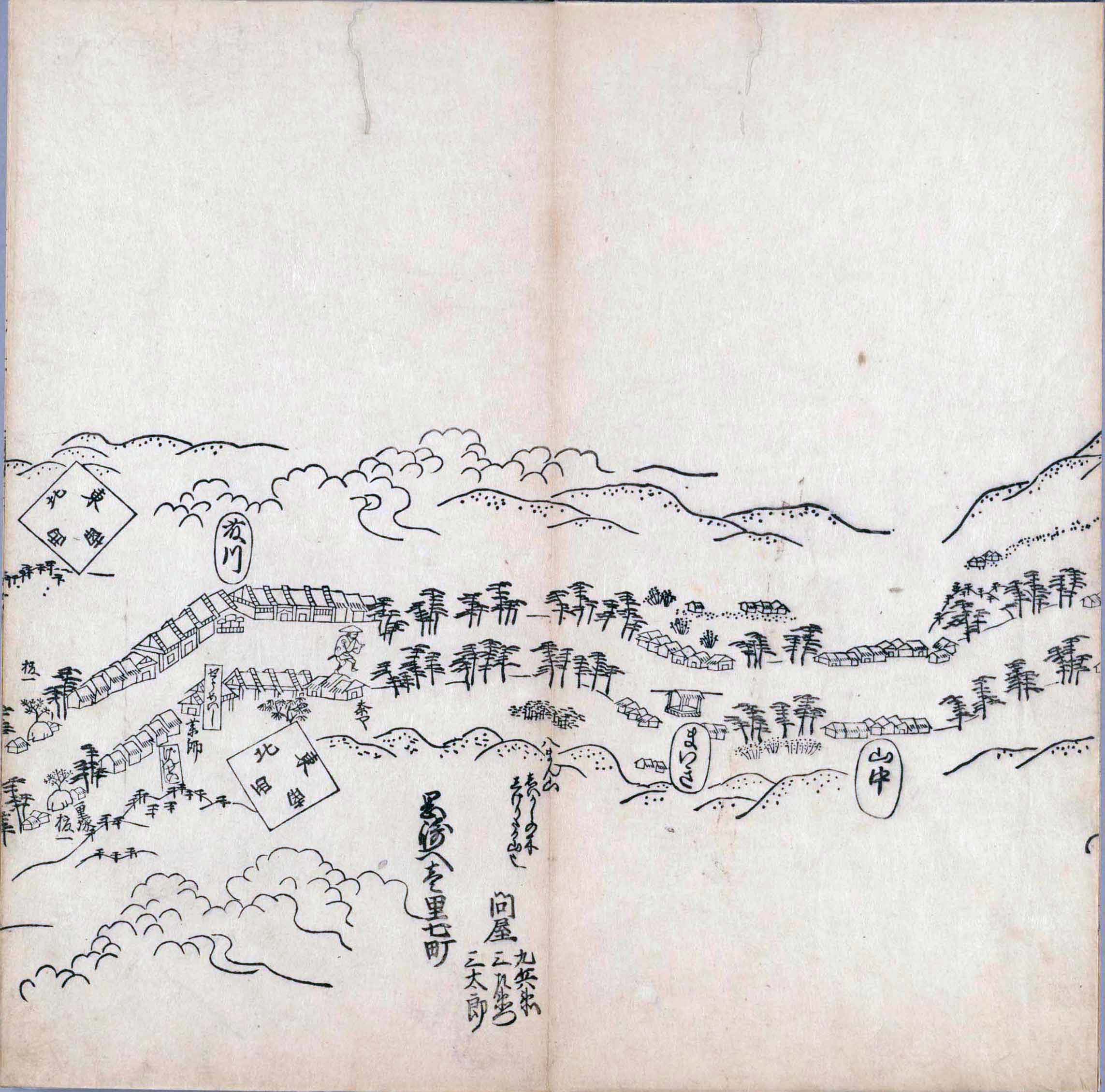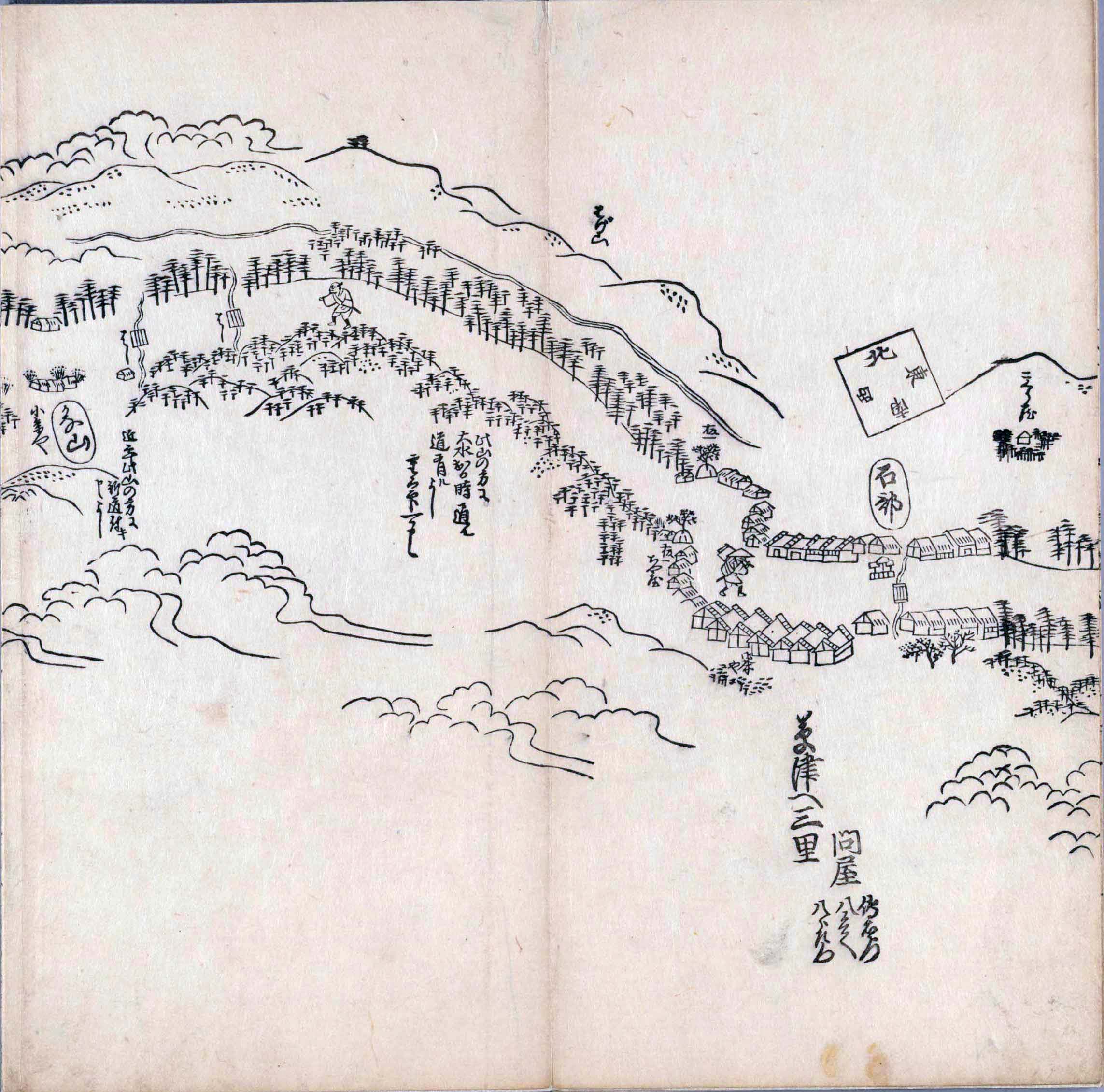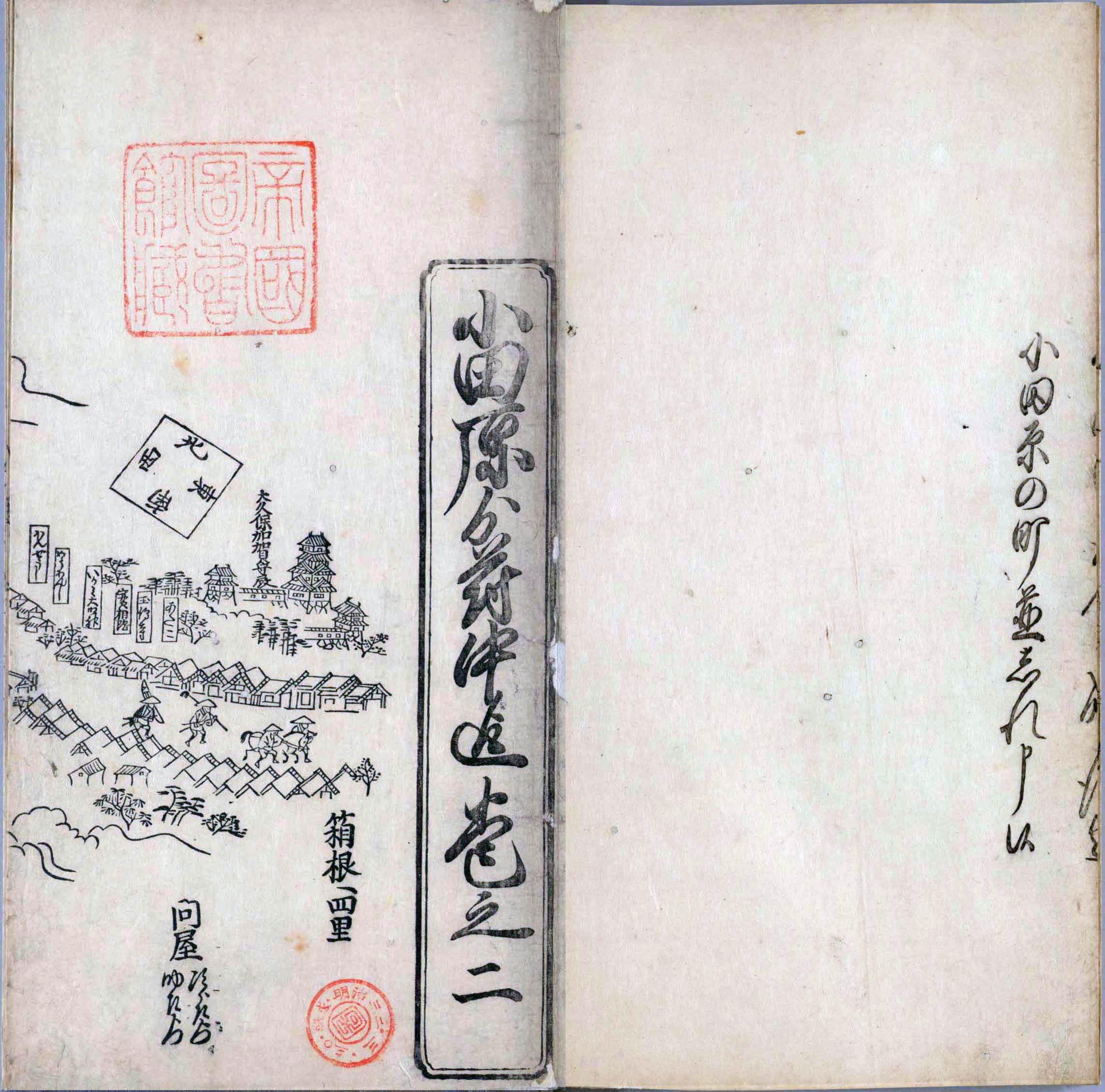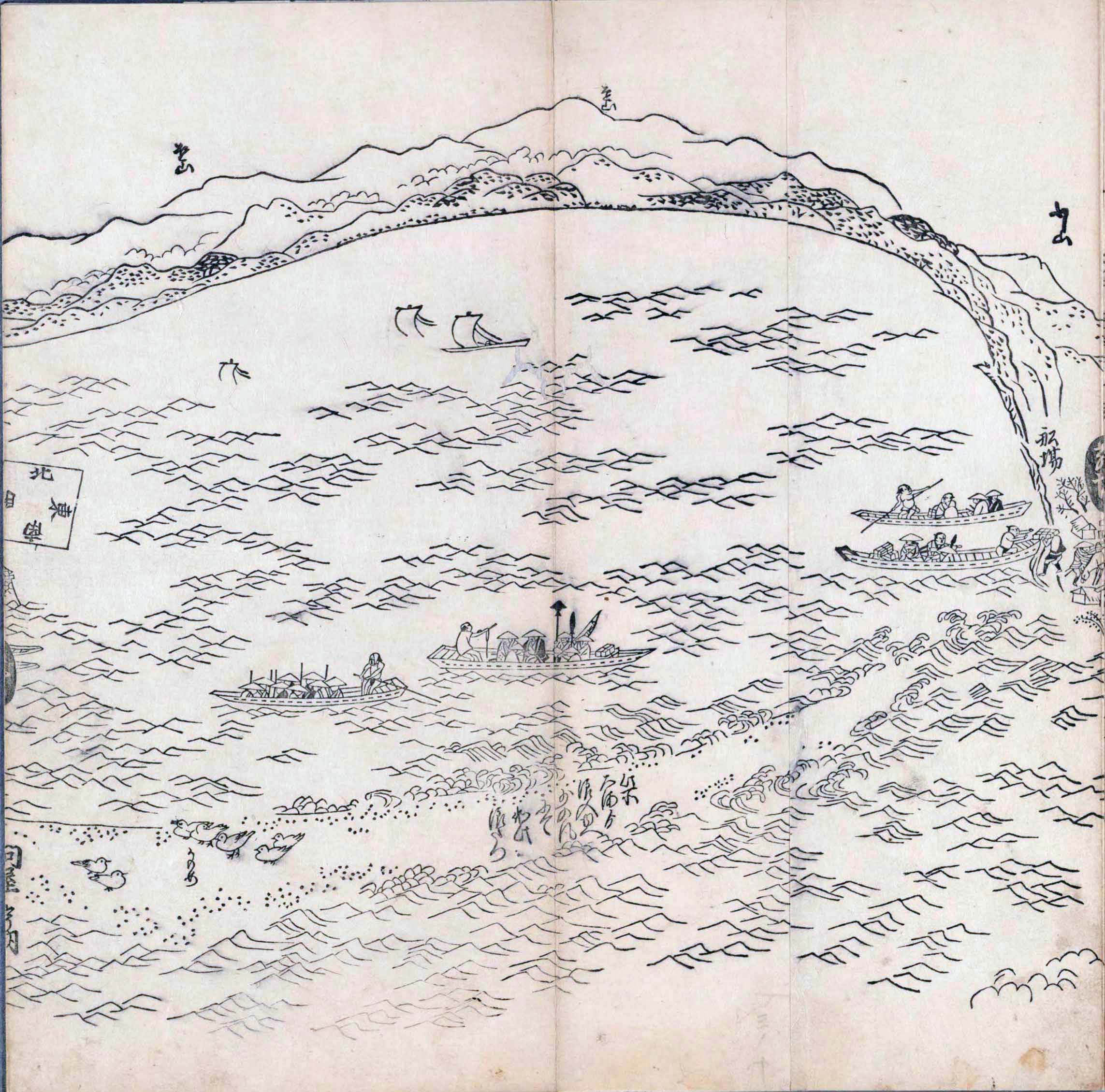 其他、一分四拾間の懐中の図、考と雖ども分厘のただえなし。故に上一下万人に至る迄、一同の名誉を唱ること勿論也去るに依り道印に因んで東海道五十三次の道法分間に顕し而、所々の景、村付け、馬次、家並、名所、旧跡、山川、海道、微細に考え、既に板行令と清書を画師菱河氏に請う。時に彼師云う指図計りにては通達の慰用共ならず。唯右の図を風俗に顕し、うるわしきを以って高位の簾中、下劣の女童に至迄、明鏡に向かいて自面之みるがごとくならしめん。と功筆を抜す。