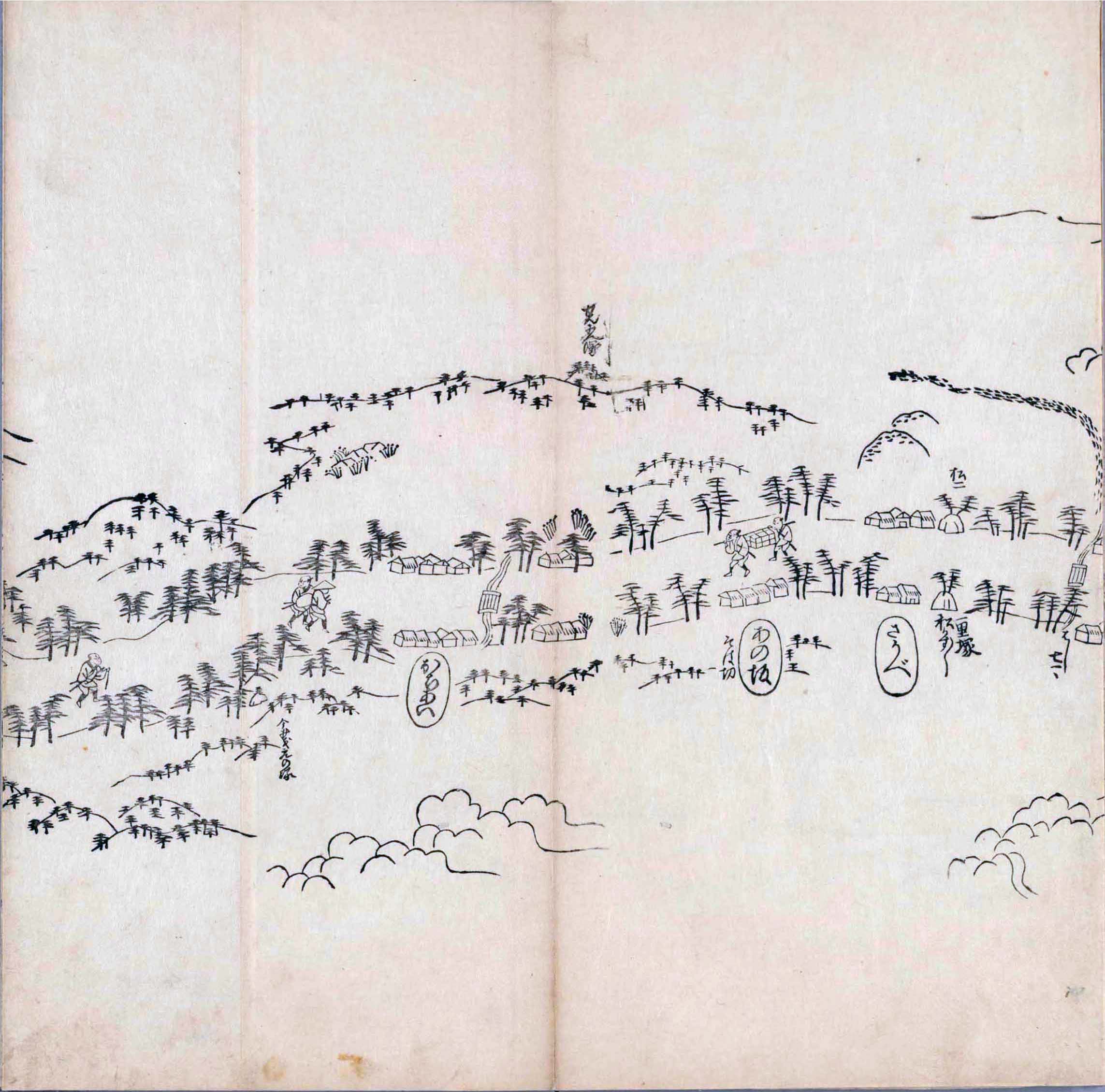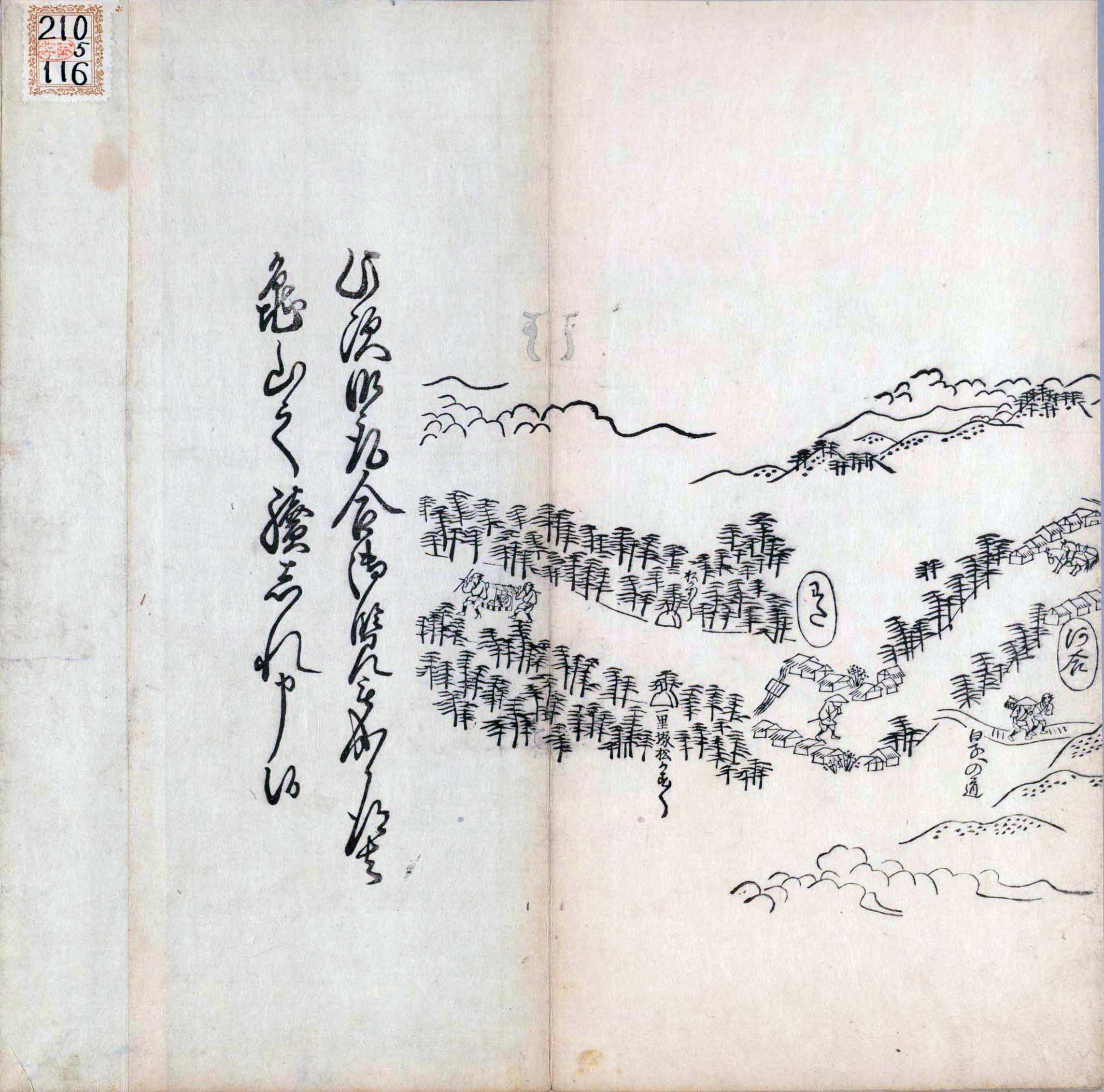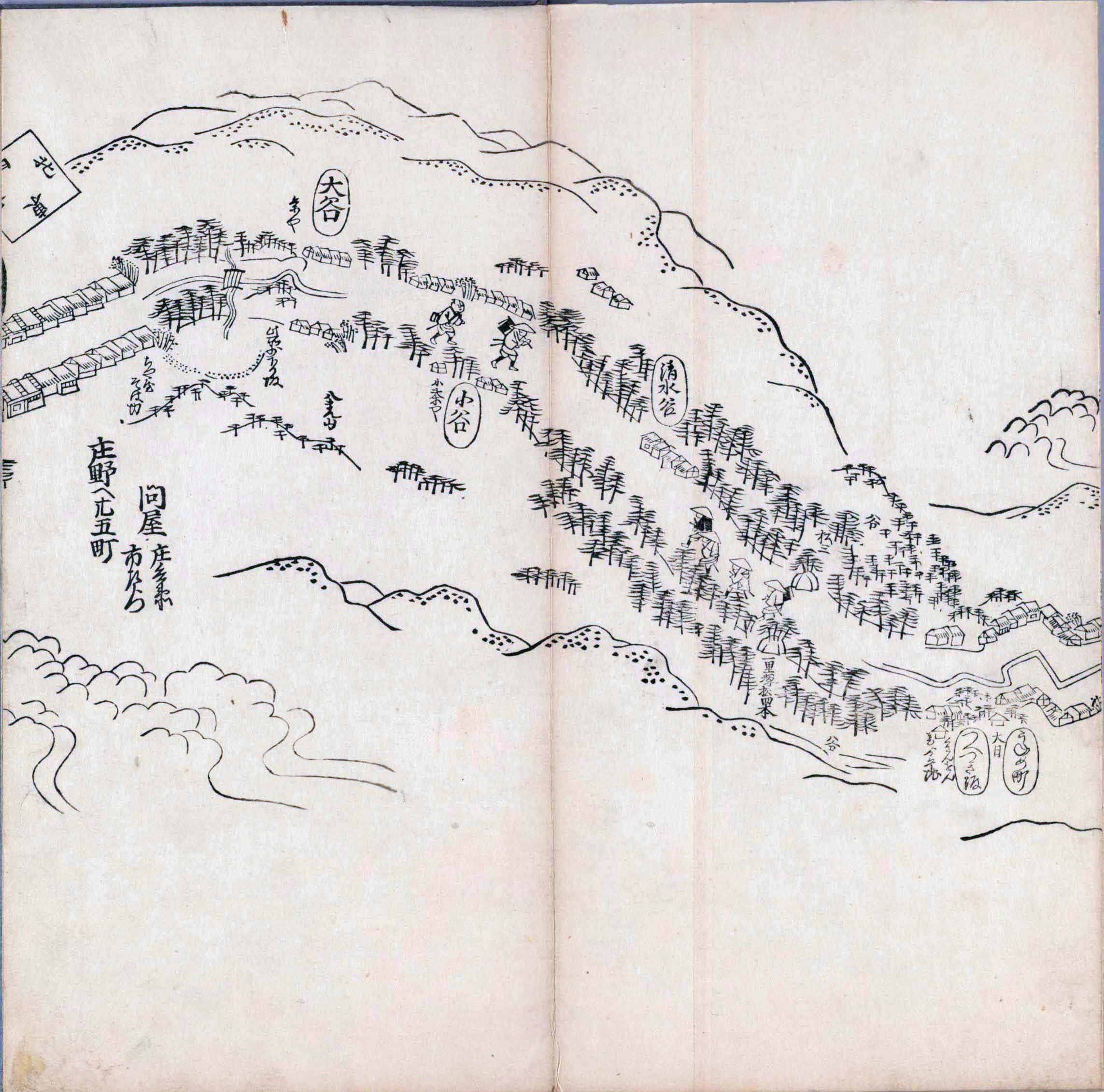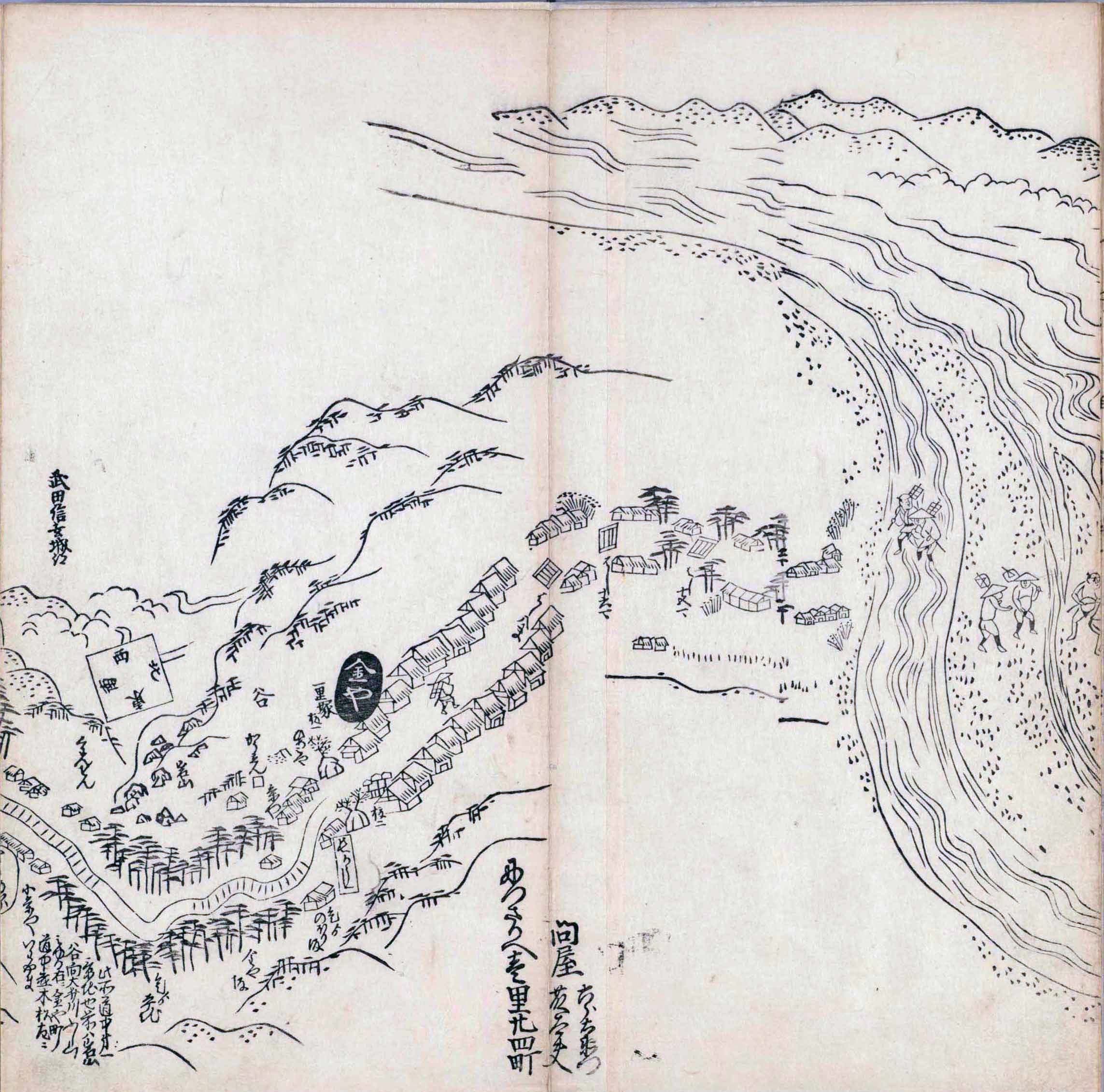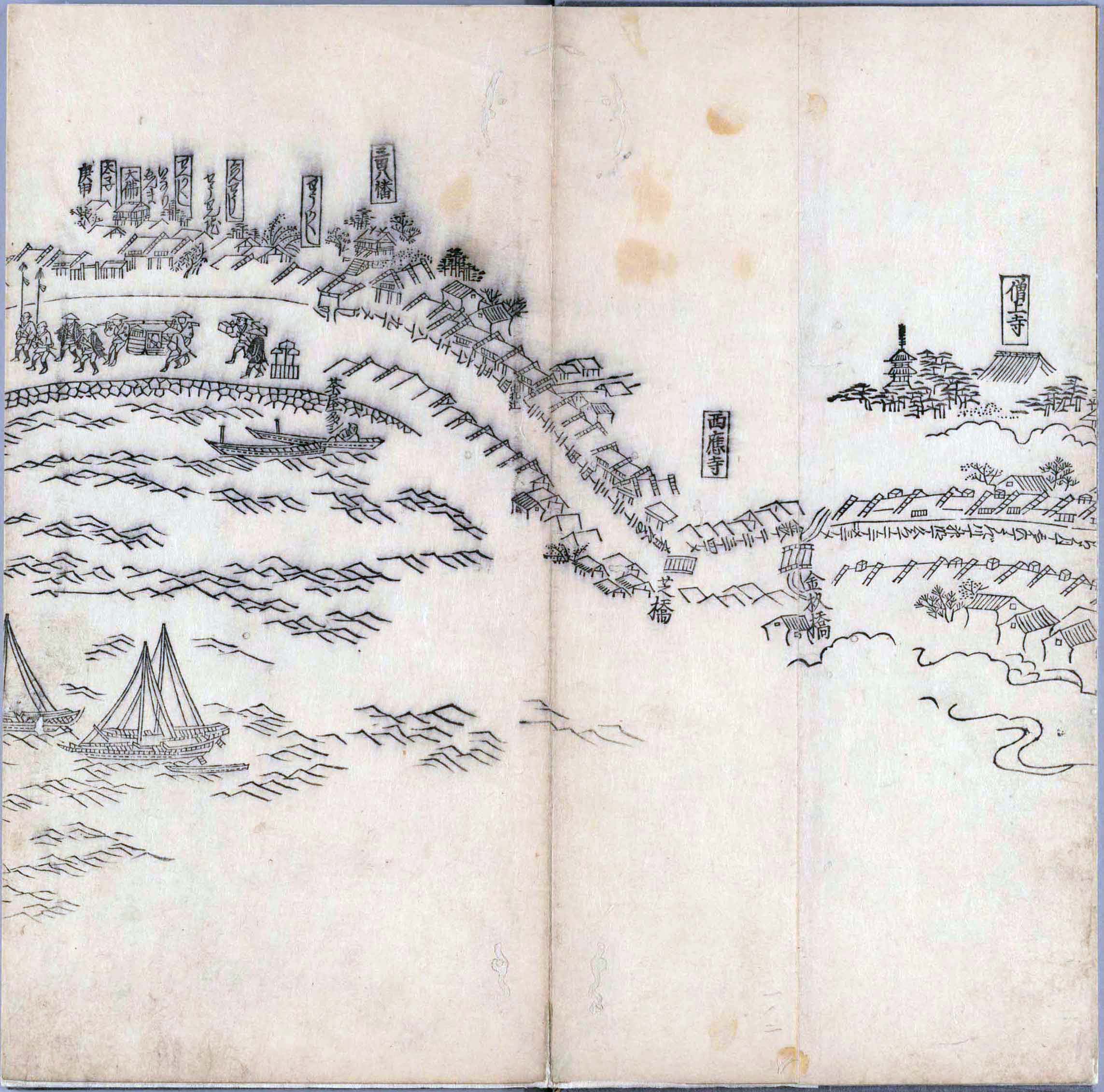 其他、一分四拾間の懐中の図、考と雖ども分厘のただえなし。故に上一下万人に至る迄、一同の名誉を唱ること勿論也去るに依り道印に因んで東海道五十三次の道法分間に顕し而、所々の景、村付け、馬次、家並、名所、旧跡、山川、海道、微細に考え、既に板行令と清書を画師菱河氏に請う。時に彼師云う指図計りにては通達の慰用共ならず。唯右の図を風俗に顕し、うるわしきを以って高位の簾中、下劣の女童に至迄、明鏡に向かいて自面之みるがごとくならしめん。と功筆を抜す。