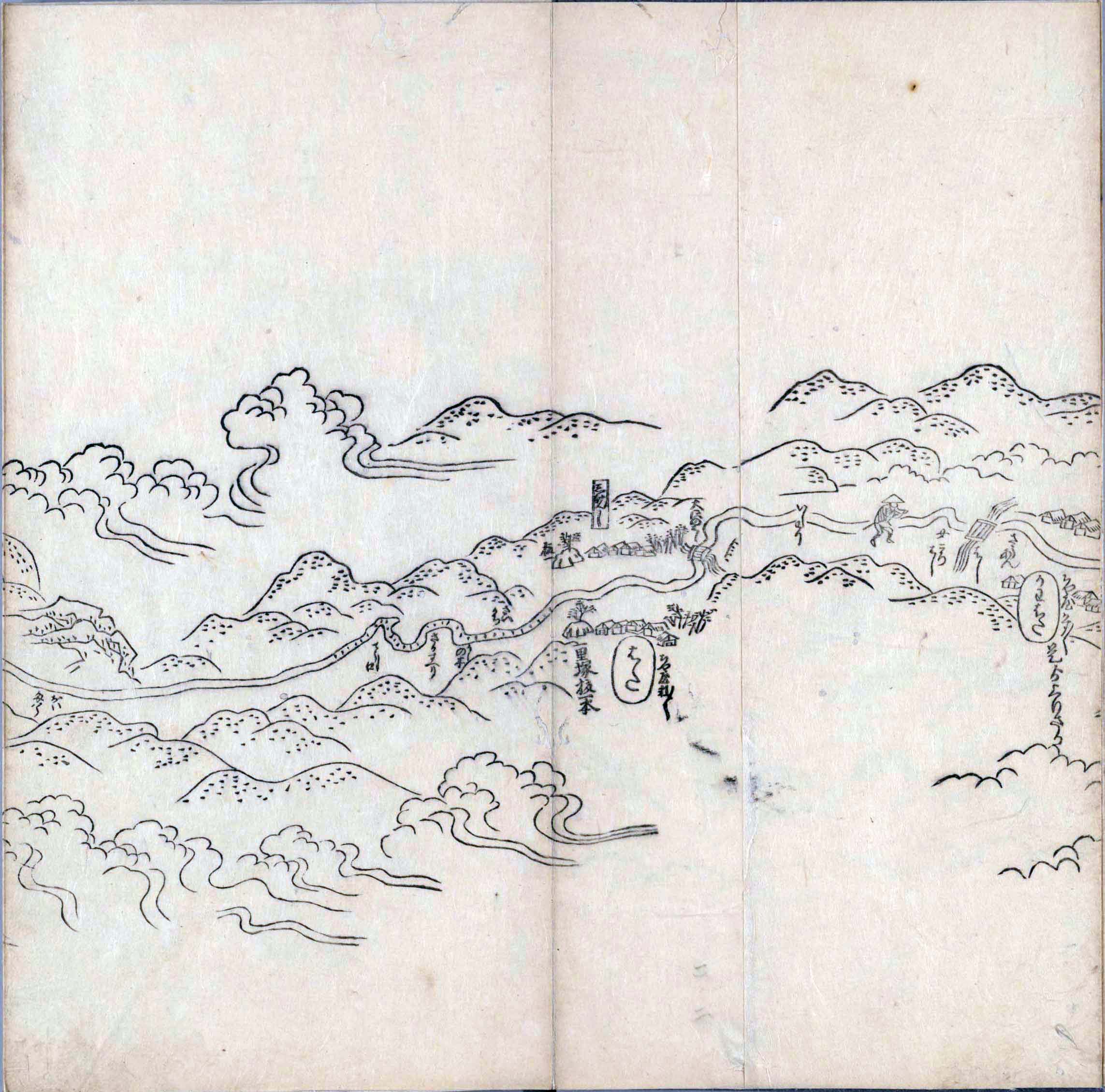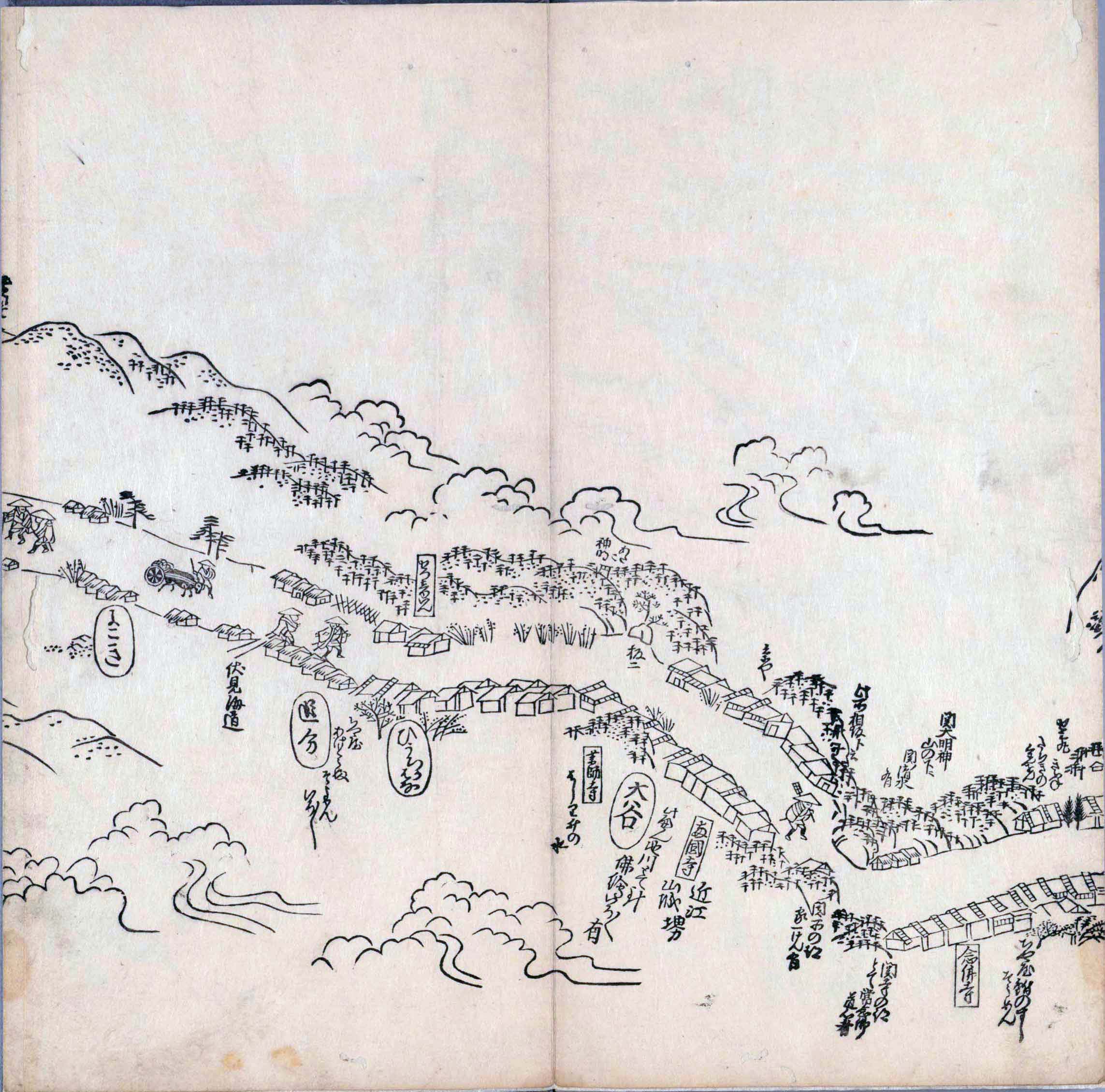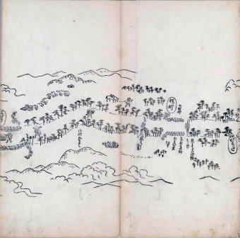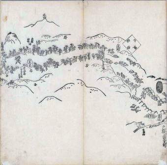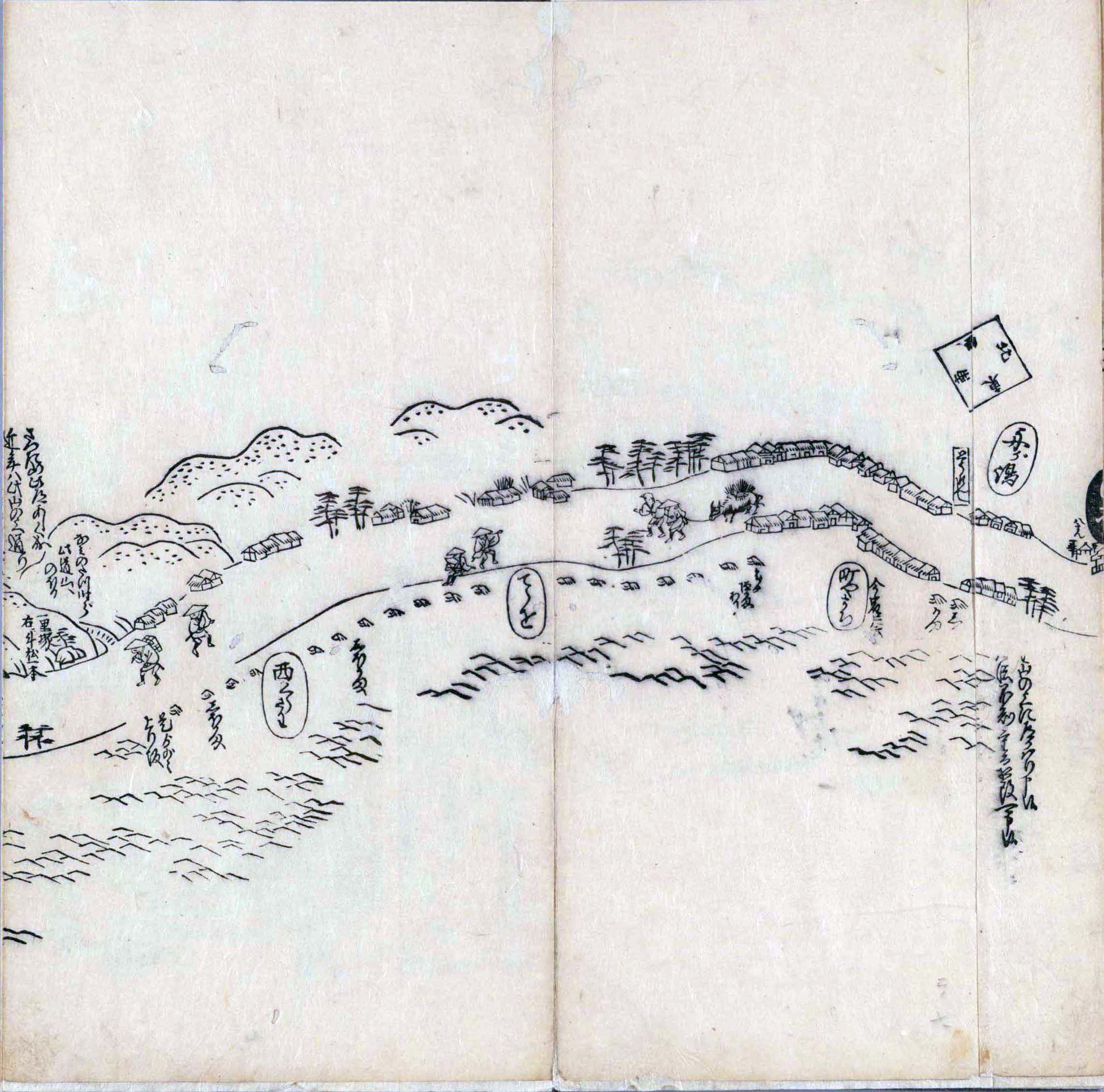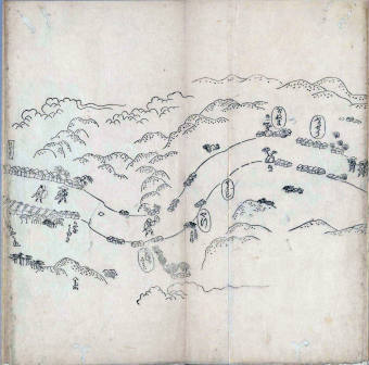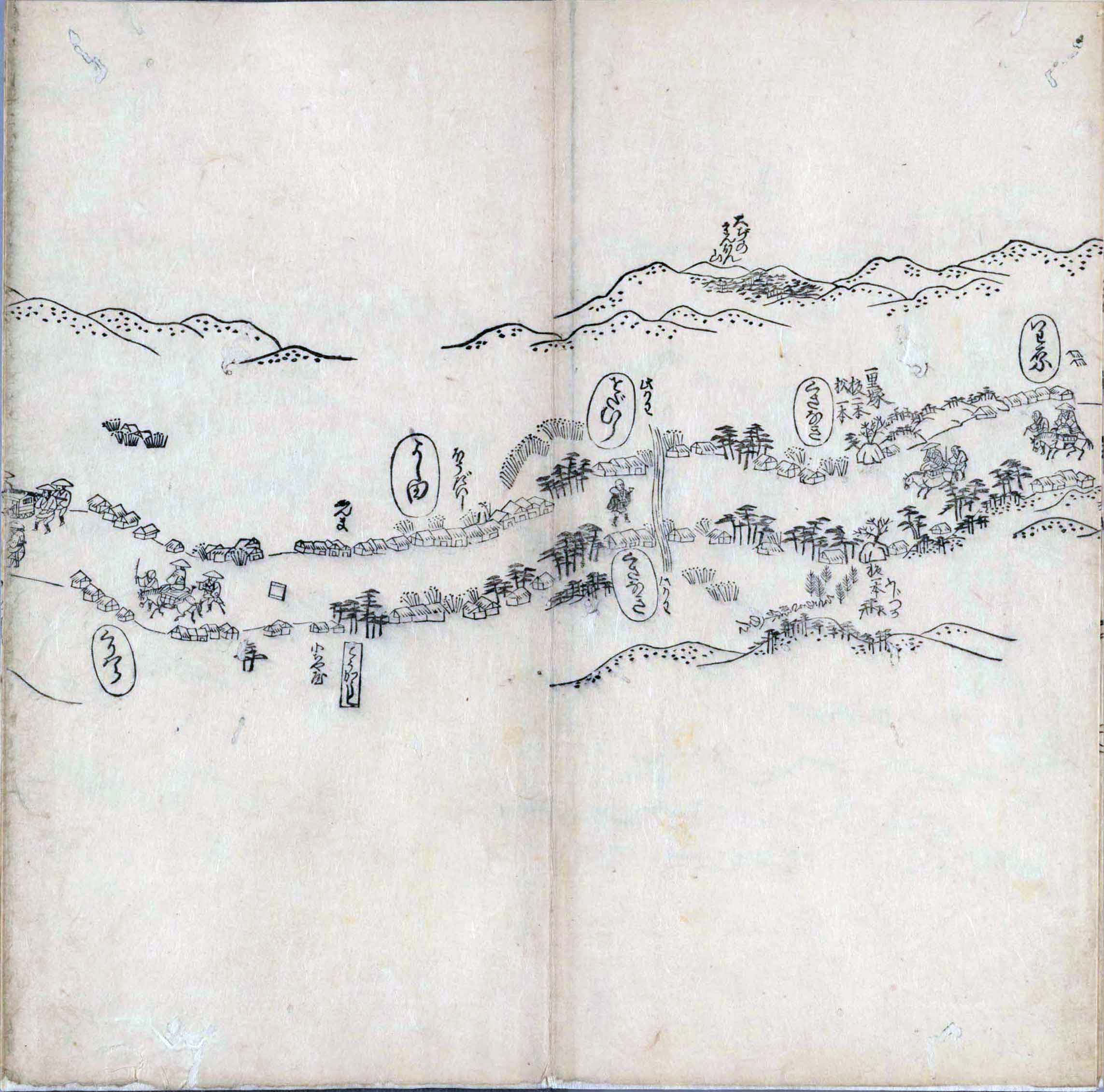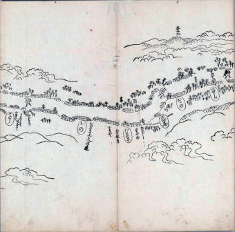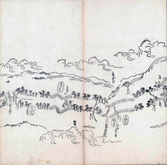 遠近道印 (寛永5年(1628年) - 没年不詳)が作成した分間図を基に、絵師・菱川師宣 (菱川吉兵衛 )(元和4年〈1618年〉 - 元禄7年6月4日〈1694年7月25日〉) が絵画的要素を加味した街道風景を描いて完成させたもの。元禄3年(1690年)の刊行。 - 江戸・日本橋から京・二条城までを5帖の折本に描いている。
