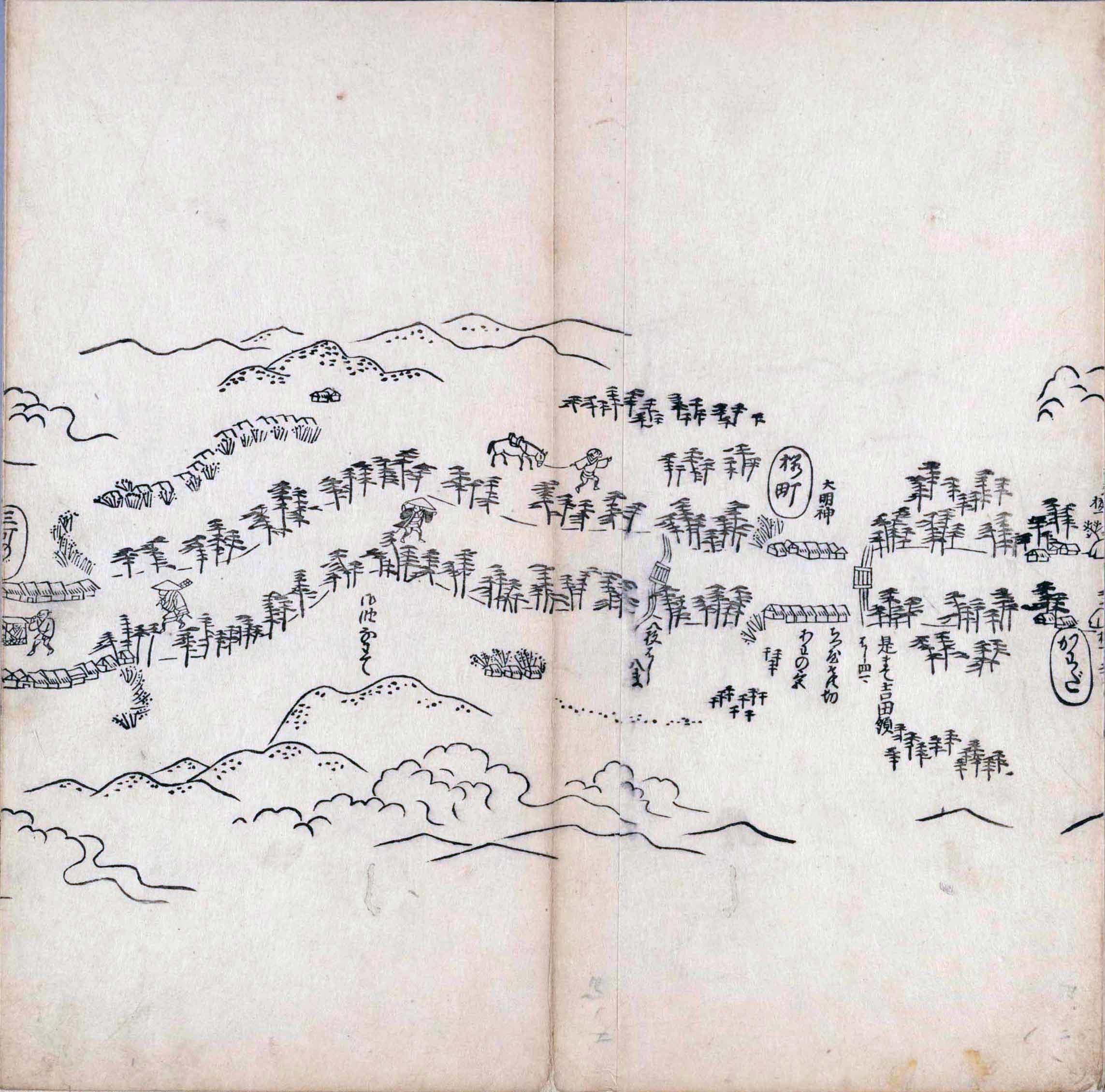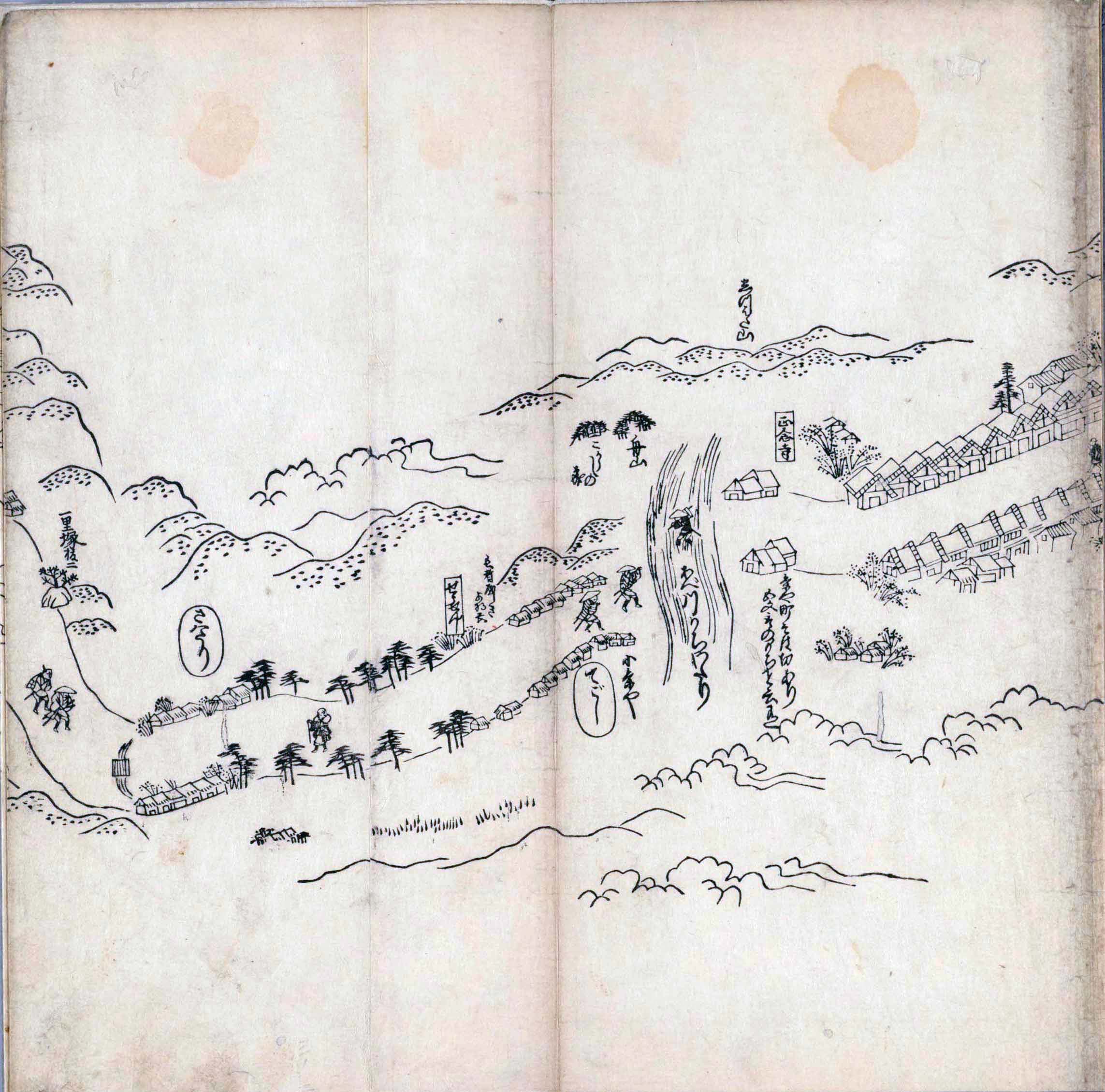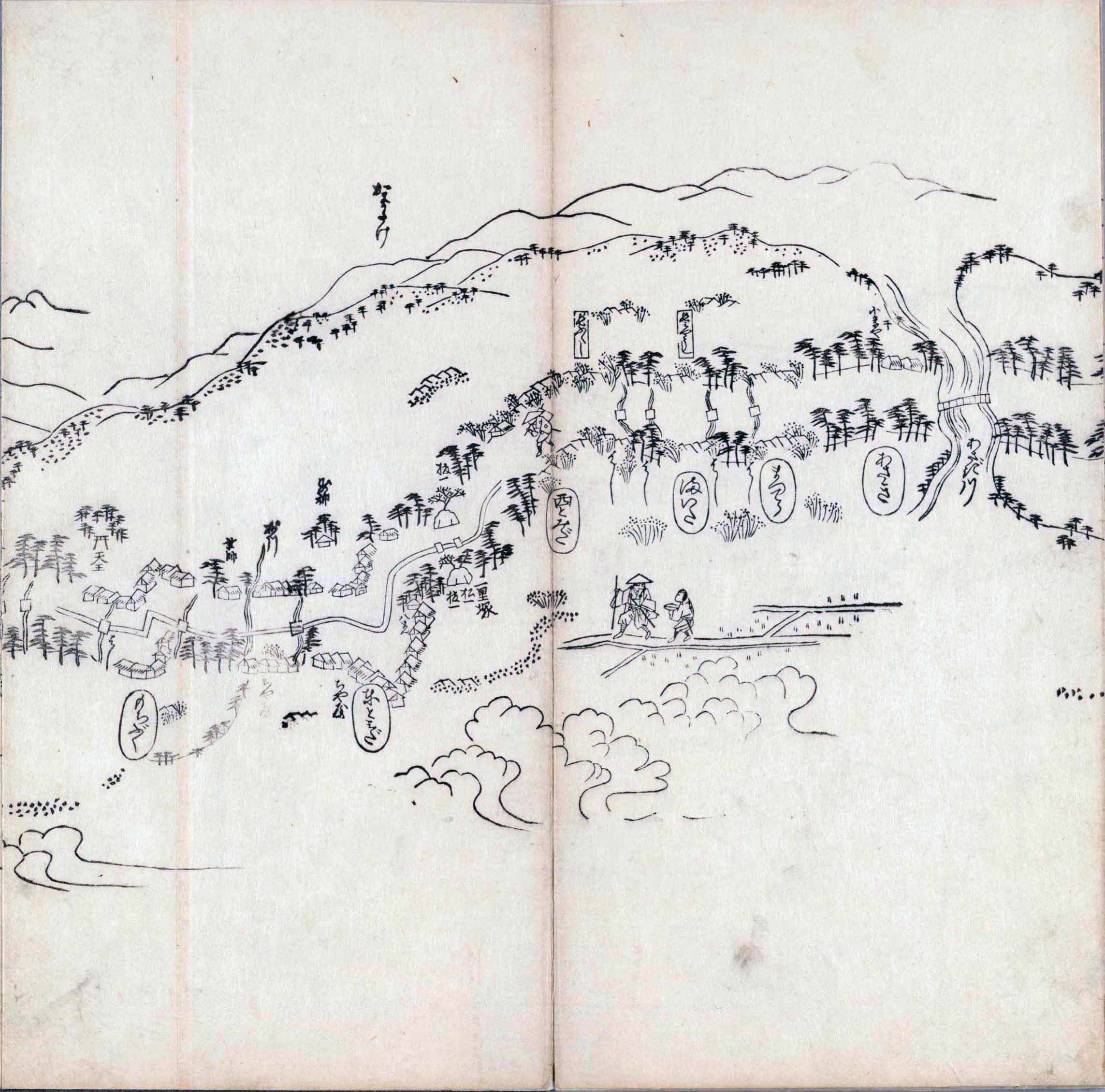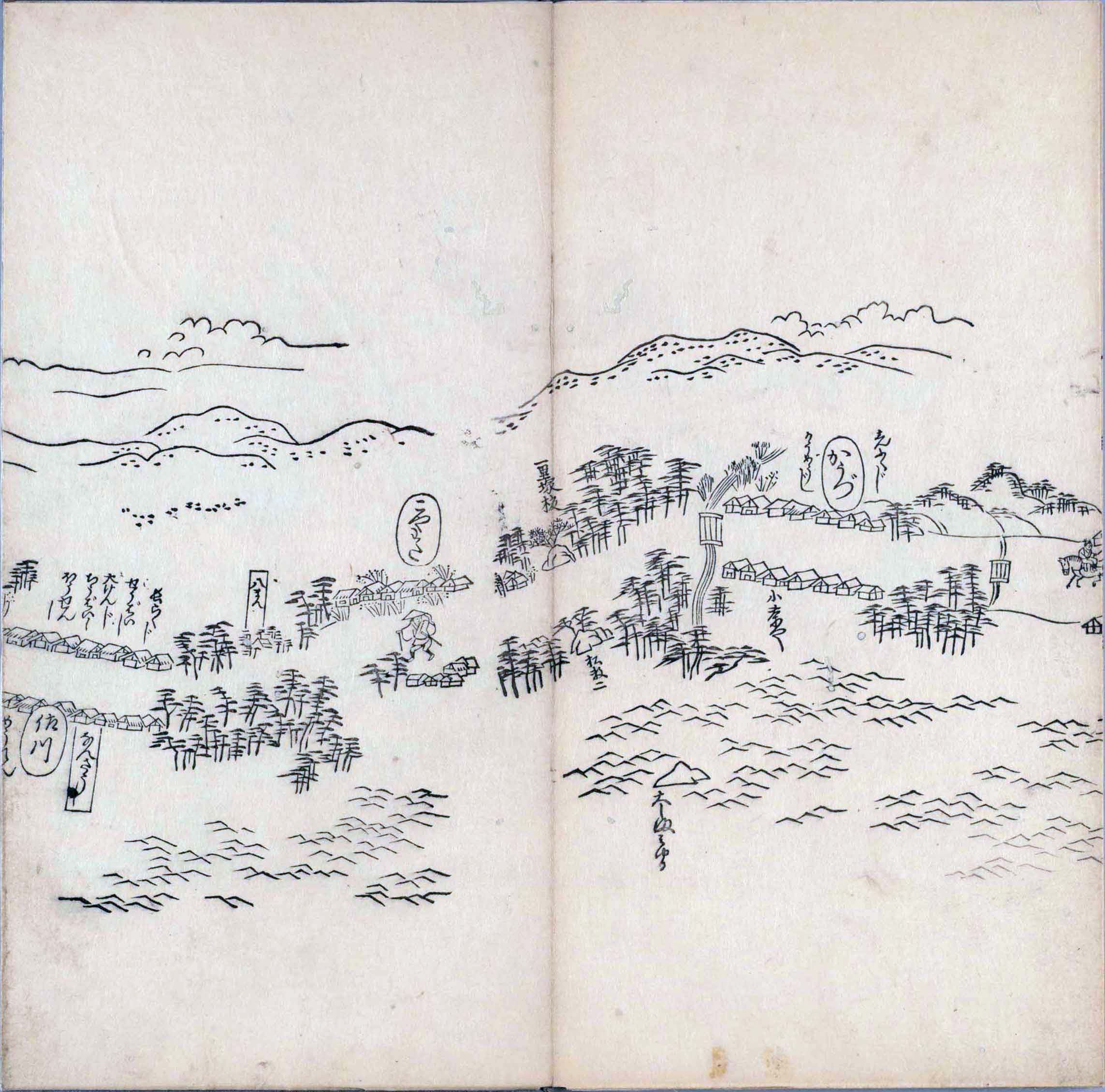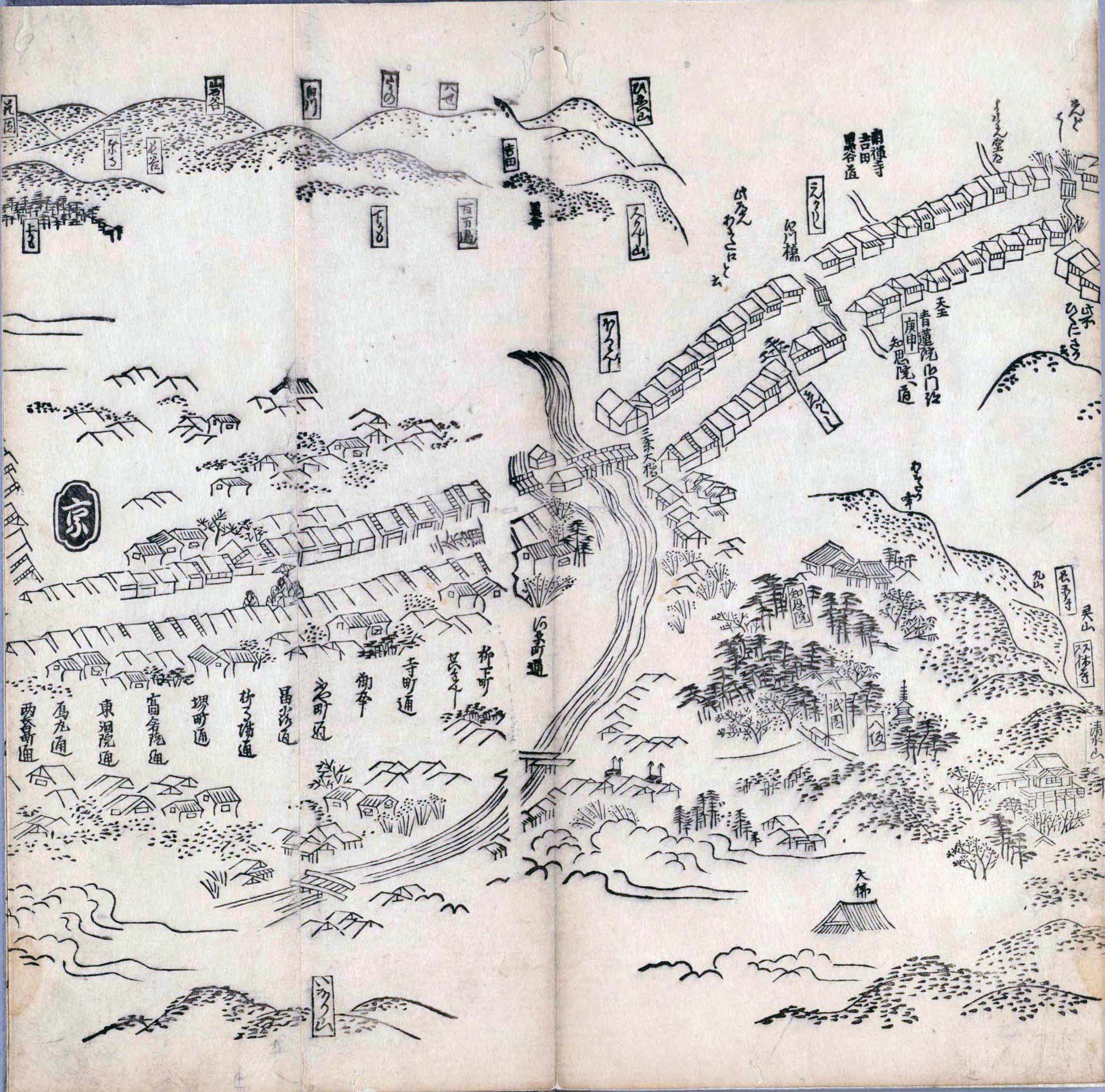 遠近道印 (寛永5年(1628年) - 没年不詳)が作成した分間図を基に、絵師・菱川師宣 (菱川吉兵衛 )(元和4年〈1618年〉 - 元禄7年6月4日〈1694年7月25日〉) が絵画的要素を加味した街道風景を描いて完成させたもの。元禄3年(1690年)の刊行。 - 江戸・日本橋から京・二条城までを5帖の折本に描いている。