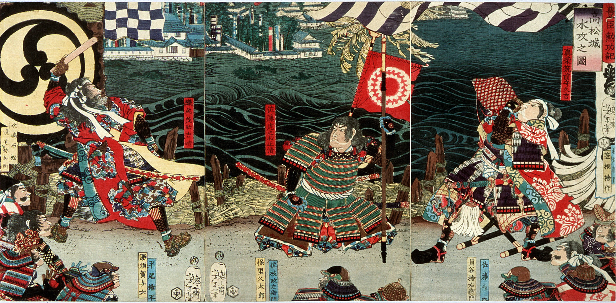 月岡芳年 (1839年・天保10年 - 1892年・明治25年)の三枚続絵『豊臣勲功記 高松城水攻之図』です。 - 月岡芳年は、別号に