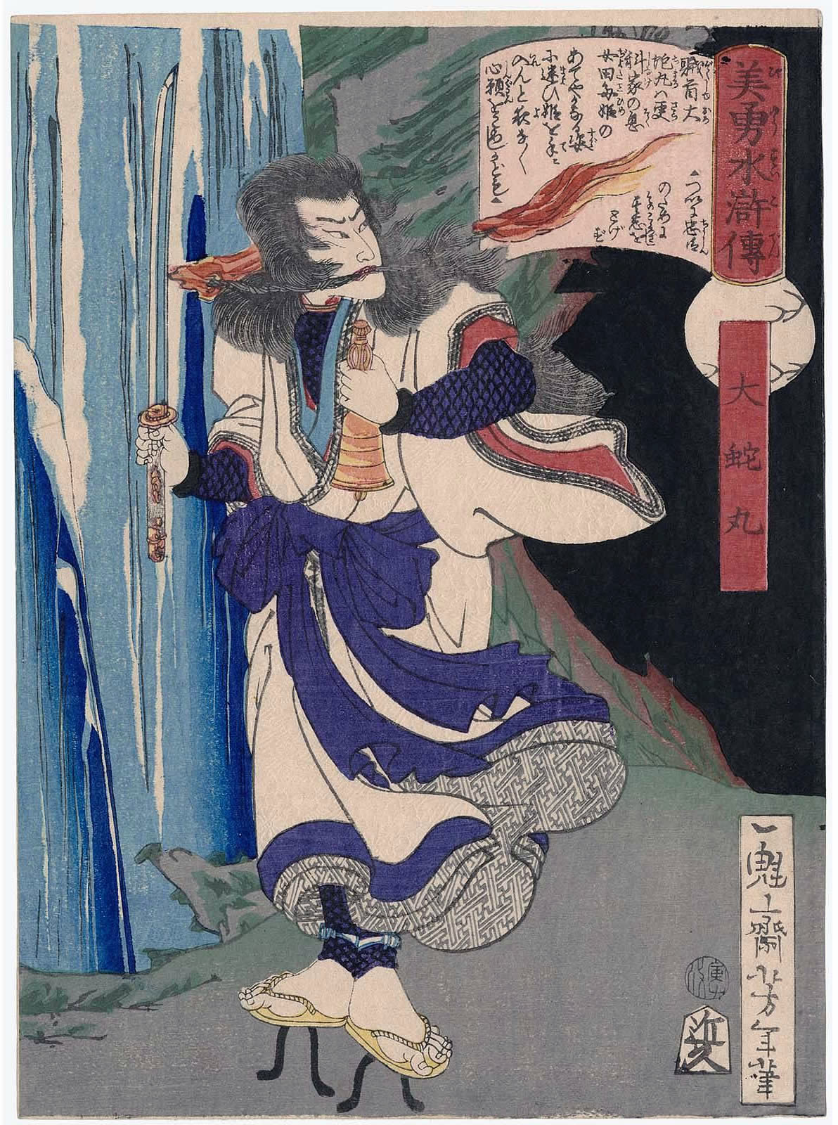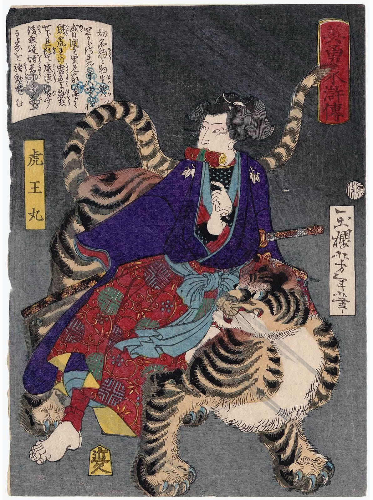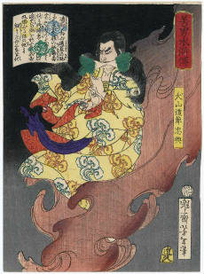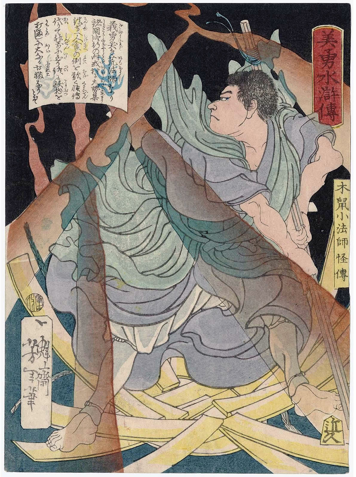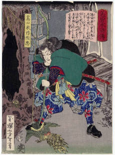 月岡芳年 (1839年・天保10年 - 1892年・明治25年)の『美勇水滸伝 』です。(芳年は、別号に一魁斎 、魁斎 、玉桜楼 、大蘇 などを持つ) - 1866年・慶応2年から1867年・慶応3年にかけて発表された浮世絵の連作で、目録共51枚揃の錦絵です。