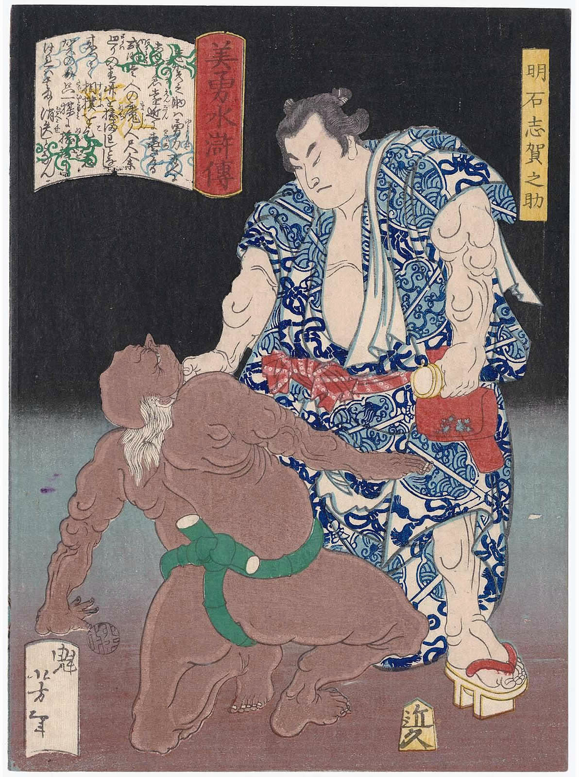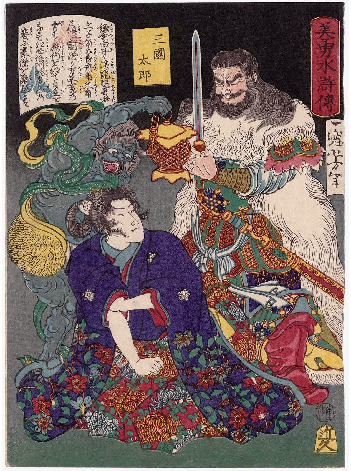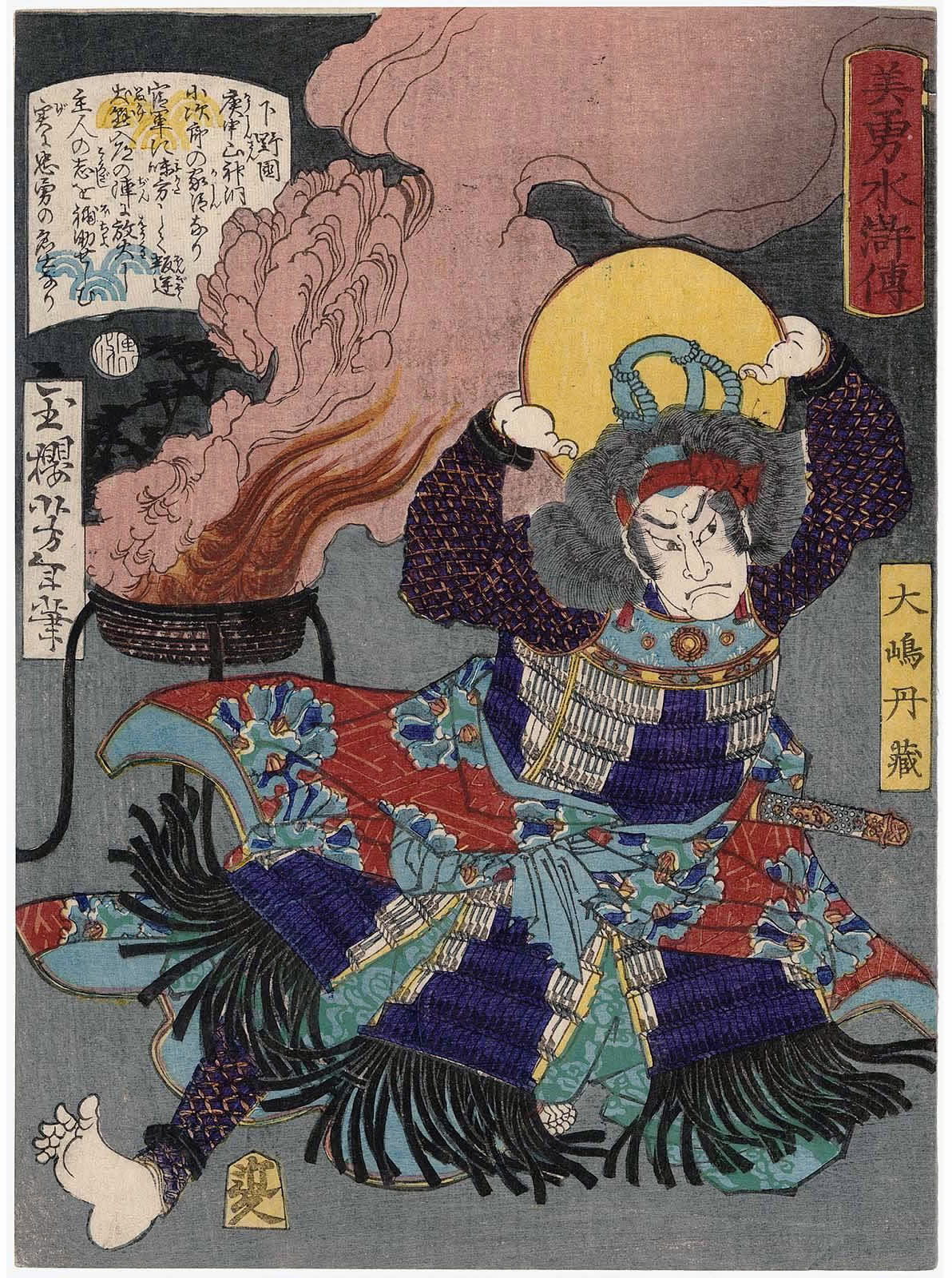 月岡芳年 (1839年・天保10年 - 1892年・明治25年)の『美勇水滸伝 』です。(芳年は、別号に一魁斎 、魁斎 、玉桜楼 、大蘇 などを持つ) - 1866年・慶応2年から1867年・慶応3年にかけて発表された浮世絵の連作で、目録共51枚揃の錦絵です。