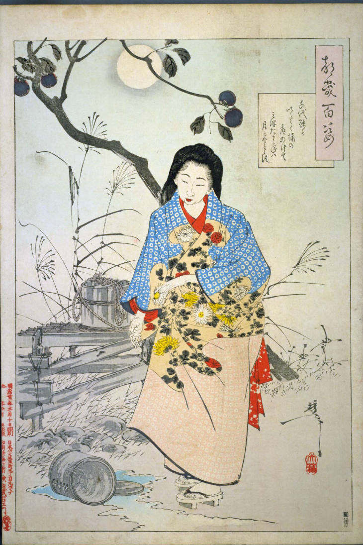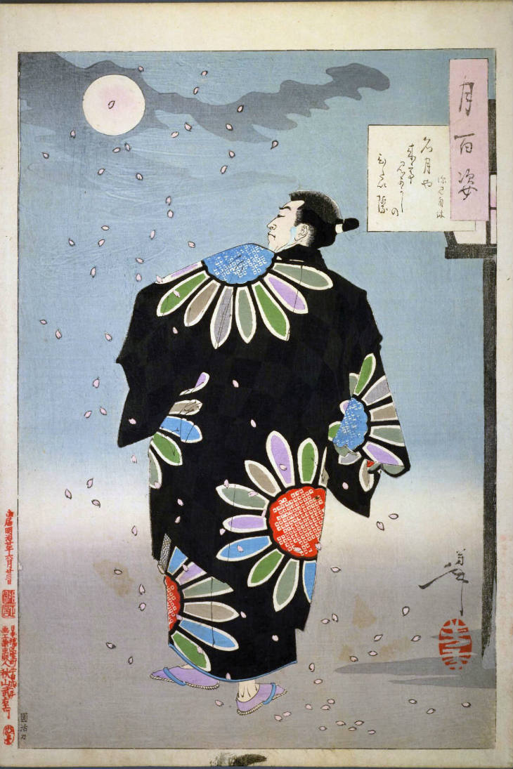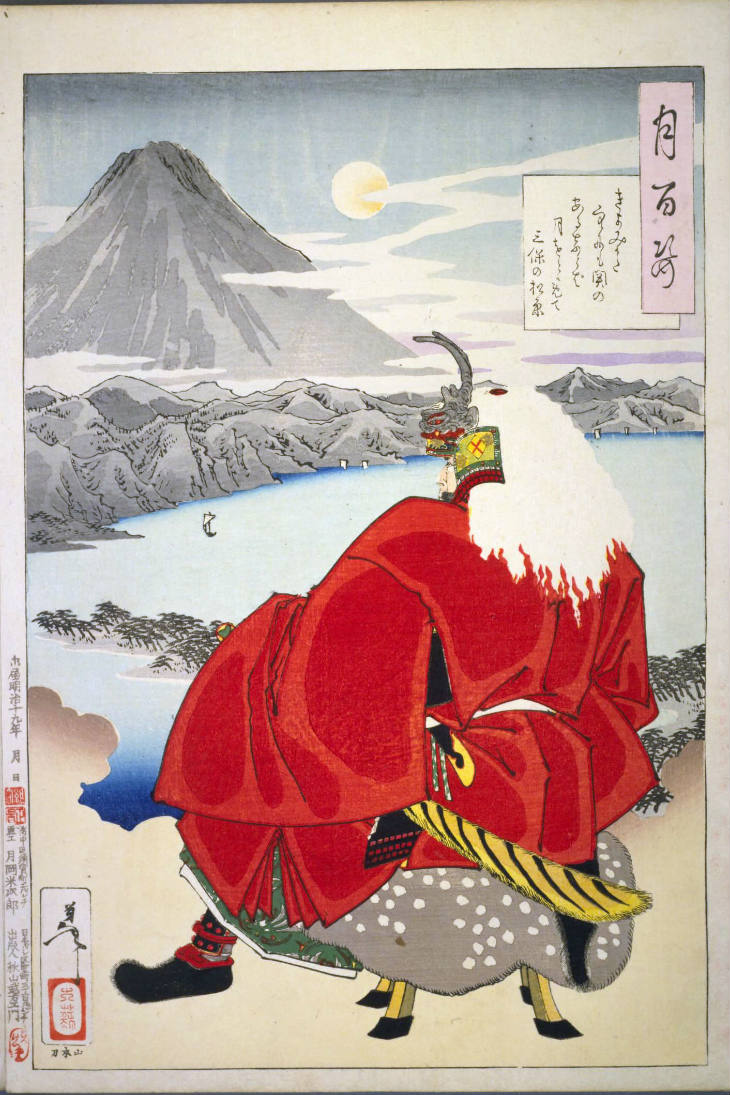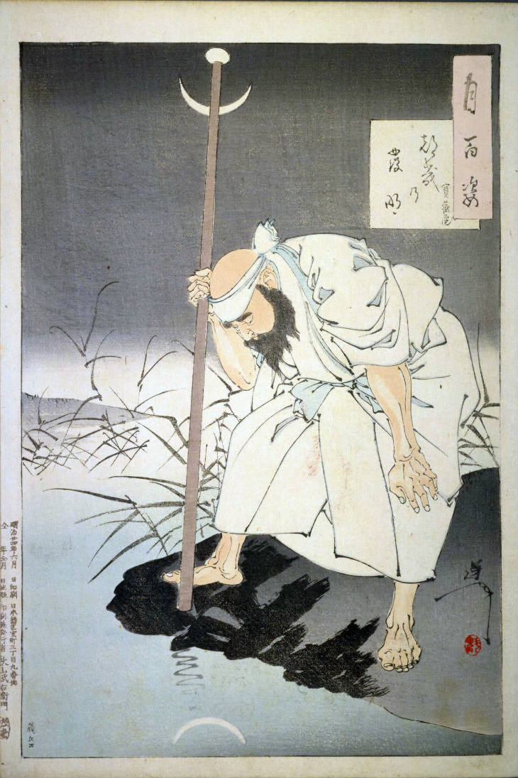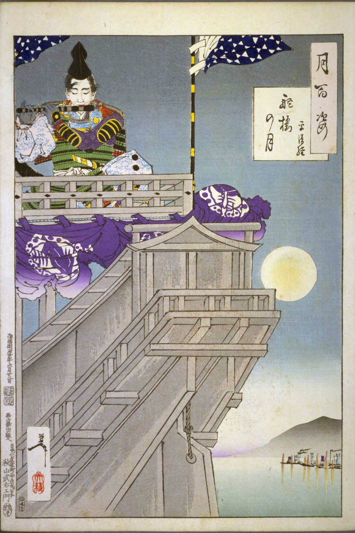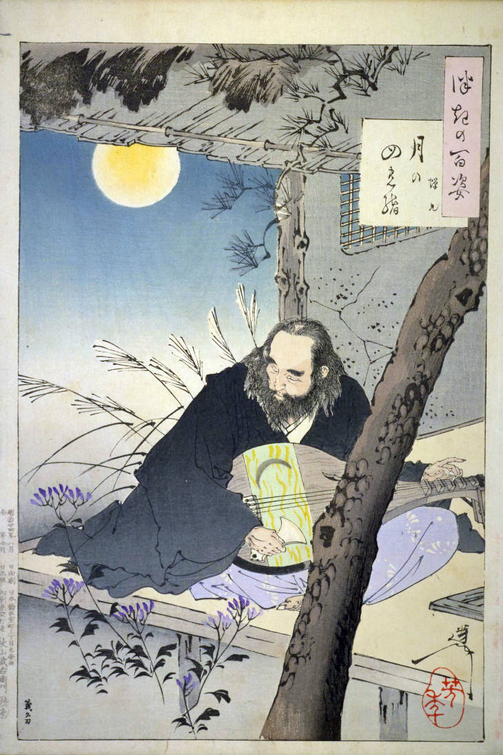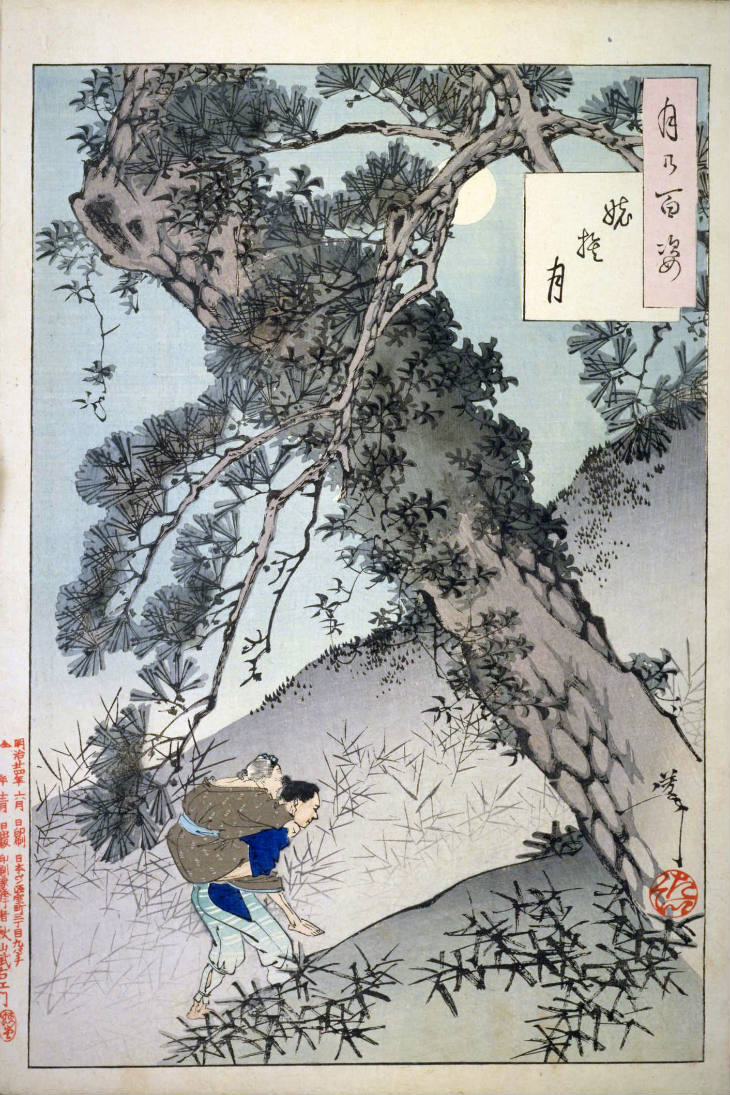 - 和漢の物語や詩歌、謡曲などの月にまつわる場面を題材とした全100点揃物の大判錦絵で、延べ8年を掛けて完結し、1892年・明治25年6月の芳年の死の直後に100作品に目録と序文を添えた画帖が発売された。芳年の代表作の一つと評されています( Wikipedia )。