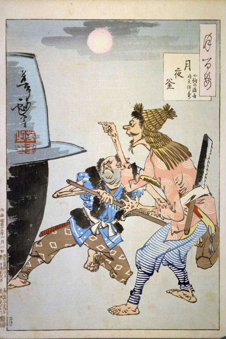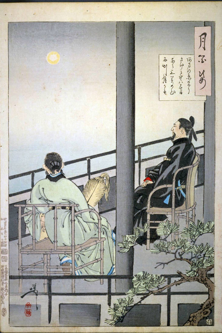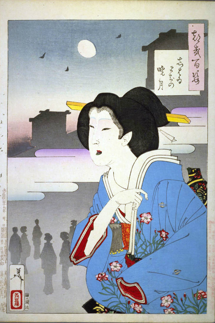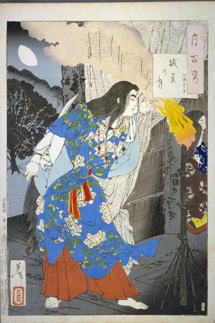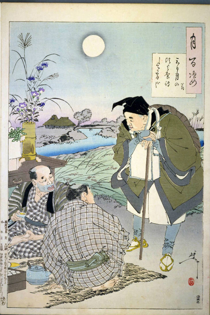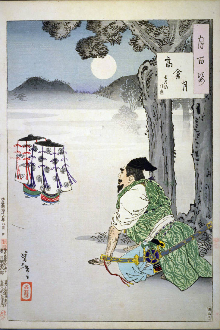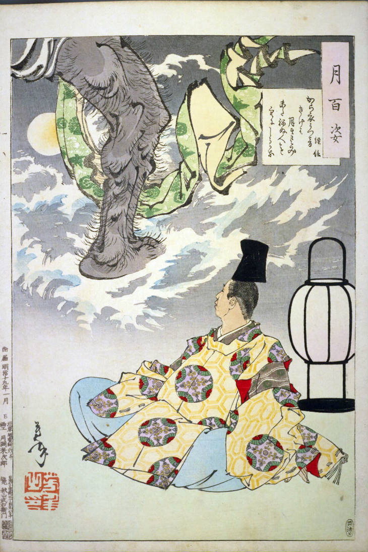 - 和漢の物語や詩歌、謡曲などの月にまつわる場面を題材とした全100点揃物の大判錦絵で、延べ8年を掛けて完結し、1892年・明治25年6月の芳年の死の直後に100作品に目録と序文を添えた画帖が発売された。芳年の代表作の一つと評されています( Wikipedia )。