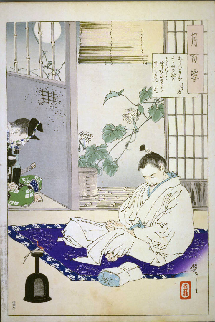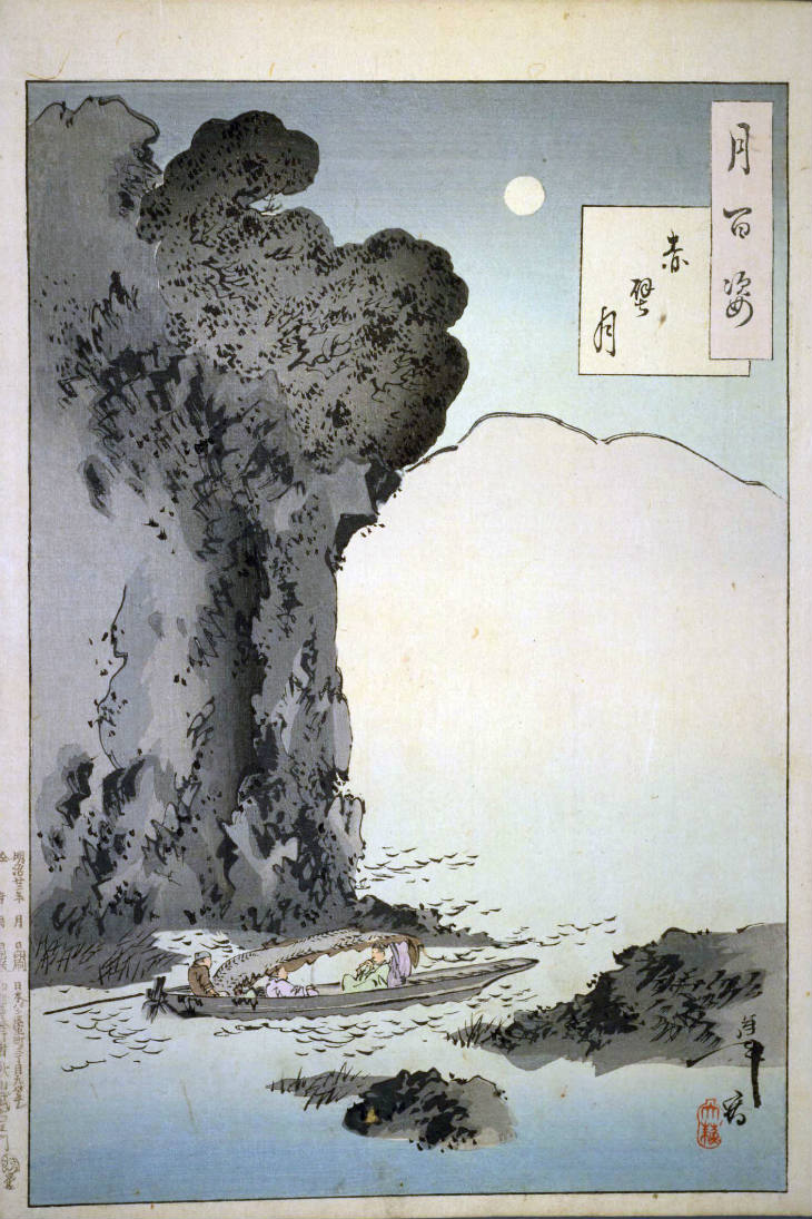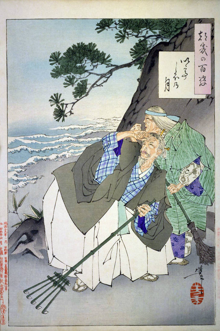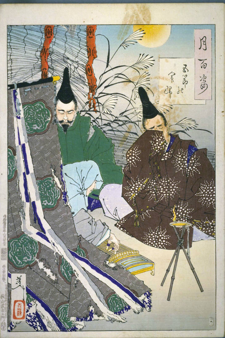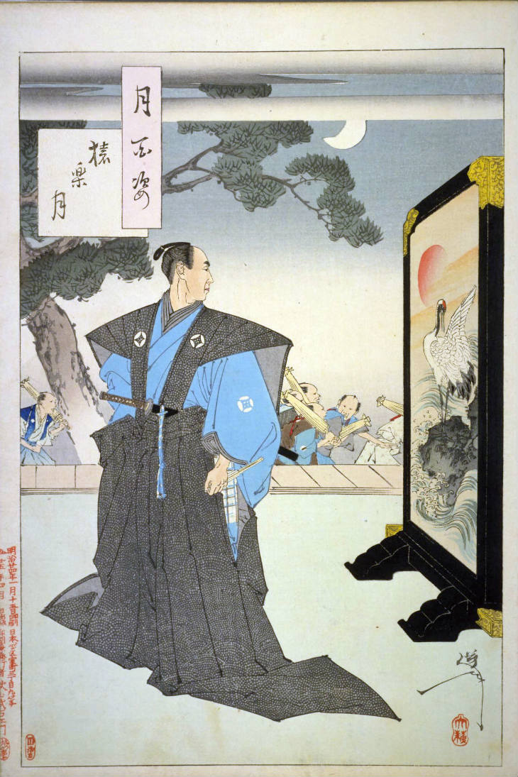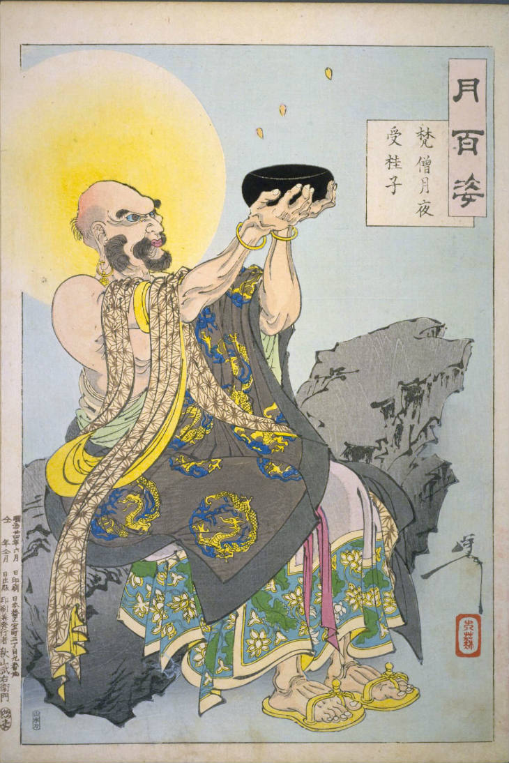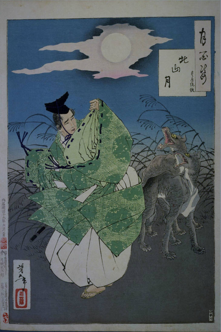 - 和漢の物語や詩歌、謡曲などの月にまつわる場面を題材とした全100点揃物の大判錦絵で、延べ8年を掛けて完結し、1892年・明治25年6月の芳年の死の直後に100作品に目録と序文を添えた画帖が発売された。芳年の代表作の一つと評されています( Wikipedia )。