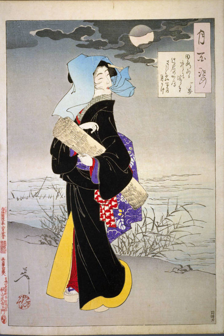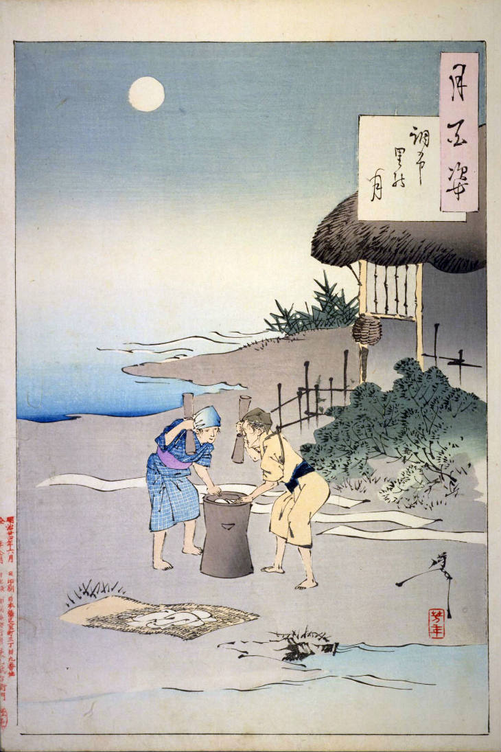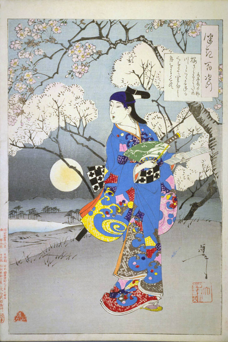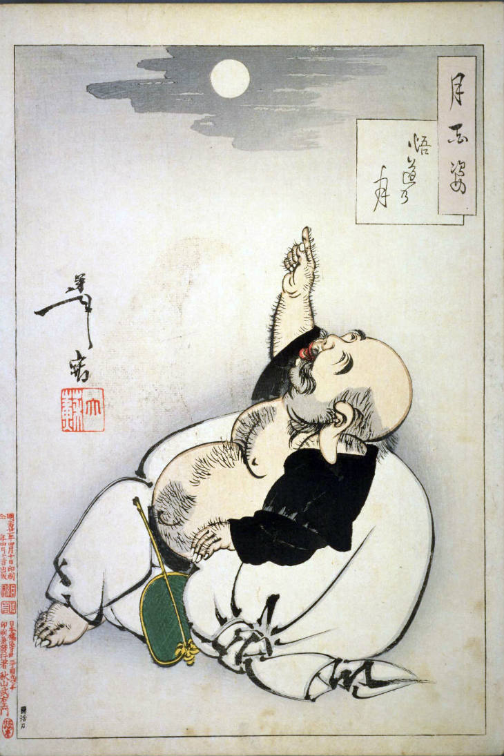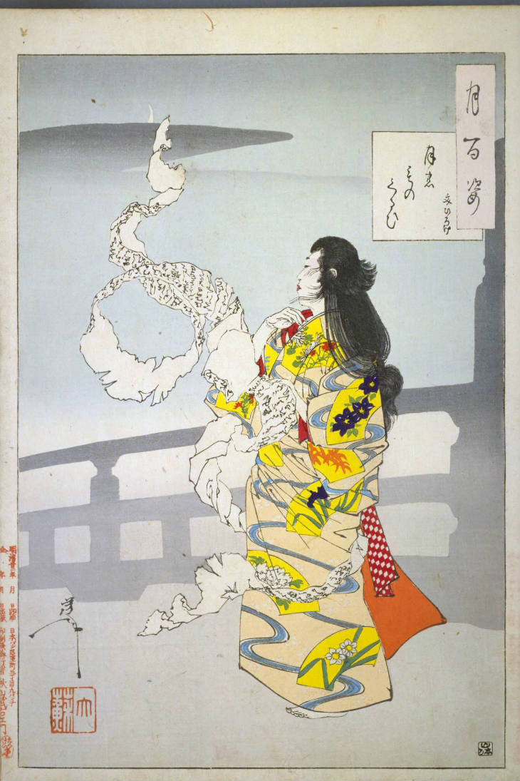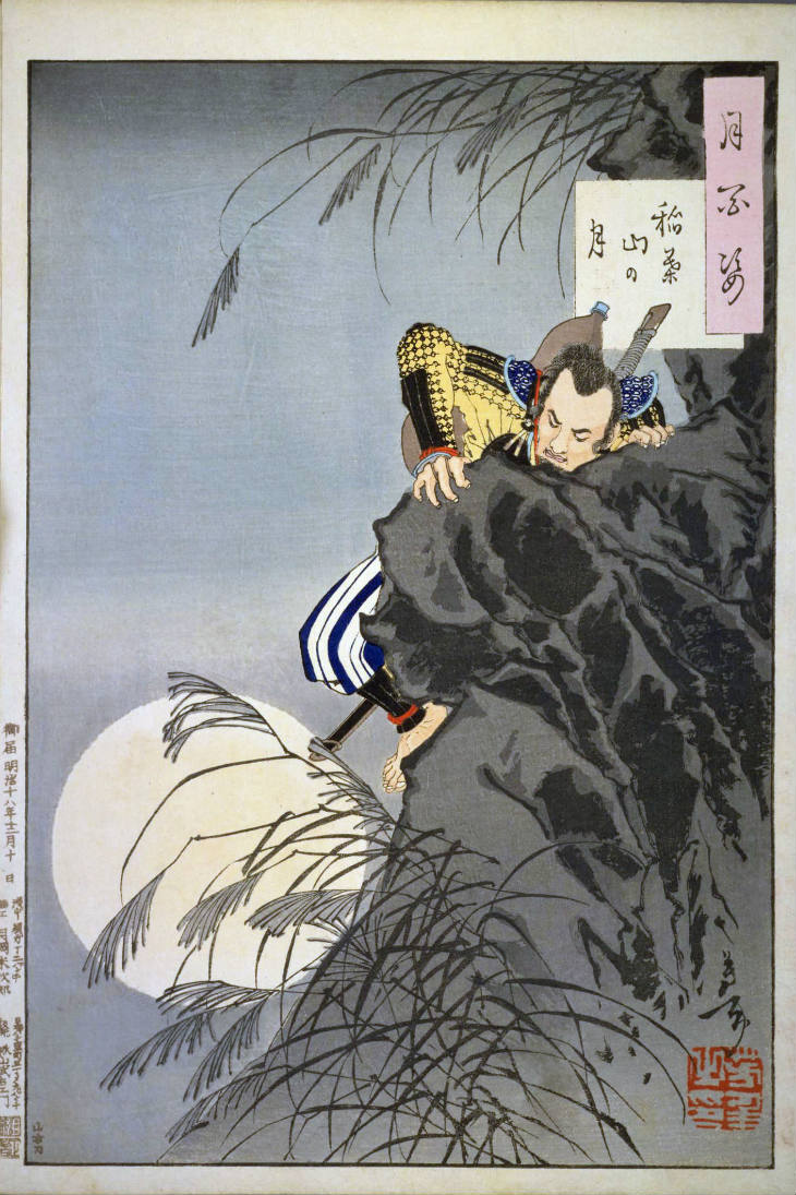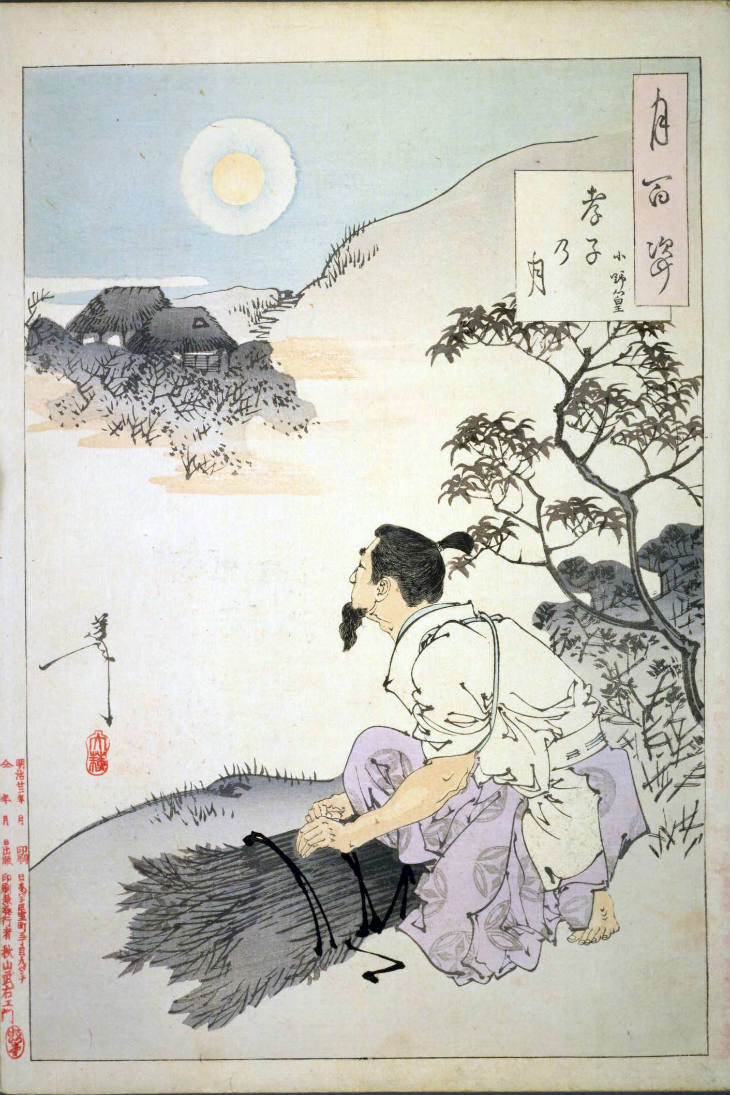 - 和漢の物語や詩歌、謡曲などの月にまつわる場面を題材とした全100点揃物の大判錦絵で、延べ8年を掛けて完結し、1892年・明治25年6月の芳年の死の直後に100作品に目録と序文を添えた画帖が発売された。芳年の代表作の一つと評されています( Wikipedia )。