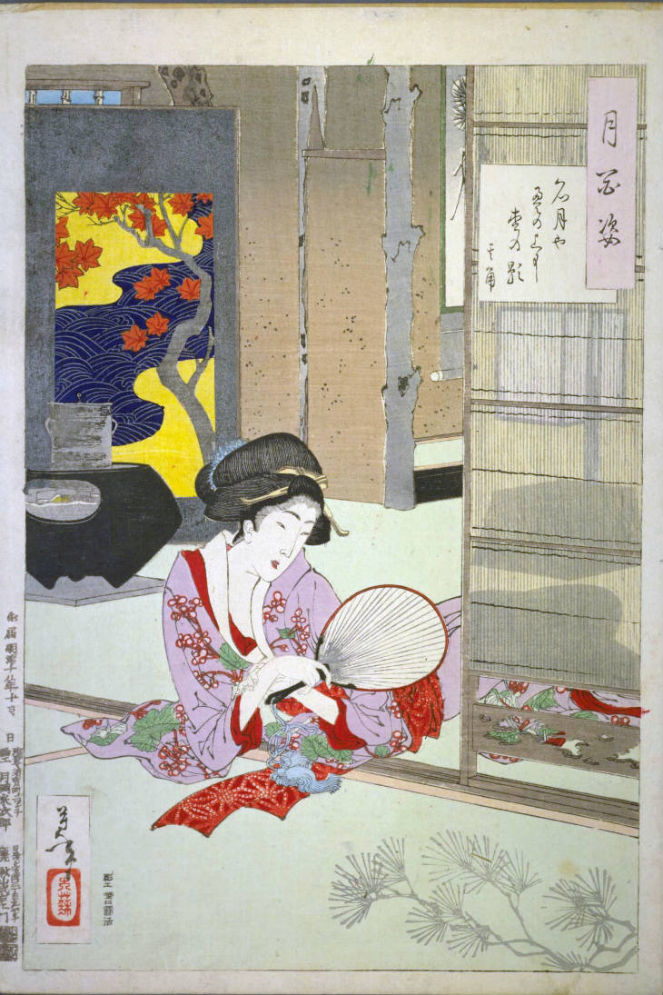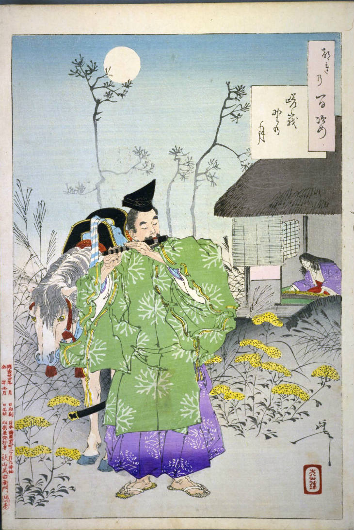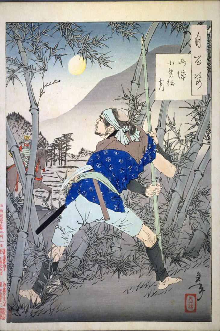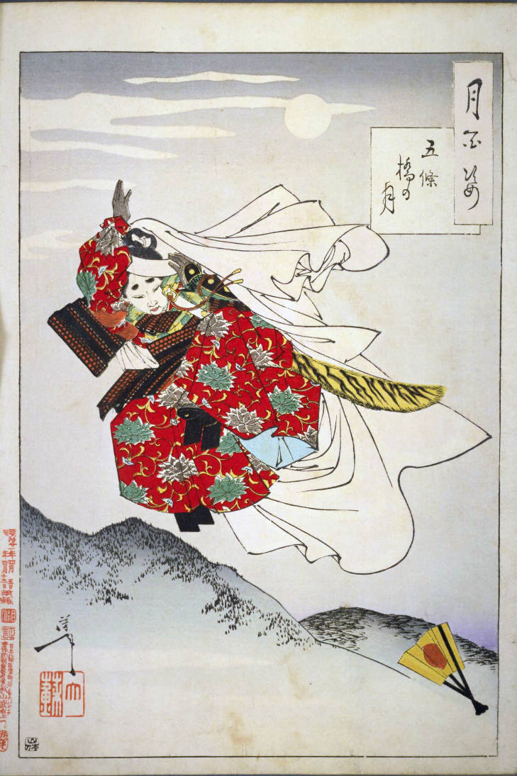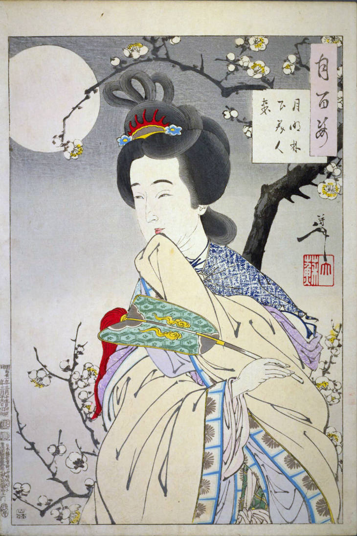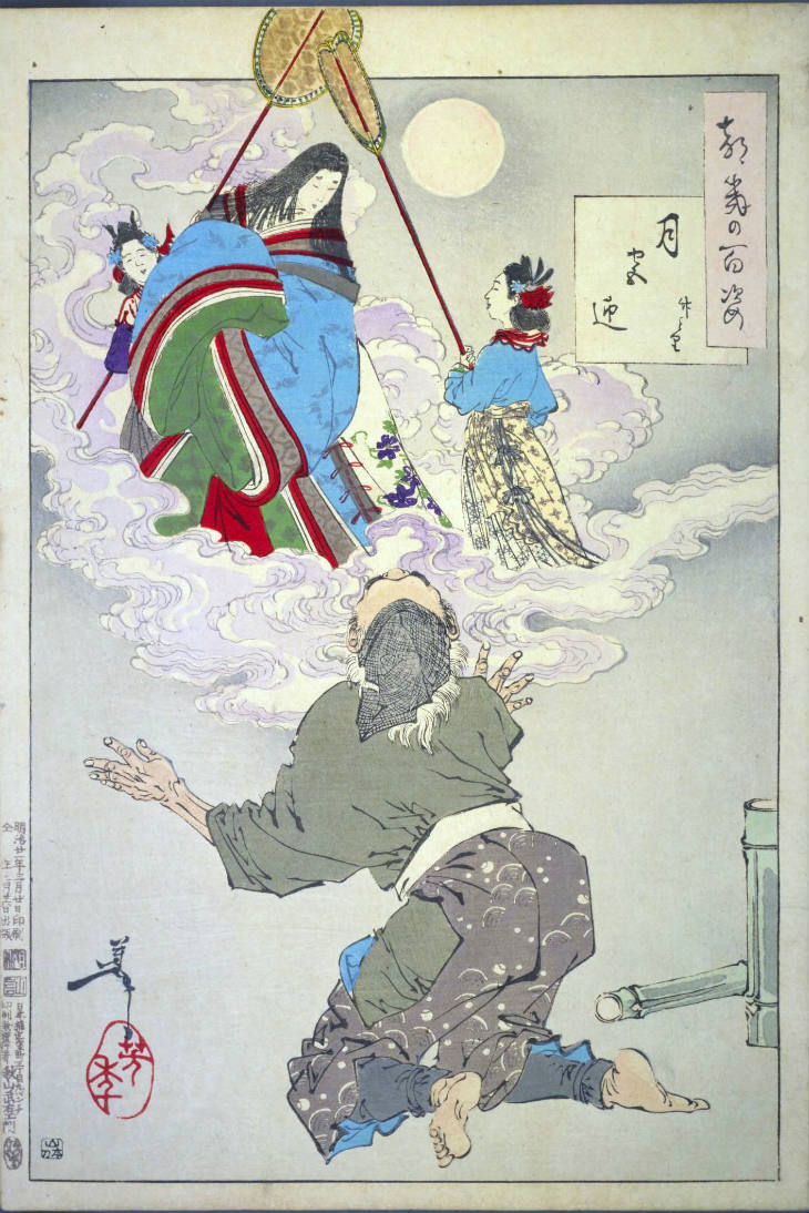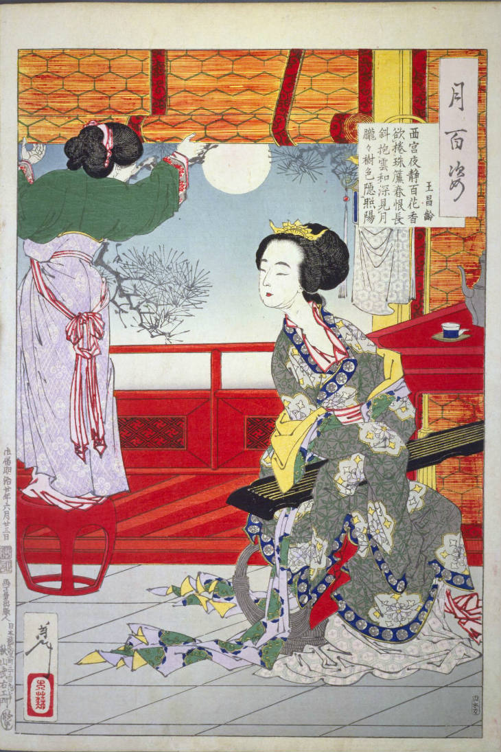 - 和漢の物語や詩歌、謡曲などの月にまつわる場面を題材とした全100点揃物の大判錦絵で、延べ8年を掛けて完結し、1892年・明治25年6月の芳年の死の直後に100作品に目録と序文を添えた画帖が発売された。芳年の代表作の一つと評されています( Wikipedia )。