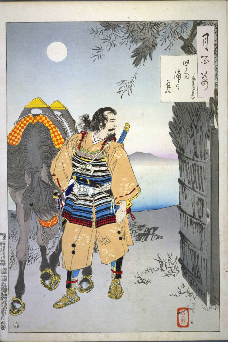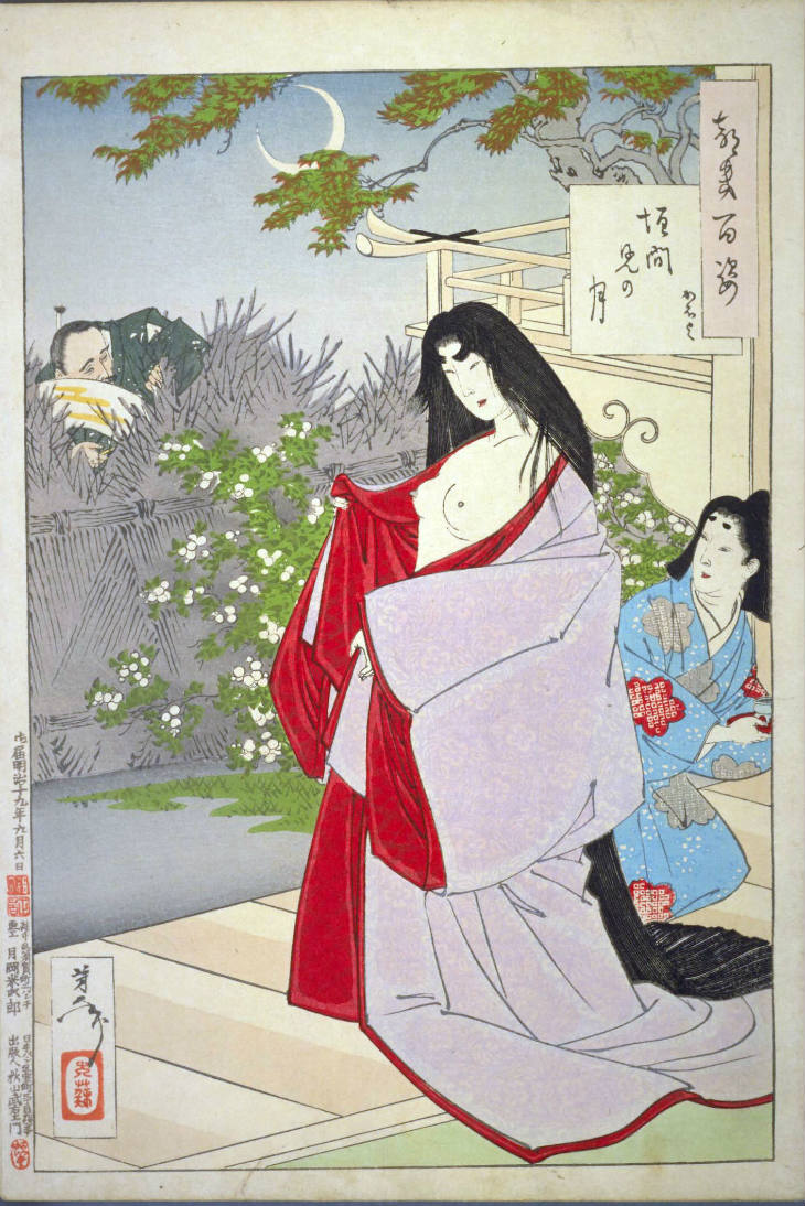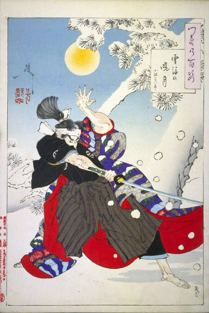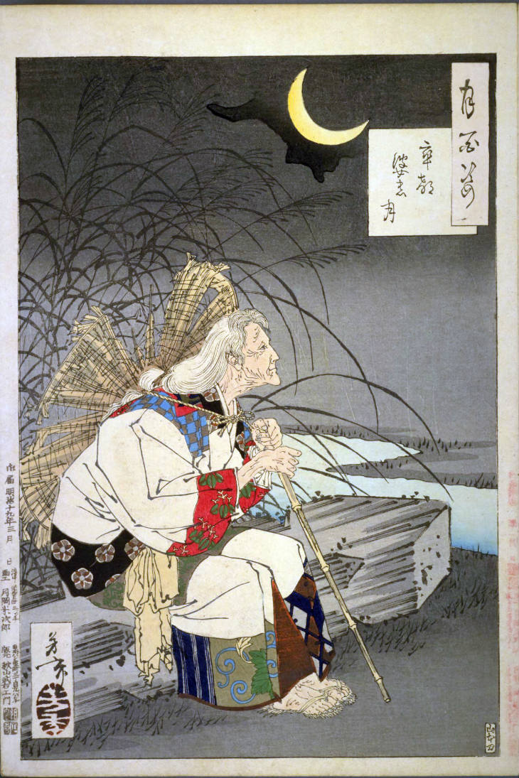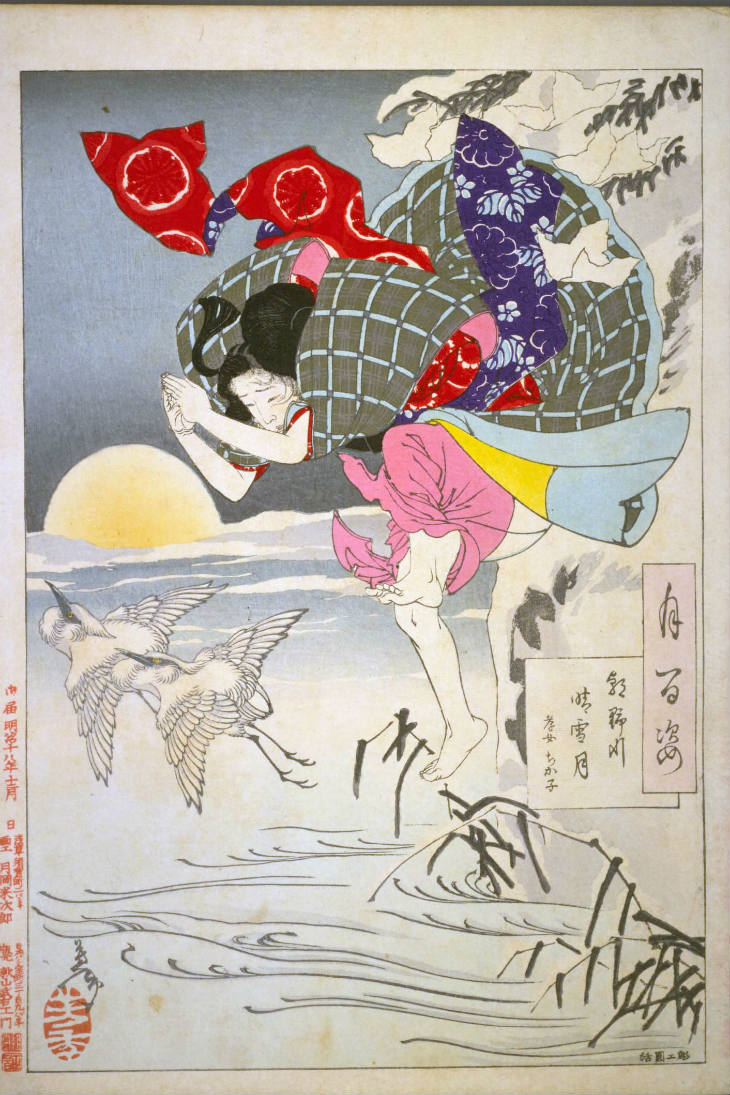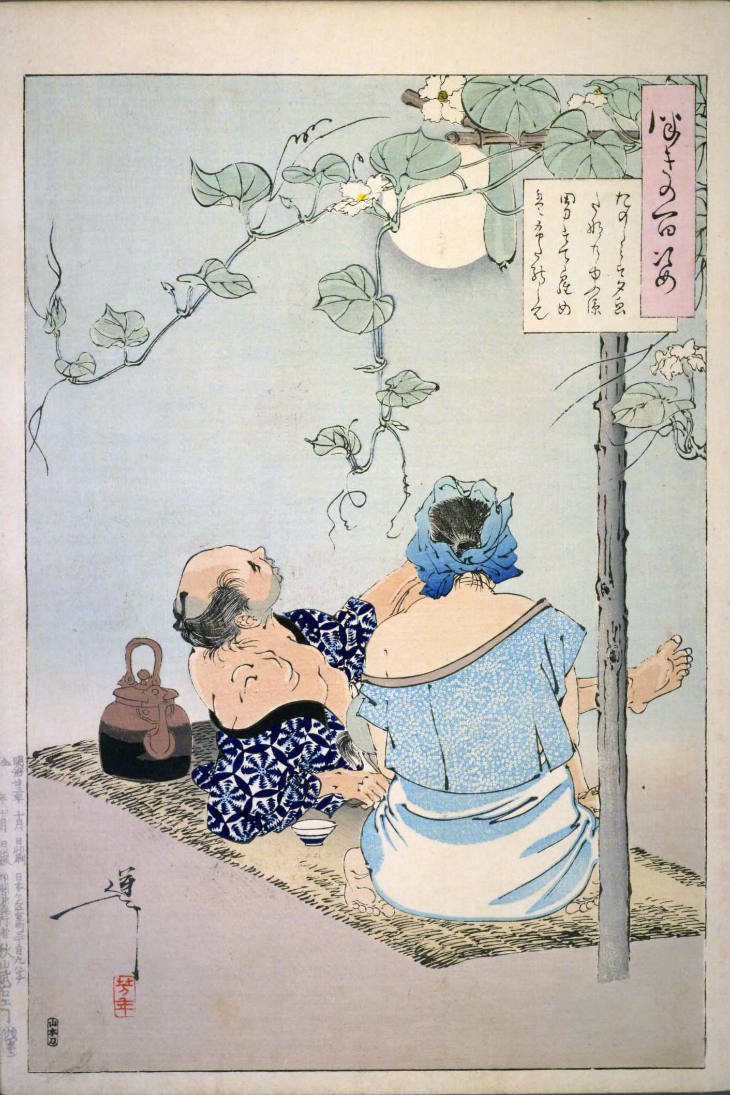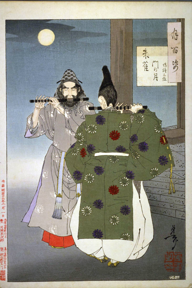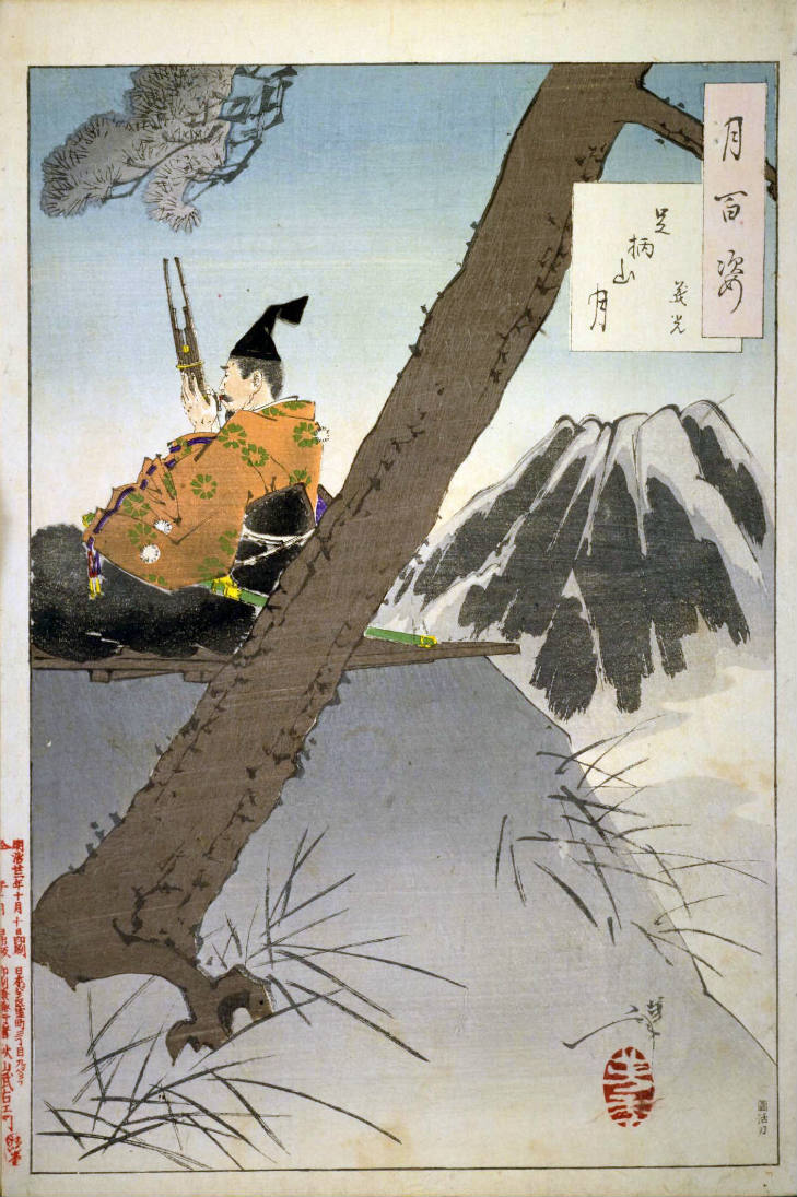 - 和漢の物語や詩歌、謡曲などの月にまつわる場面を題材とした全100点揃物の大判錦絵で、延べ8年を掛けて完結し、1892年・明治25年6月の芳年の死の直後に100作品に目録と序文を添えた画帖が発売された。芳年の代表作の一つと評されています( Wikipedia )。