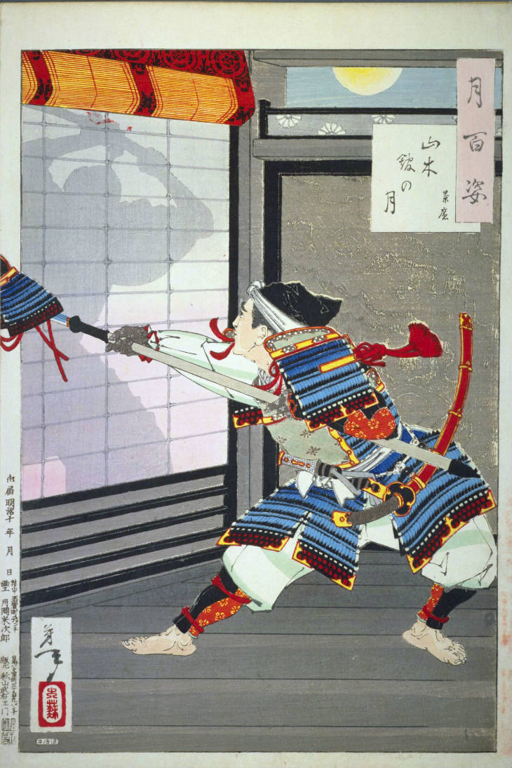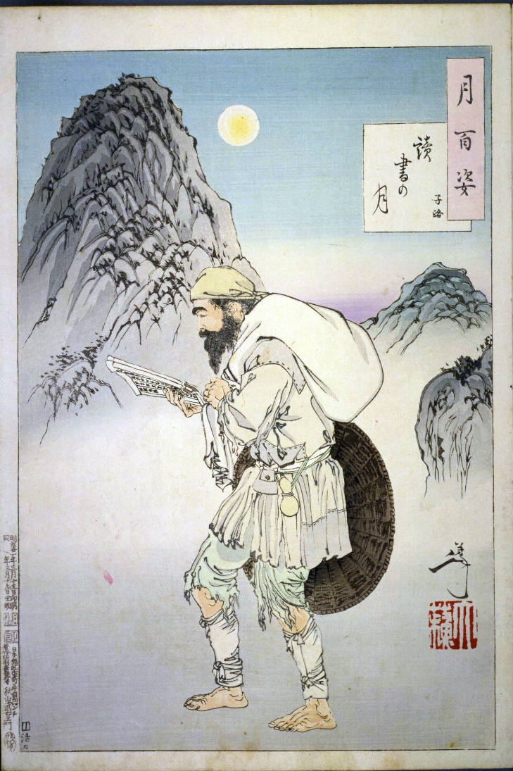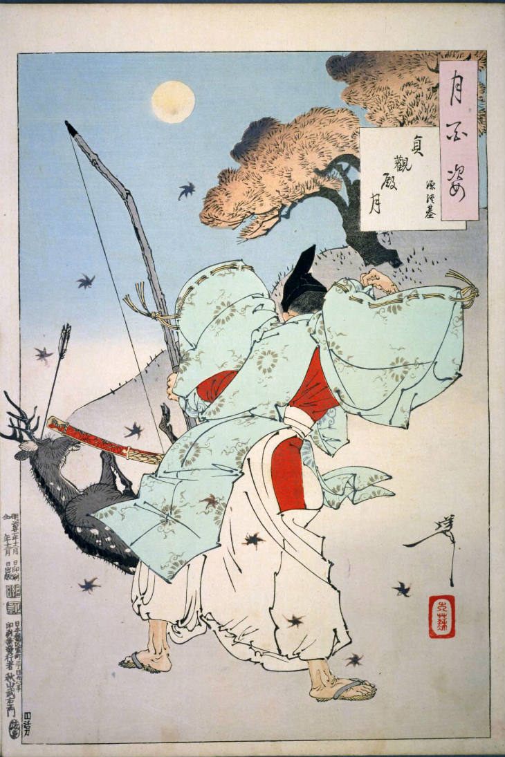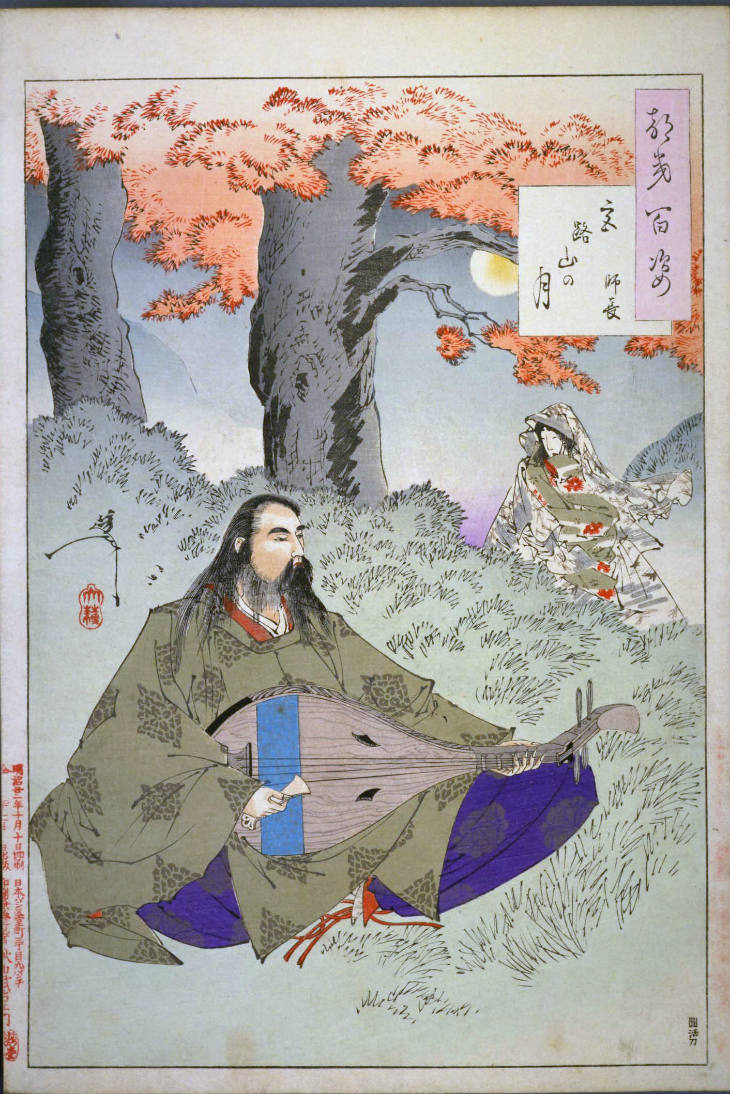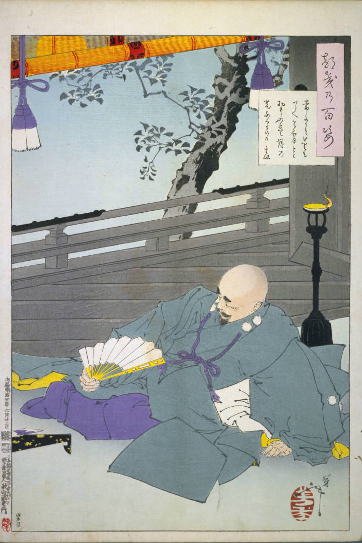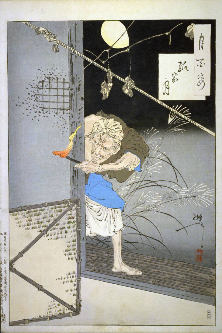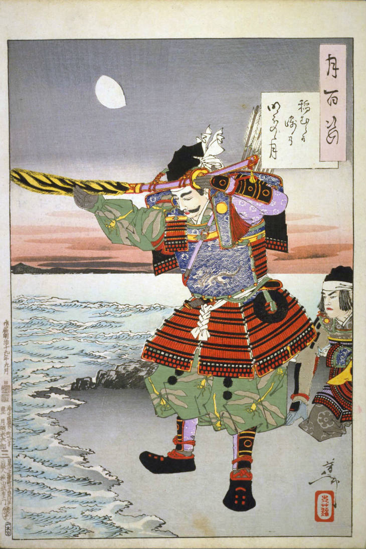 - 和漢の物語や詩歌、謡曲などの月にまつわる場面を題材とした全100点揃物の大判錦絵で、延べ8年を掛けて完結し、1892年・明治25年6月の芳年の死の直後に100作品に目録と序文を添えた画帖が発売された。芳年の代表作の一つと評されています( Wikipedia )。