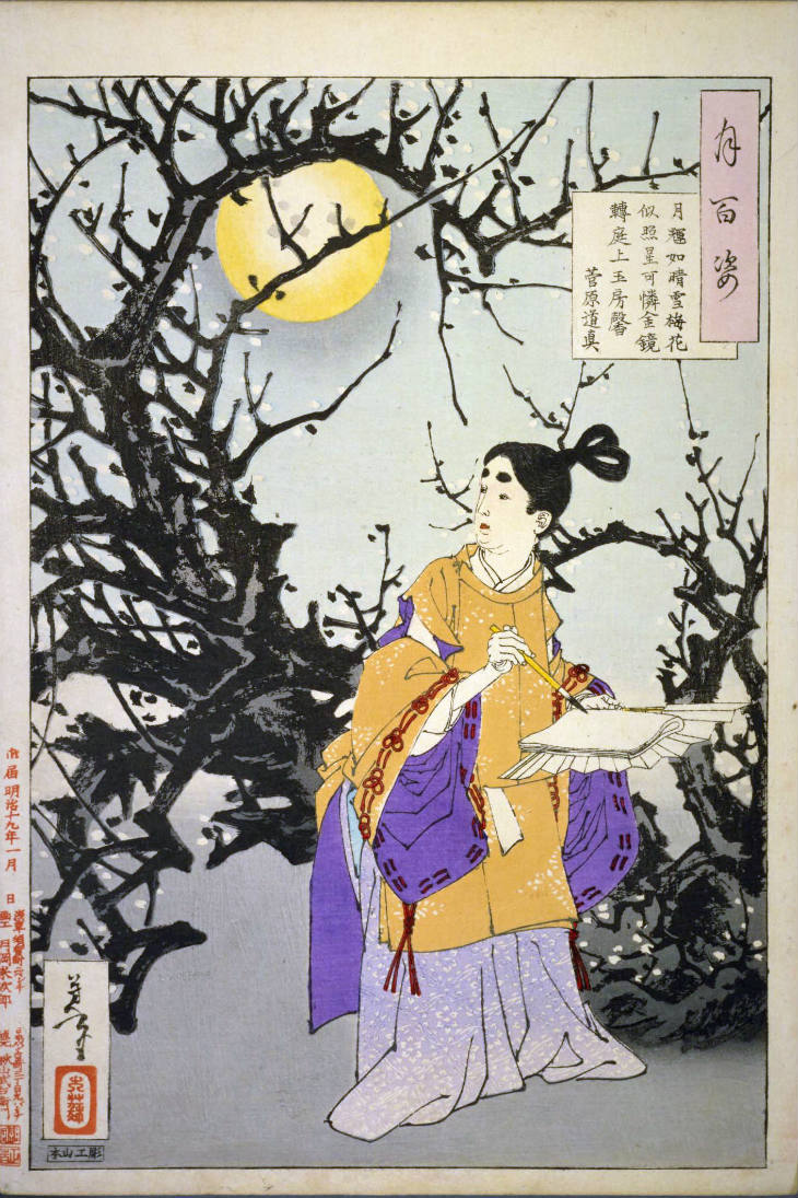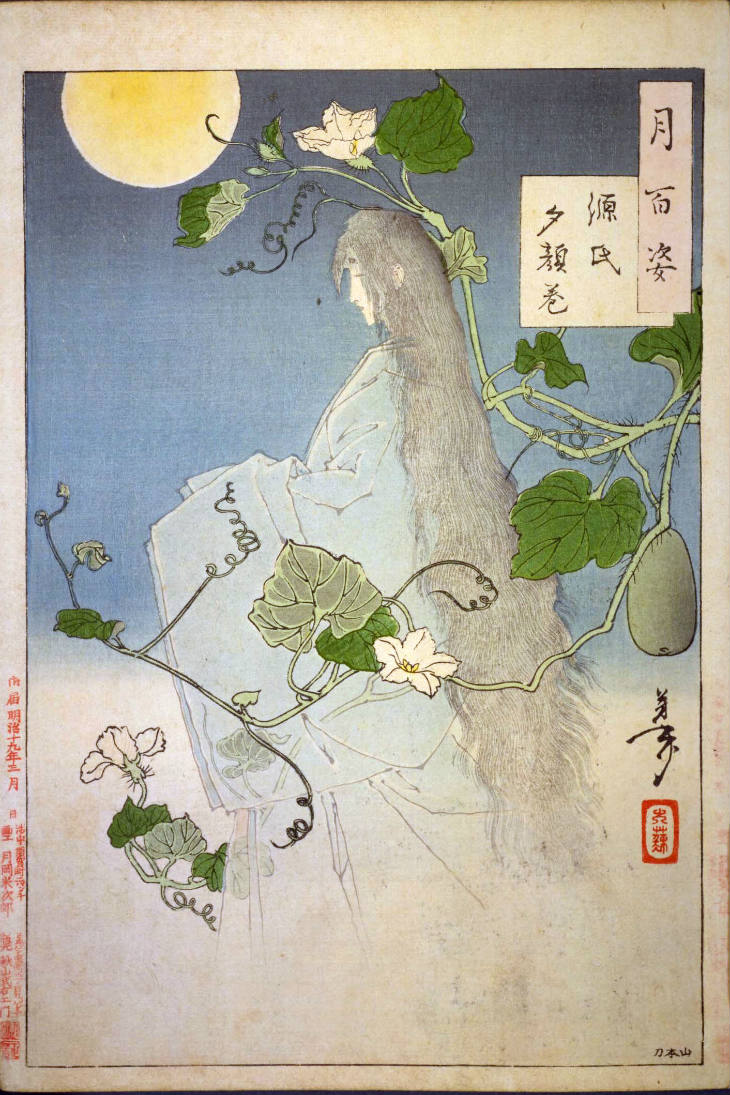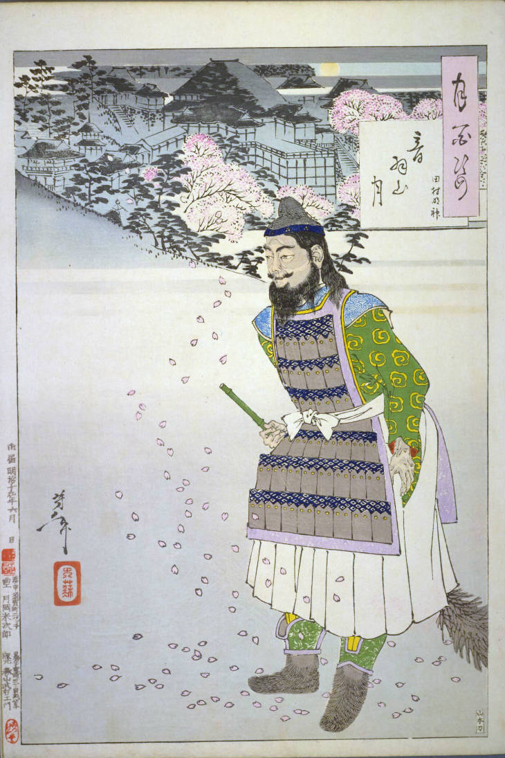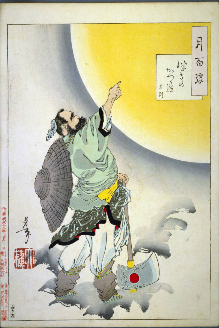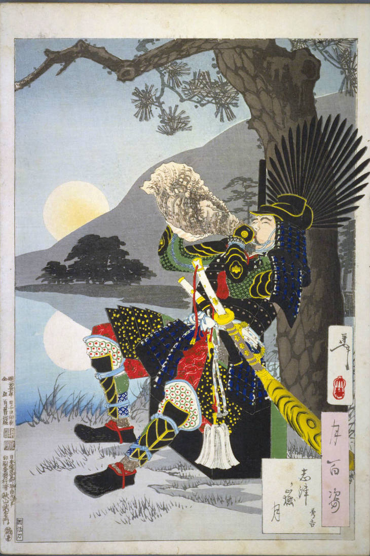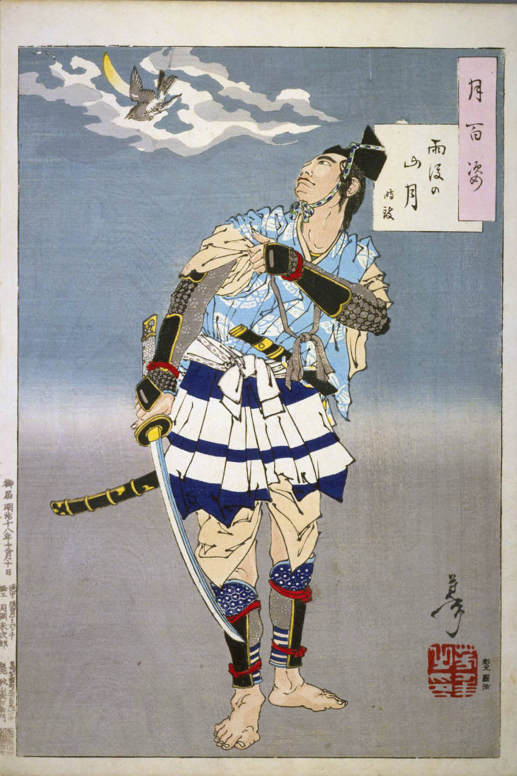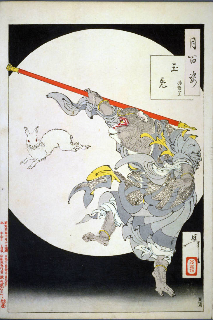 - 和漢の物語や詩歌、謡曲などの月にまつわる場面を題材とした全100点揃物の大判錦絵で、延べ8年を掛けて完結し、1892年・明治25年6月の芳年の死の直後に100作品に目録と序文を添えた画帖が発売された。芳年の代表作の一つと評されています( Wikipedia )。