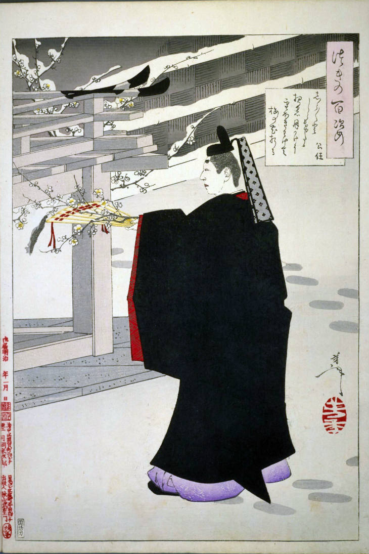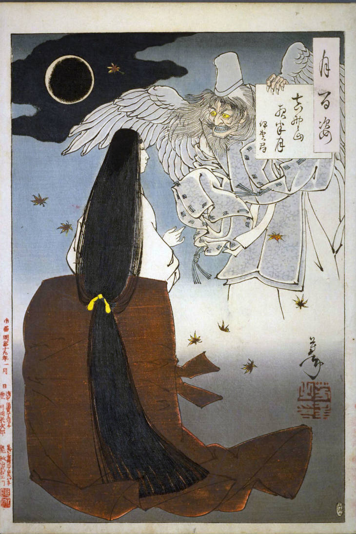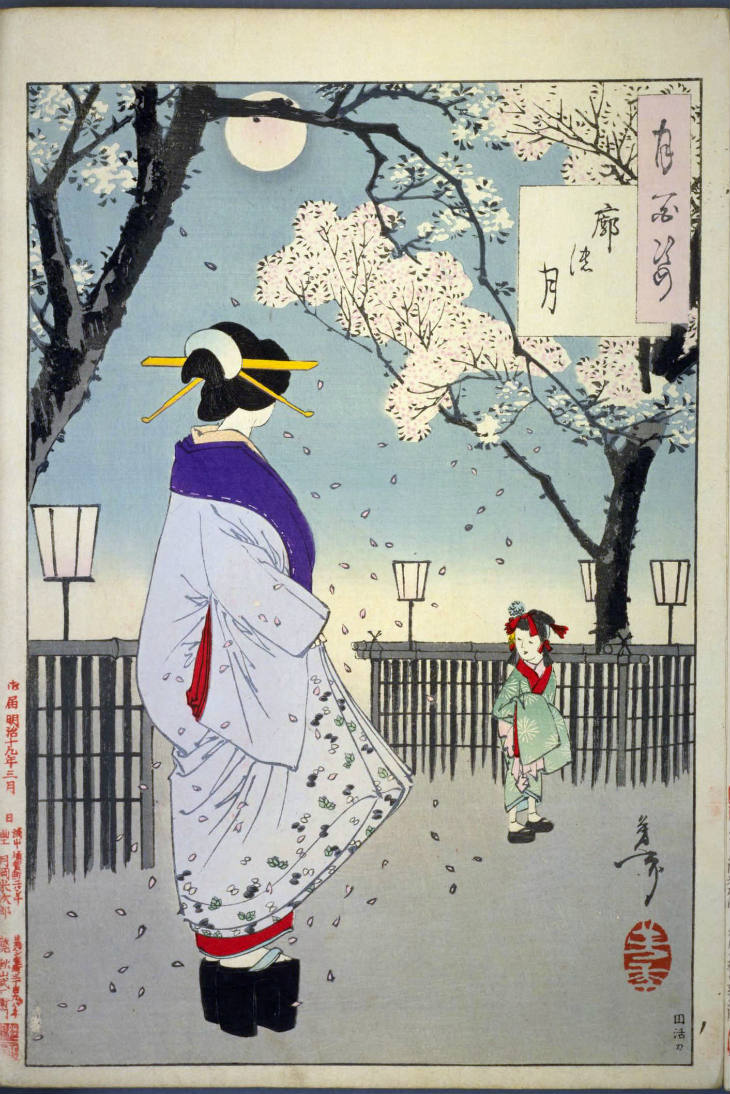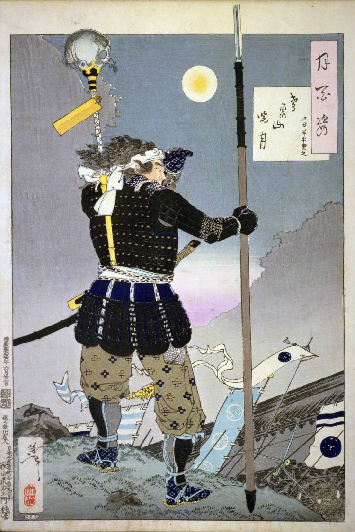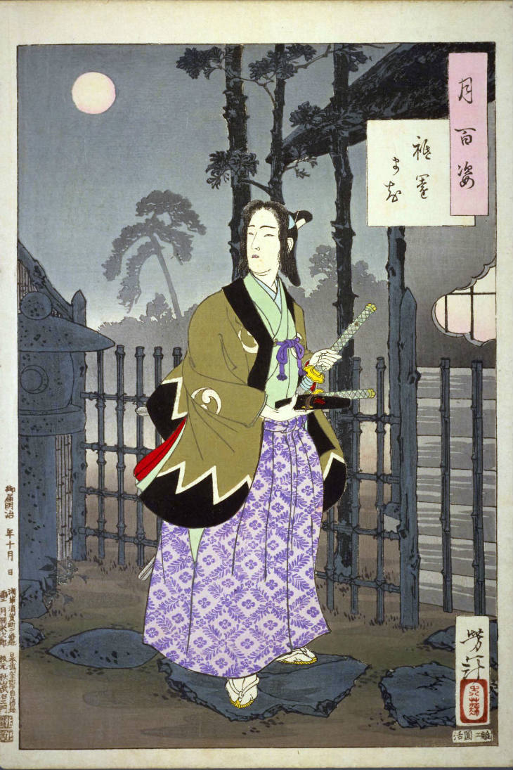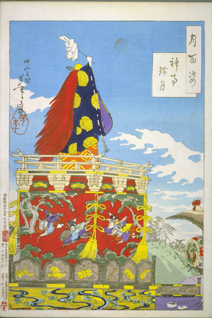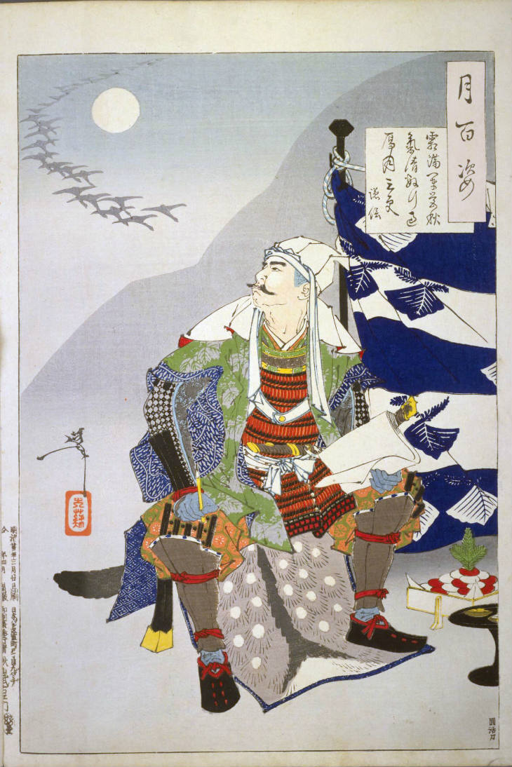 - 和漢の物語や詩歌、謡曲などの月にまつわる場面を題材とした全100点揃物の大判錦絵で、延べ8年を掛けて完結し、1892年・明治25年6月の芳年の死の直後に100作品に目録と序文を添えた画帖が発売された。芳年の代表作の一つと評されています( Wikipedia )。