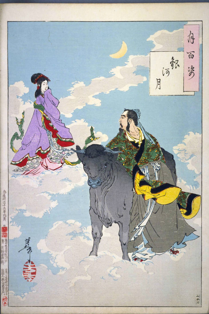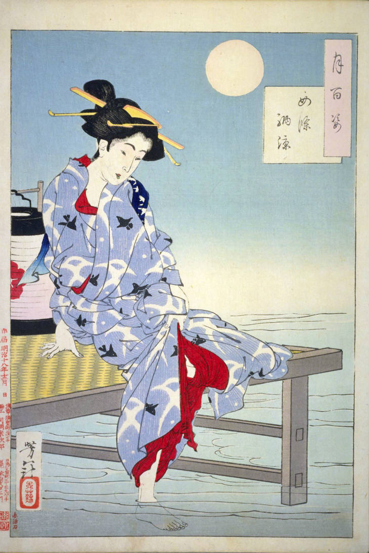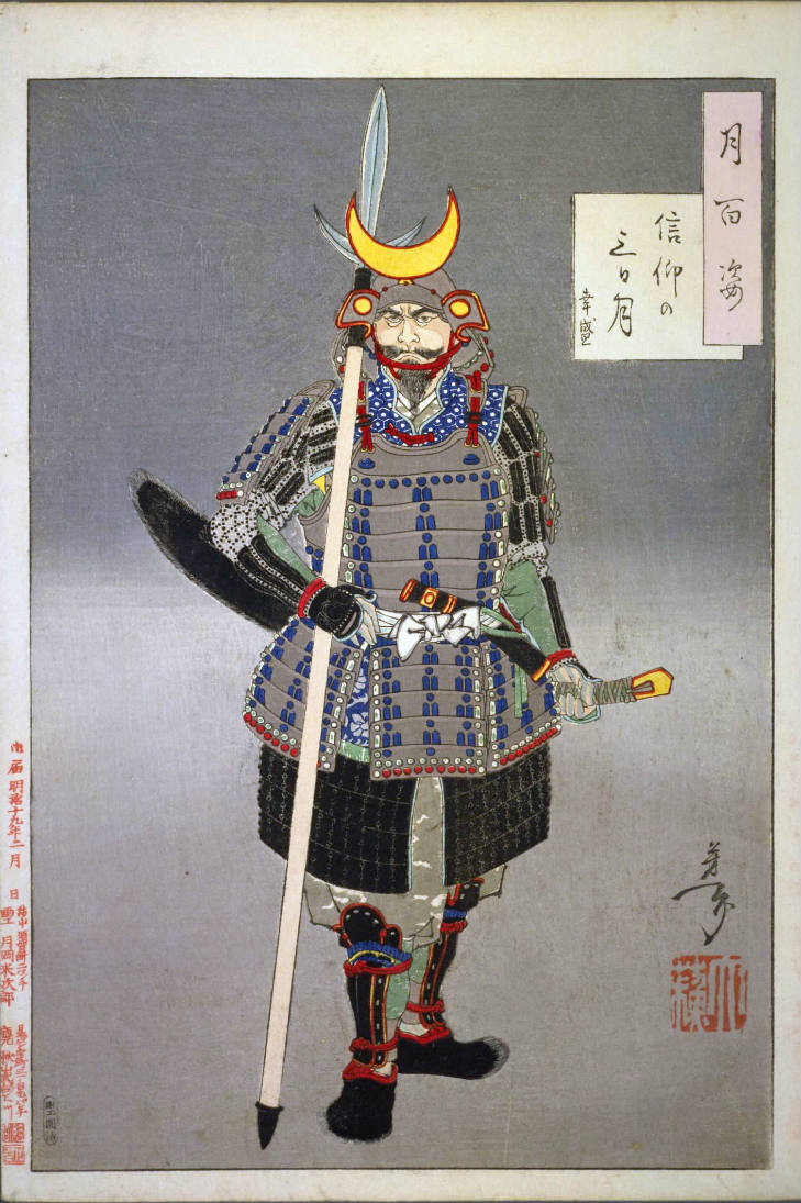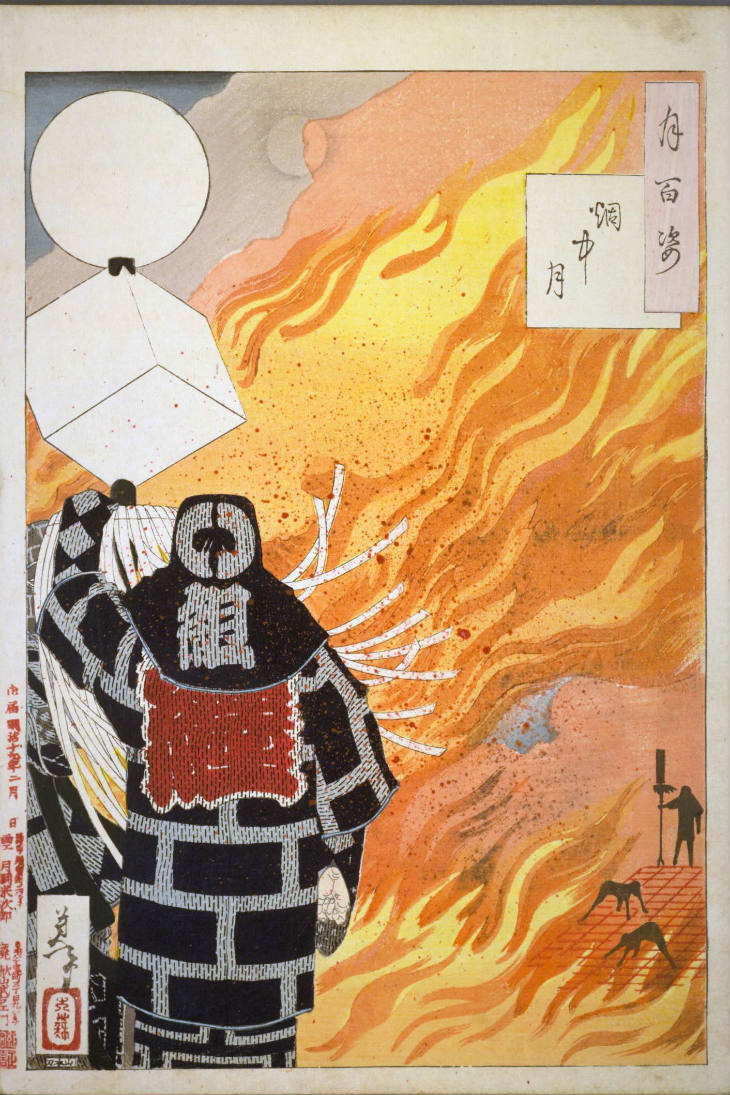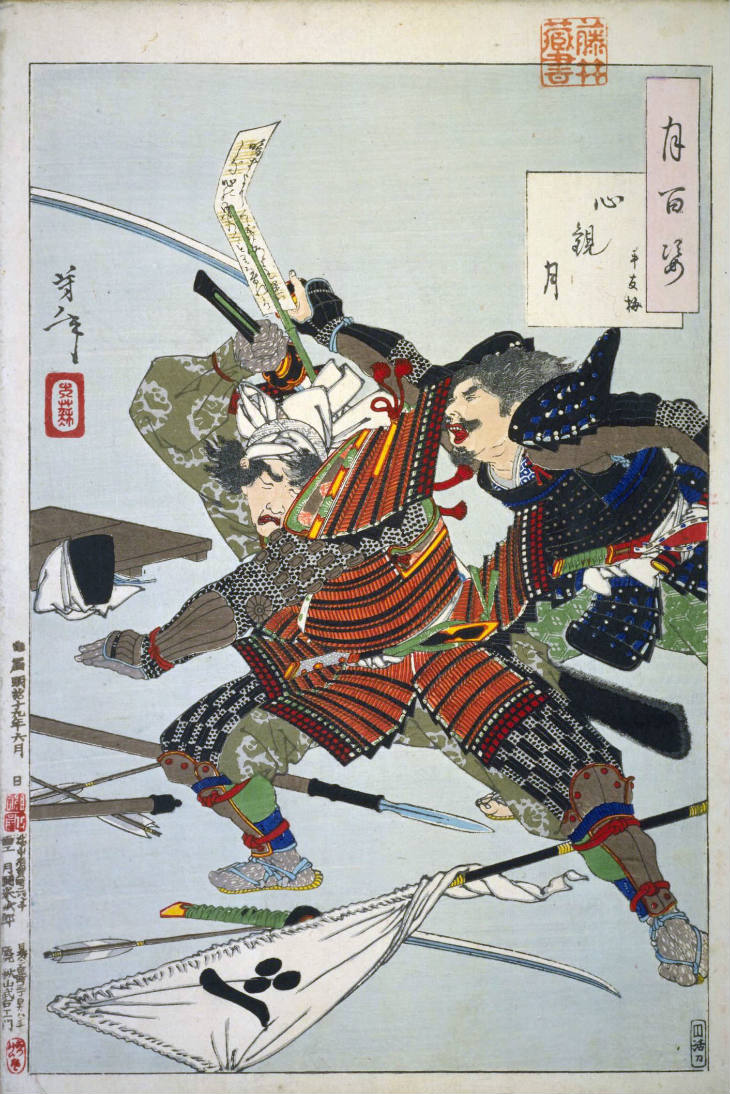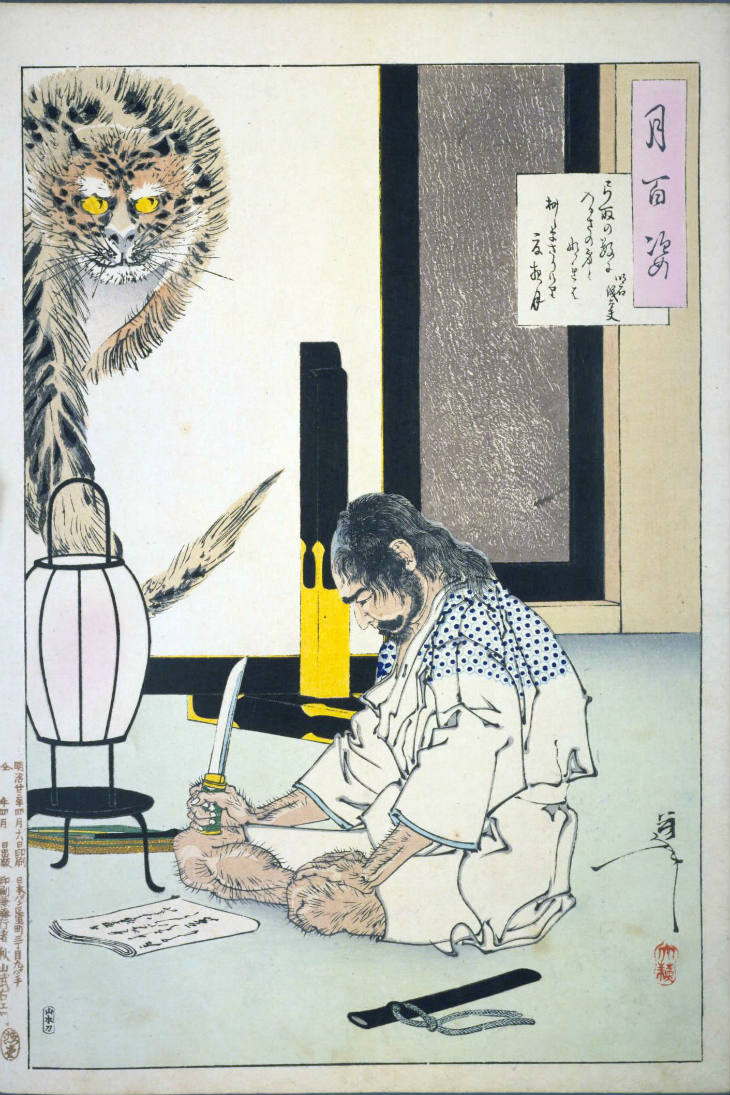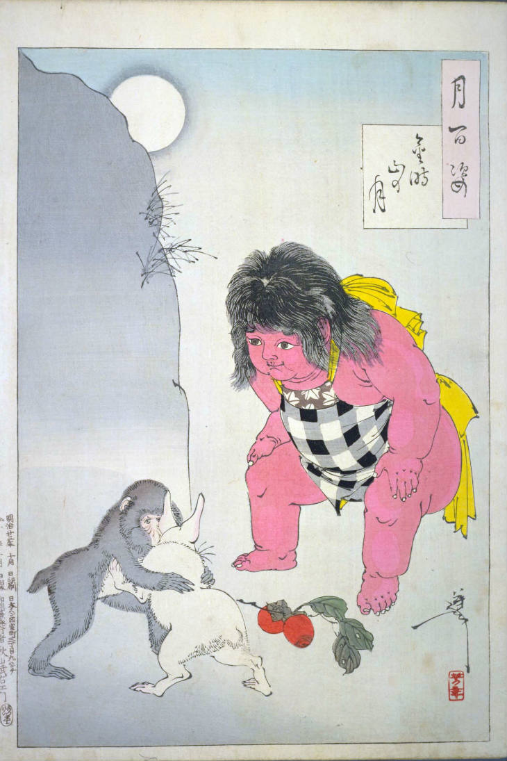- 和漢の物語や詩歌、謡曲などの月にまつわる場面を題材とした全100点揃物の大判錦絵で、延べ8年を掛けて完結し、1892年・明治25年6月の芳年の死の直後に100作品に目録と序文を添えた画帖が発売された。芳年の代表作の一つと評されています( Wikipedia )。