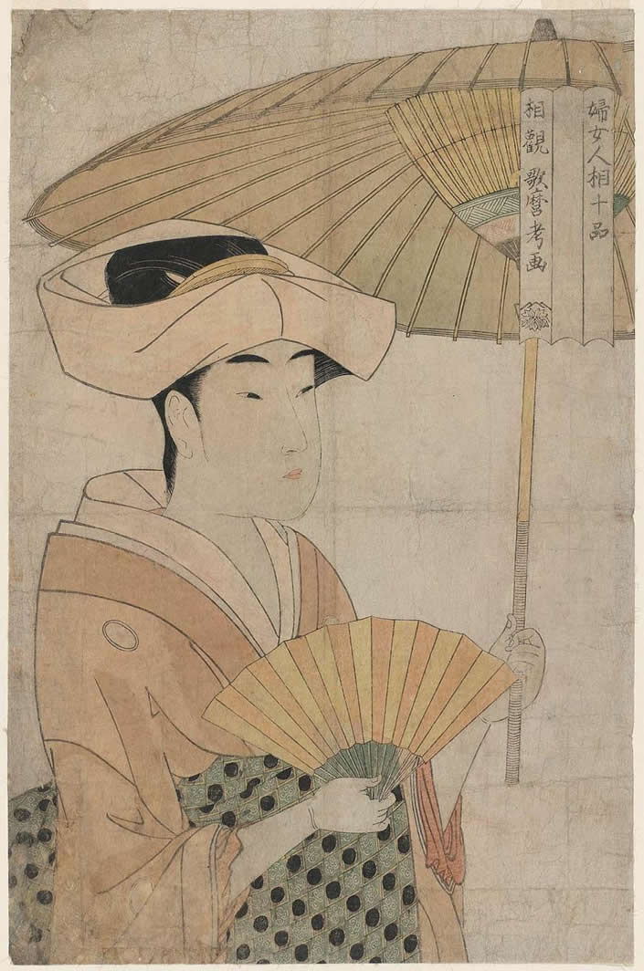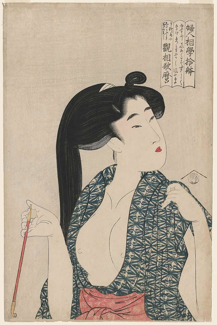 喜多川歌麿 (宝暦3年・1753年頃? - 文化3年・1806年)の『婦人相學十躰 /婦人相學拾躰 』(婦人相学十体)、『婦女人相十品 』。 - ボストン美術館のデータによれば、「婦人相學十躰」は、1792年(寛政4年)– 1793年 (寛政5年) 頃、「婦人相學拾躰」は、1802年(享和2年)– 1803年(享和3年) 頃、「婦女人相十品」は、1792年(寛政4年)– 1793年 (寛政5年) 頃の刊行。