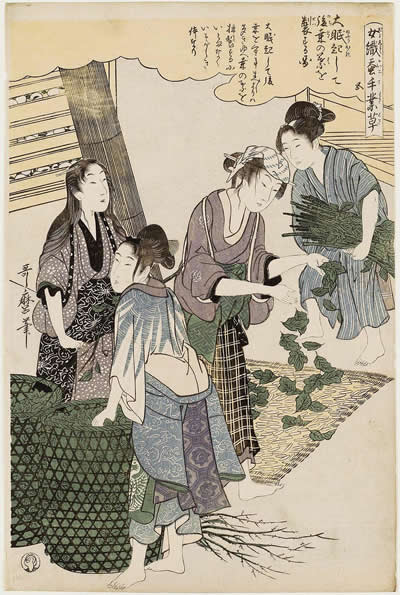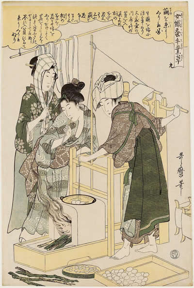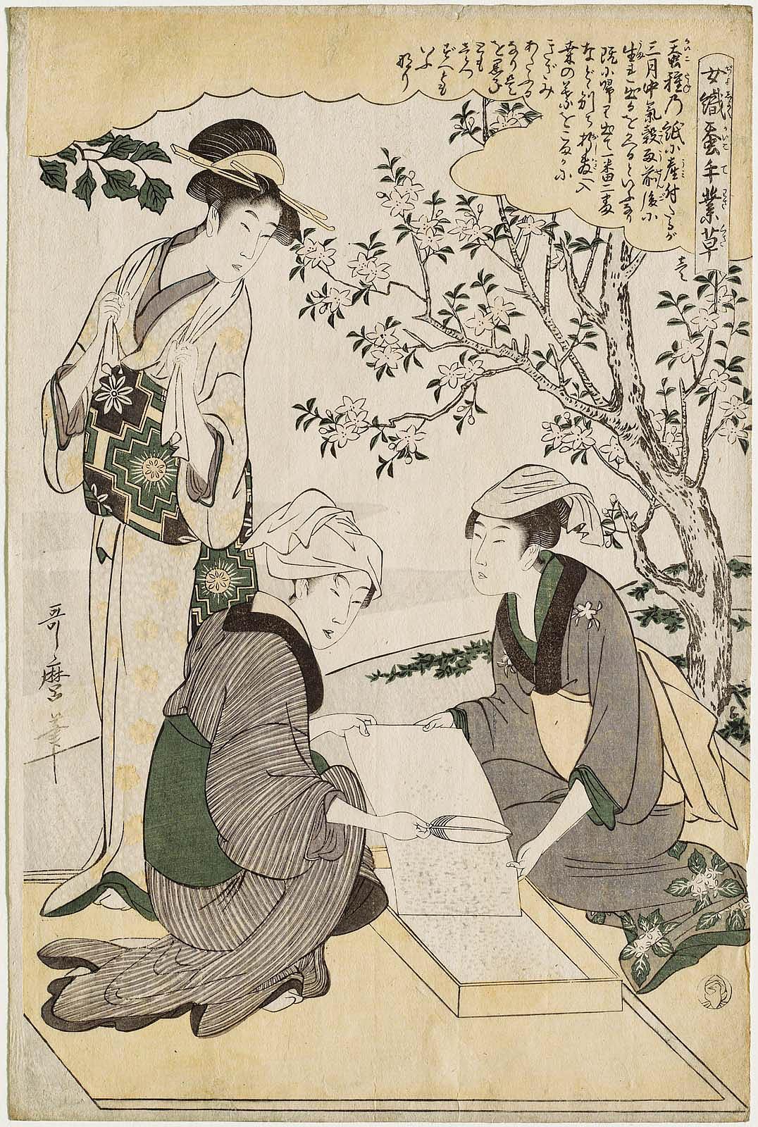 - 蚕(カイコ)を飼い、繭から生糸(絹)を作る養蚕業に勤しむ女性たちの姿は、この歌麿の絵のおよそ30年前の1772年頃にも、勝川春章・北尾重政によって「かゐこやしなひ草」として書かれ、また、歌川重宣(広重二代)、玉川舟調、菊川英山、歌川貞秀、歌川房種、歌川芳員、歌川芳藤、楊洲周延らによっても題材とされている。