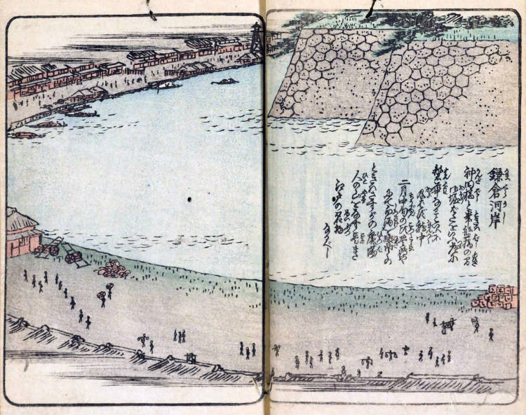 『浮世絵・錦絵』 などを見る「目次」 絵本江戸土産くずし字目次 国会図書館リンク目次 《参考》くずし字一覧 絵本江戸土産(えほんえどみやげ)・くずし字を読む= 鎌倉河岸 = 絵本江戸土産くずし字目次 《鎌倉河岸》 《翻刻》 鎌倉河岸 神田橋と常盤橋の間 御堀ばたをいふ 常に繁華なることいふに及ばず 就中二月中旬の頃 豊島やにて白酒を鬻ぐのときは さすがの廣場 人の山をなす 是また江戸の名物なるべし 《現代表記》 鎌倉河岸(かまくらがし) 神田橋(かんだばし)と常盤橋(ときわばし)の間、お堀ばたをいう。常に繁華(はんか)なるこというに及ばず。就中(なかんづく)二月中旬の頃、豊島屋(としまや)にて白酒(しろざけ)を鬻(ひさ)ぐのときは、さすがの広場(ひろば)、人の山をなす。是(これ)また江戸の名物(めいぶつ)なるべし。 *鬻(ひさ) ぐは、売る、商いをするなどの意。 *豊島屋の白酒は有名で、斎藤月岑の『江戸名所図会』にも「鎌倉町豊島屋酒店 白酒を商ふ図」として紹介される。「例年二月の末 鎌倉町豊島屋の酒店(しゅてん)において雛祭(ひなまつり)の白酒を商ふ 是を求めんとて遠近の輩黎明より 肆前(しせん) に市をなして賑へり」 『江戸名所図会』 鎌倉町豊島屋酒店 白酒を商ふ図 *説明は、などの意。 *万治は、1658年から1661年。 漢字(かな) *この地図の初期設定での中心点は鎌倉河岸付近。初期設定の左の地図は関東平野迅速測図と呼ばれる地図で、明治前期の、明治13年〈1880年〉から明治19年〈1886年〉にかけての関東平野。 地図を拡大 絵本江戸土産くずし字目次