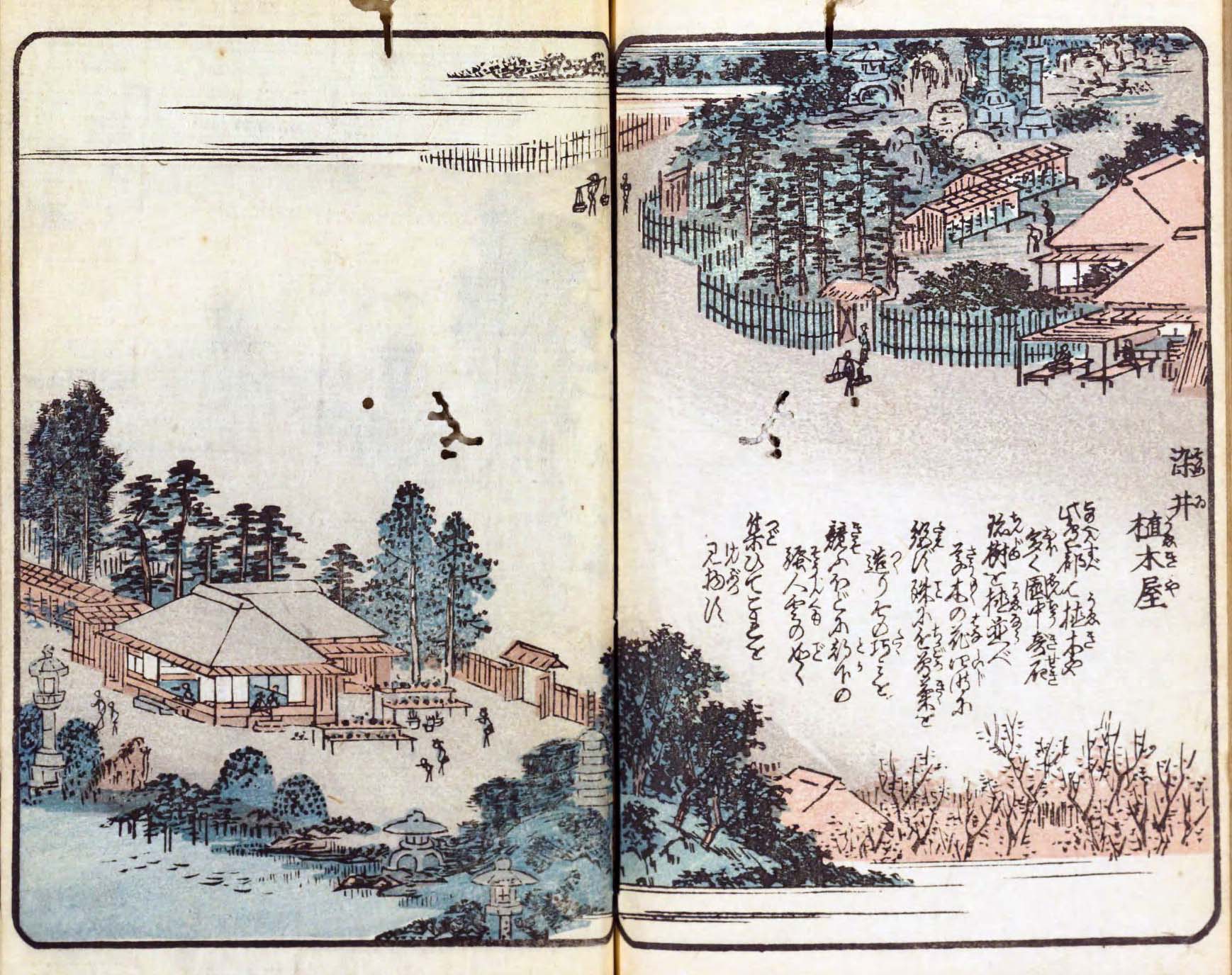 『浮世絵・錦絵』 などを見る「目次」 絵本江戸土産くずし字目次 国会図書館リンク目次 《参考》くずし字一覧 絵本江戸土産(えほんえどみやげ)・くずし字を読む= 染井 植木屋 = 絵本江戸土産くずし字目次 《染井 植木屋》 《翻刻》 染井 植木屋 此辺 都て植木や多く 園中 奇石珍樹を植並べ 草木の花四時に絶えず 殊に近曽菊を造り その巧みを競ふほどに 都下の騒人雲の如く集ひてこれを見物す 《現代表記》 染井(そめい) 植木屋(うえきや) 此辺(このへん)都(すべ)て植木屋(うえきや)多く、園中(えんちゅう)、奇石(きせき)珍樹(ちんじゅ)を植並(うえなら)べ、草木(そうもく)の花(はな)四時(しいじ)に絶えず。殊(こと)に近曽(ちかごろ)菊(きく)を造(つく)り、その巧(たく)みを競(きそ)うほどに、都下(とか)の騒人(そうじん)雲の如く集(つど)いてこれを見物(けんぶつ)す。 *四時(しじ・しいじ)は、四季のこと。 *説明は、などの意。 *万治は、1658年から1661年。 漢字(かな) *この地図の初期設定での中心点は染井付近。初期設定の左の地図は関東平野迅速測図と呼ばれる地図で、明治前期の、明治13年〈1880年〉から明治19年〈1886年〉にかけての関東平野。 地図を拡大 絵本江戸土産くずし字目次