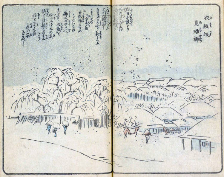 『浮世絵・錦絵』 などを見る「目次」 絵本江戸土産くずし字目次 国会図書館リンク目次 《参考》くずし字一覧 絵本江戸土産(えほんえどみやげ)・くずし字を読む= 衣紋坂 見帰柳 = 絵本江戸土産くずし字目次 《衣紋坂 見帰柳》 《翻刻》 衣紋坂 見帰柳 右 日本堤より西の方へ入れば新吉原町也 その下り口に一本の柳あり これを見返り柳といふ またその下り口を衣紋坂といふ これは この廓へ来る人ここにて衣紋をつくろふゆえの名 柳は後朝この辺より跡を見かへる故の名なるべし 《現代表記》 衣紋坂(えもんざか) 見帰柳(みかえりやなぎ) 右(みぎ)、日本堤(にほんつつみ)より西の方(かた)へ入(い)れば新吉原町(しんよしはらまち)なり。その下り口(おりくち)に一本(ひともと)の柳(やなぎ)あり。これを見返り柳(みかえりやなぎ)という。またその下り口(おりくち)を衣紋坂(えもんさか)という。これは、この廓(さと)へ来(きた)る人ここにて衣紋(えもん)をつくろうゆえの名。柳(やなぎ)は後朝(こうちょう)この辺より跡(あと)を見かえる故の名なるべし。 *後朝(こうちょう)は、恋人同士の別れの朝の意。きぬぎぬ。 *つくろうは、ここでは「整え飾る」の意。 *「つくろふ・つくろう」の漢字、未読。「褒」か。 *跡(あと) は、ここでは「後ろ」の意。 *説明は、などの意。 *万治は、1658年から1661年。 漢字(かな) *この地図の初期設定での中心点は衣紋坂見返り柳付近。初期設定の左の地図は関東平野迅速測図と呼ばれる地図で、明治前期の、明治13年〈1880年〉から明治19年〈1886年〉にかけての関東平野。 地図を拡大 絵本江戸土産くずし字目次