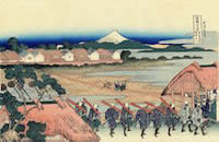 - 富士山を主題として描かれた大判錦絵による風景画揃物で、主板の36図、および好評により追加された10図の計46図。「凱風快晴」(通称:赤富士)や「神奈川沖浪裏」が特に有名。(ここでは、Wikipedia に掲載されている版を利用しています)