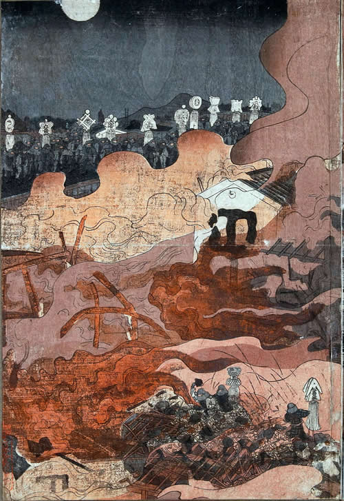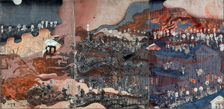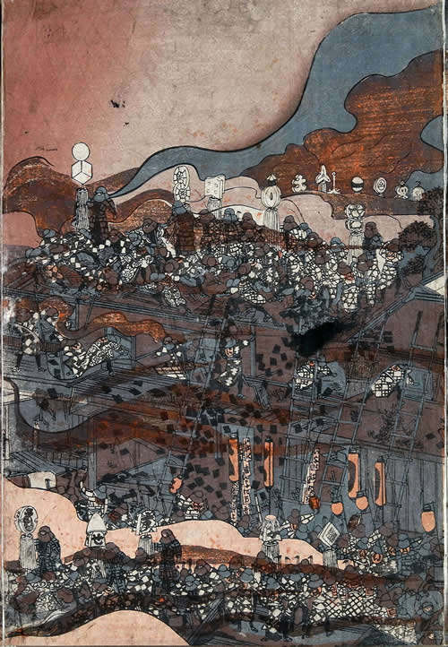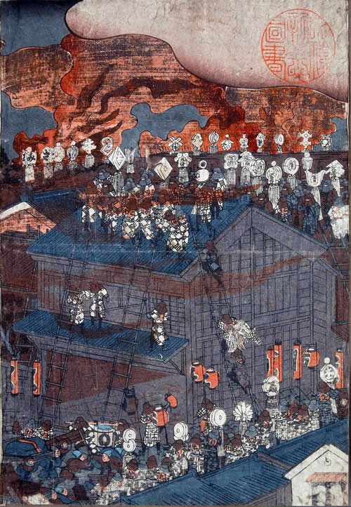 『浮世絵・錦絵』などを見る「目次」 『浮世絵・錦絵』などを見る 江戸の火消(ひけし)・江戸の纏(まとい) 火災消防之図 江戸年間 画像ポップアップ 全画像スライド 「火災消防之図」 東京都立図書館蔵(このページからの転用はできません)。 下の画像をクリックすると、画面サイズに合わせて拡大して見ることができます。 拡大した画面上部の「 ▶ 」をクリックすると全画像をスライドして見ることができます。 絵図は、当サイト独自の色彩補正を行っており、原画とは色調が若干違います。 火災消防之図 [左] [中] [右] 『浮世絵・錦絵』 などを見る「目次」
