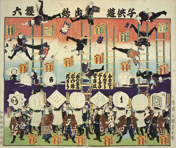 『浮世絵・錦絵』などを見る「目次」 『浮世絵・錦絵』などを見る 江戸の火消(ひけし)・江戸の纏(まとい) 子供遊出始双六月岡芳年(つきおかよしとし) 慶応元年・1865年 月岡芳年(つきおかよしとし) の、「子供遊出始双六」。 慶応元年〈1865年〉の作品。 東京都立図書館蔵(このページからの転用はできません)。 下の画像をクリックすると、画面サイズに合わせて拡大して見ることができます。 子供遊出始双六月岡芳年(つきおかよしとし) 『浮世絵・錦絵』 などを見る「目次」