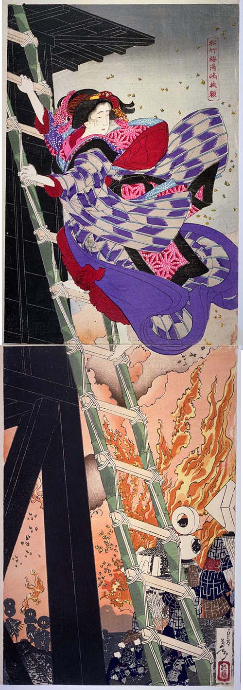 - 江戸時代前期、江戸本郷の八百屋の娘で、恋人に会いたい一心で放火事件を起こしたとされる少女の八百屋お七(やおやおしち)を描く。火の見櫓に登り半鐘を打ち鳴らそうとす場面。
