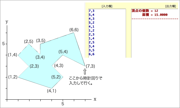 【 計算をする 】 多角形の面積を計算する Polygon ■ 多角形の面積計算機の使い方 ■ 下の図に倣って、下の計算機の「入力欄」に、 全ての頂点の x ,y 座標を、x と y を半角カンマ [ , ] か半角スペースで区切り、時計回りに一行に一座標ずつ入力してください。 ■ 多角形の面積計算機 ■ [入力欄] 7,3 5,4 4,3 5,2 4,1 1,2 2,3 1,4 2,5 3,4 3,5 6,6 [出力欄] ・使用しているスクリプトの特性から、特に少数点以下の計算結果に誤差が出る場合があるようです。参考としてご覧ください。 90種類を超す各種計算がある『目次』へ