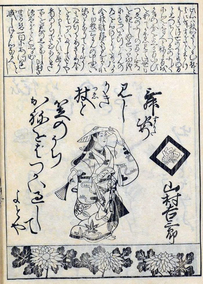 このページは、江戸時代の「万治(1658〜)」から、「寛文」「延宝」「天和」「貞享」「元禄(〜1704)」までの人気歌舞伎役者100人の評判記として、元禄6年に出版された「古今四場居百人一首」(後に「古今四場居色競」と改題)と、その118年後の文化8年に、それを模写し引用した「江都花歌舞伎年代記」に載った役者絵とその絵に添えられた家紋を紹介するものです。