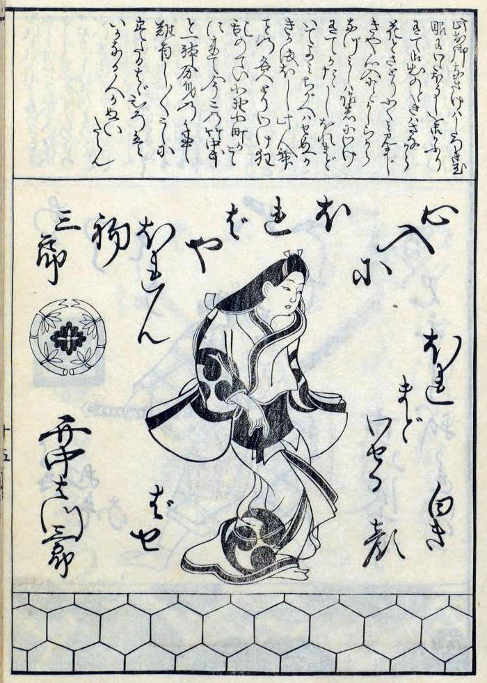 このページは、江戸時代の「万治(1658〜)」から、「寛文」「延宝」「天和」「貞享」「元禄(〜1704)」までの人気歌舞伎役者100人の評判記として、元禄6年に出版された「古今四場居百人一首」(後に「古今四場居色競」と改題)と、その118年後の文化8年に、それを模写し引用した「江都花歌舞伎年代記」に載った役者絵とその絵に添えられた家紋を紹介するものです。