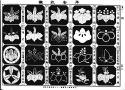 いろは引きでの紋章の他に、神社仏閣、加賀紋、藍鏡色紋、伊達紋、全國都市マーク、歌謡音曲家の紋、香の図、角字印譜、ローマ字、時代颪文字及体字、染小紋型模様、紋・割方法など 4,000 を超すデータが収載されています。
